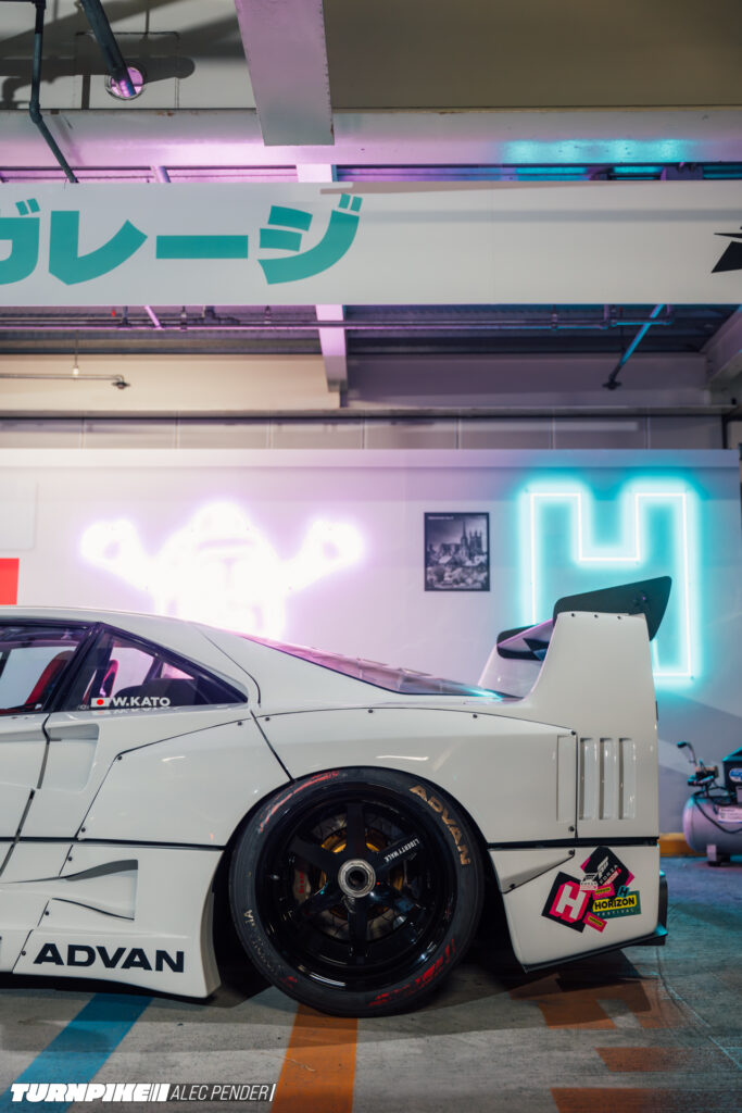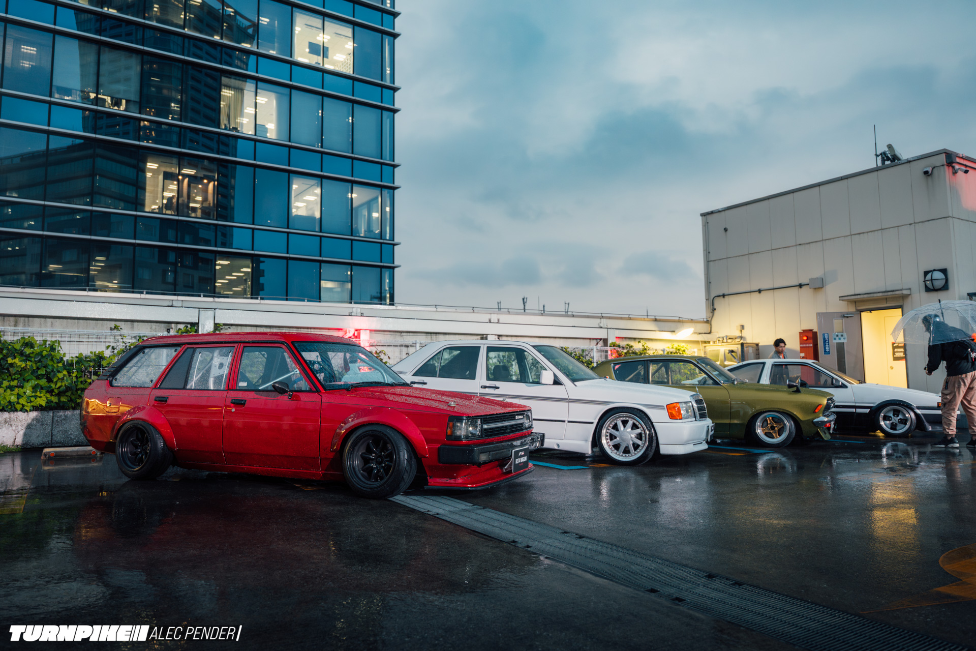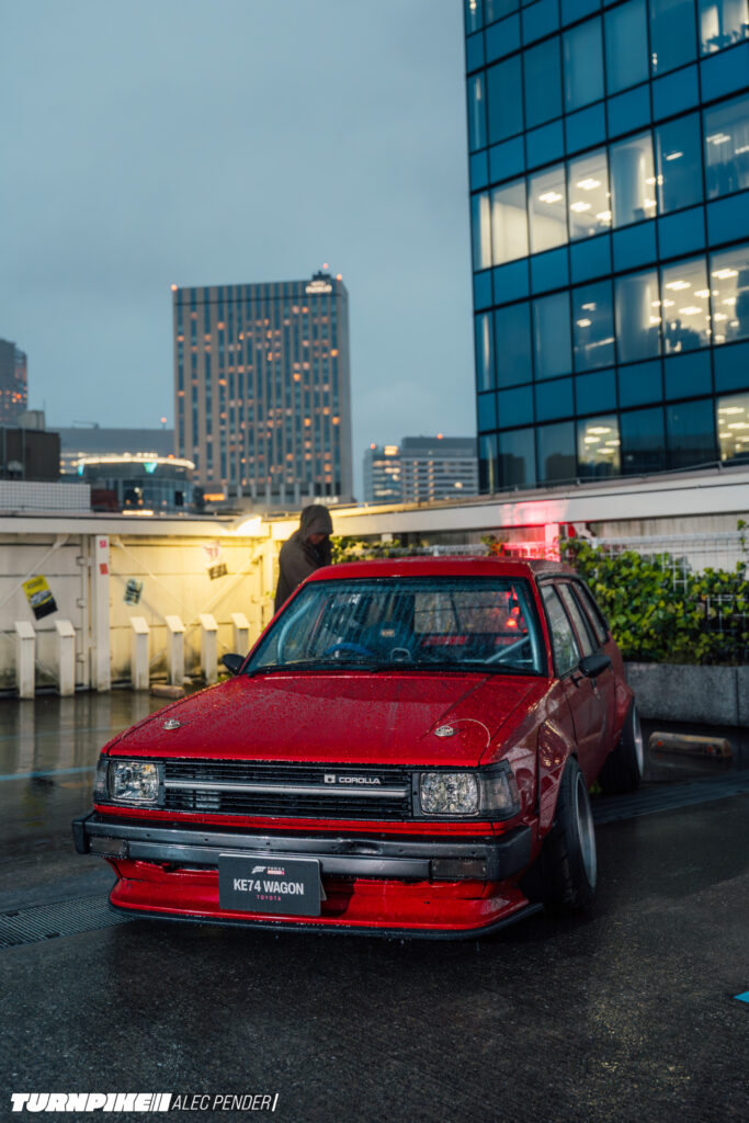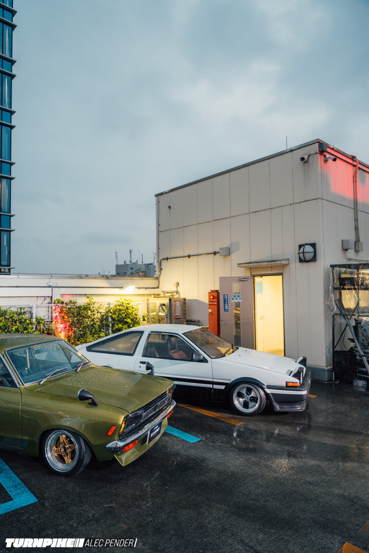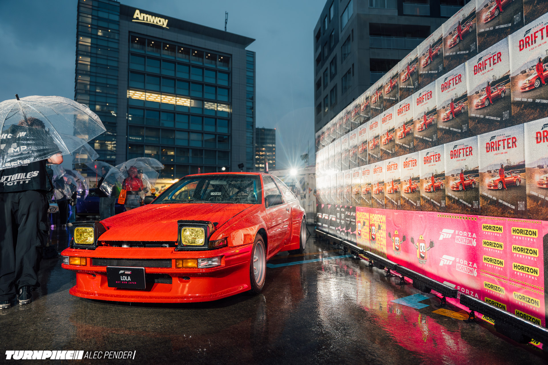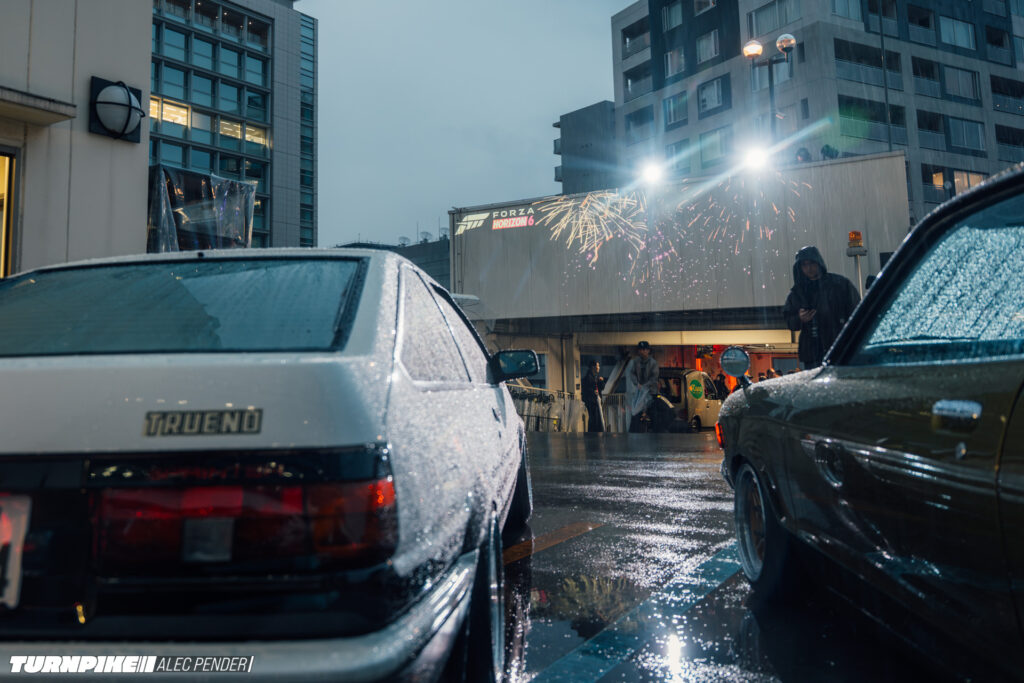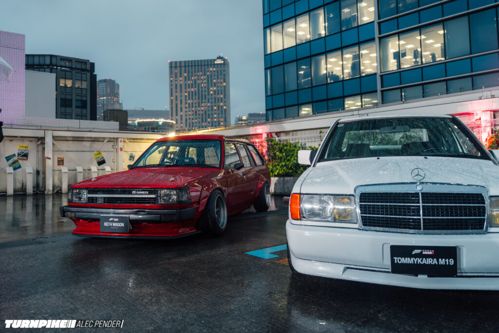 The party was also a great way for the Forza team to introduce the game to key people in both the car and gaming worlds. Alec and I added to that by stepping up to select nine cars to represent Japanese car culture, alongside my RWB Porsche 964. The lineup ranged from wide-body RX-7s and an over-fendered Honda NSX on air, to classics like an AE86 Trueno, a drift-spec Corolla wagon, and a Datsun 210 previously featured on Turnpike. Tying it all together was a rare Tommykaira M19, a complete car that the Kyoto-based builder created in the late ‘80s before it got busy building its Nissan based line up.