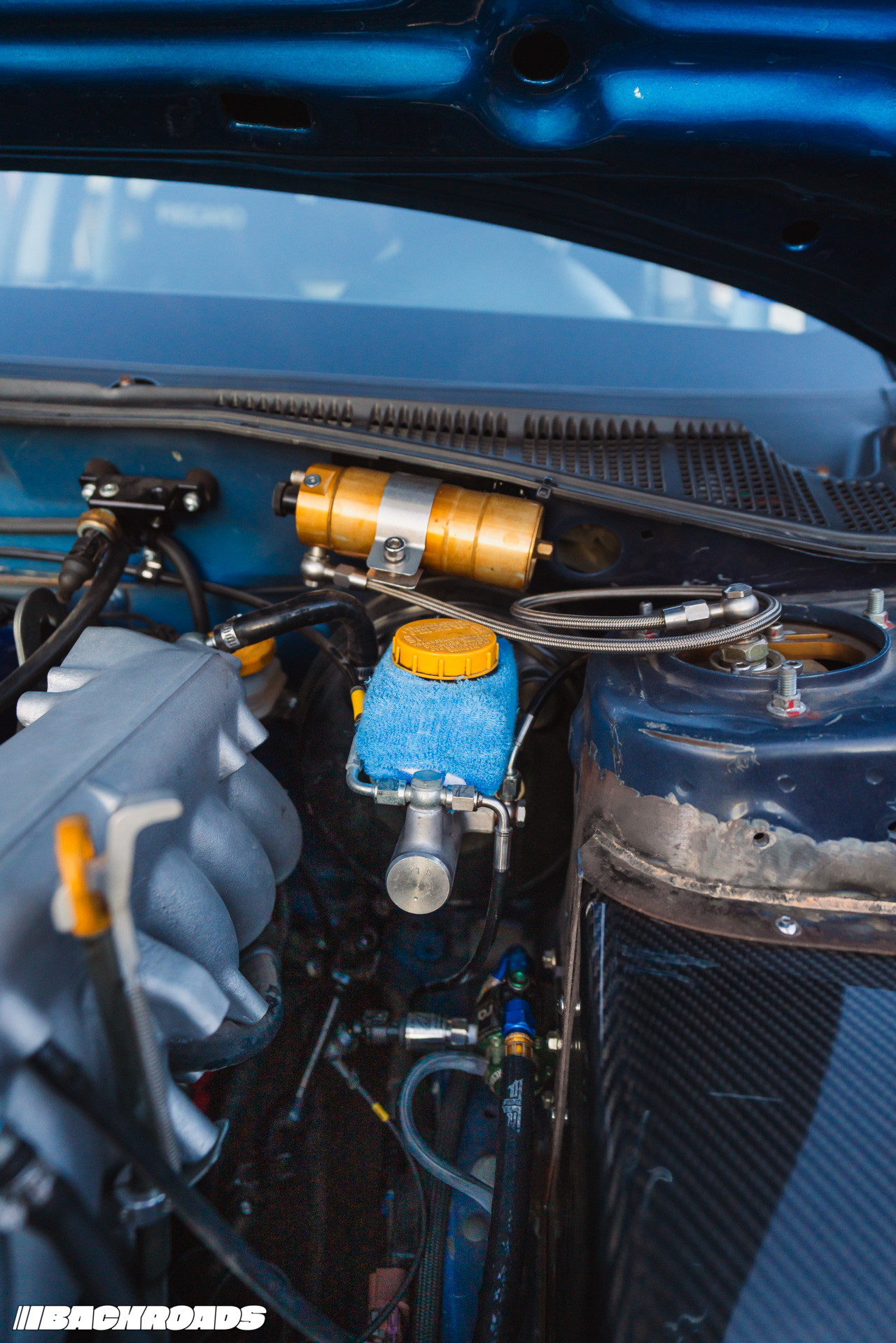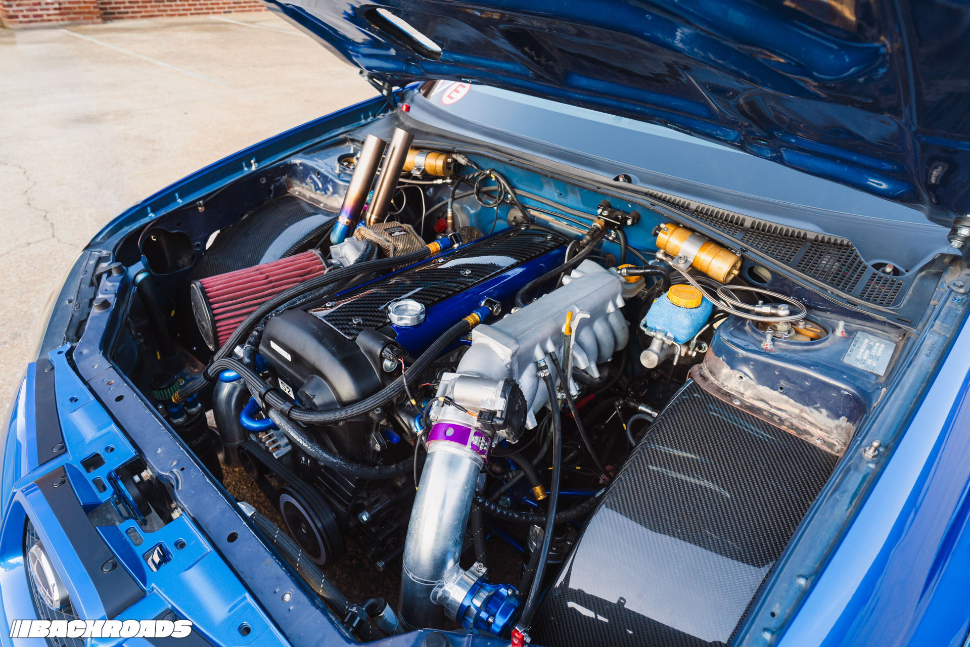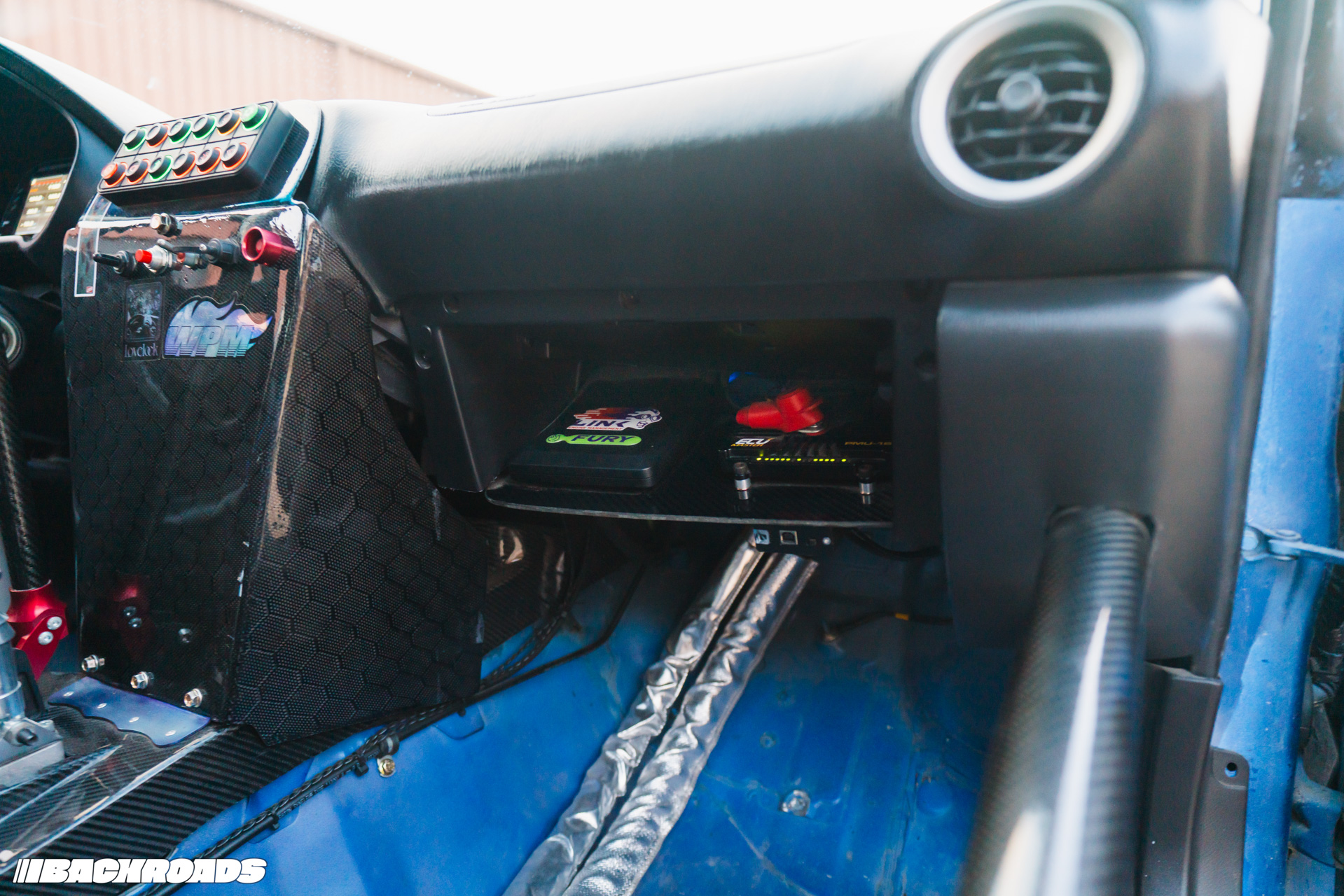 For additional safety, he installed a fire suppression system with a Lifeline Zero 360 system; hardlines going to both the hot side of the engine and fuel cell in case of a mishap. Last but not least, fixed-back Recaros keep him snug when sliding through corners.