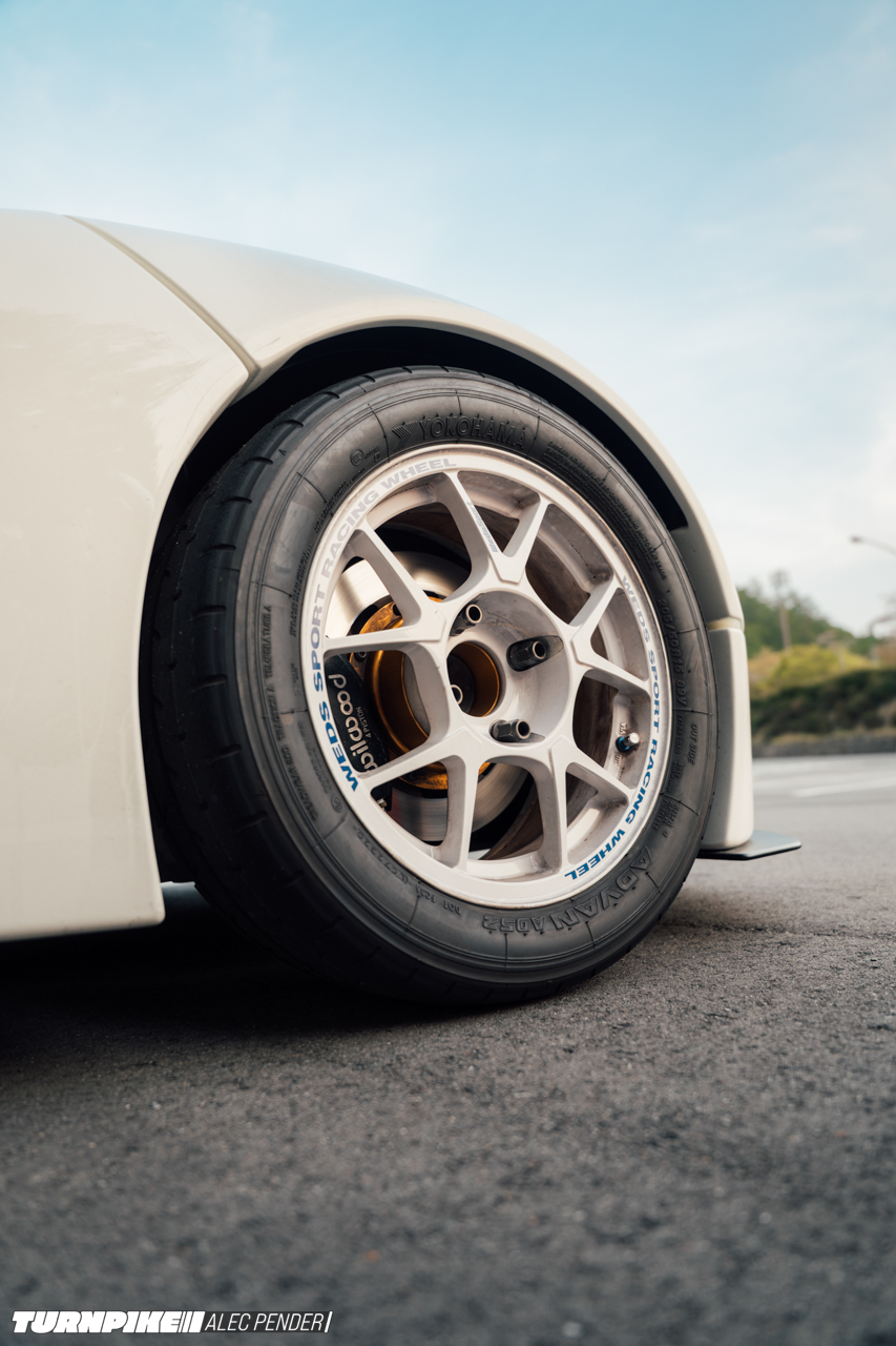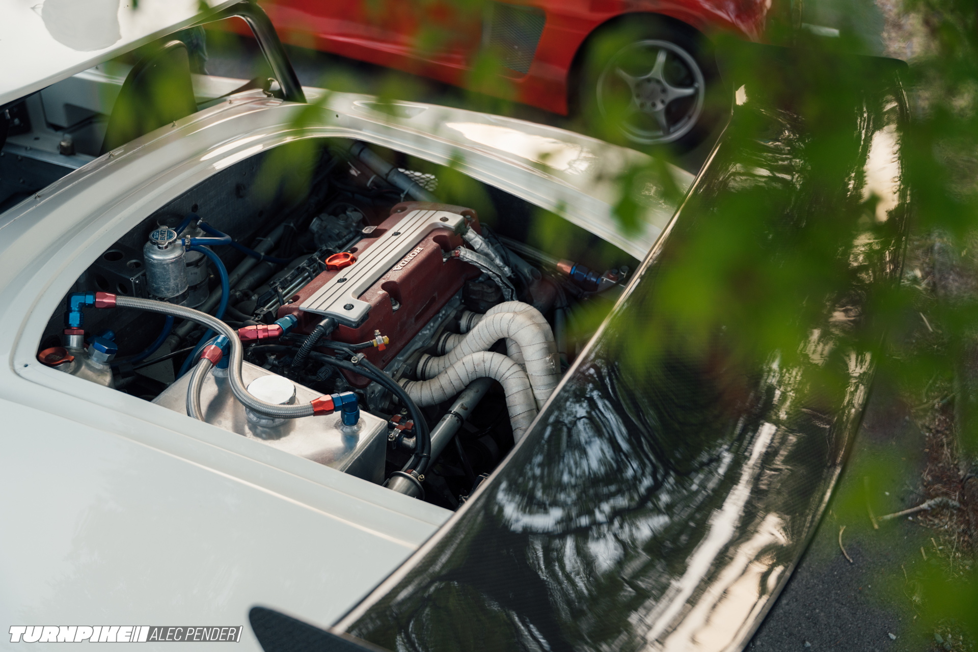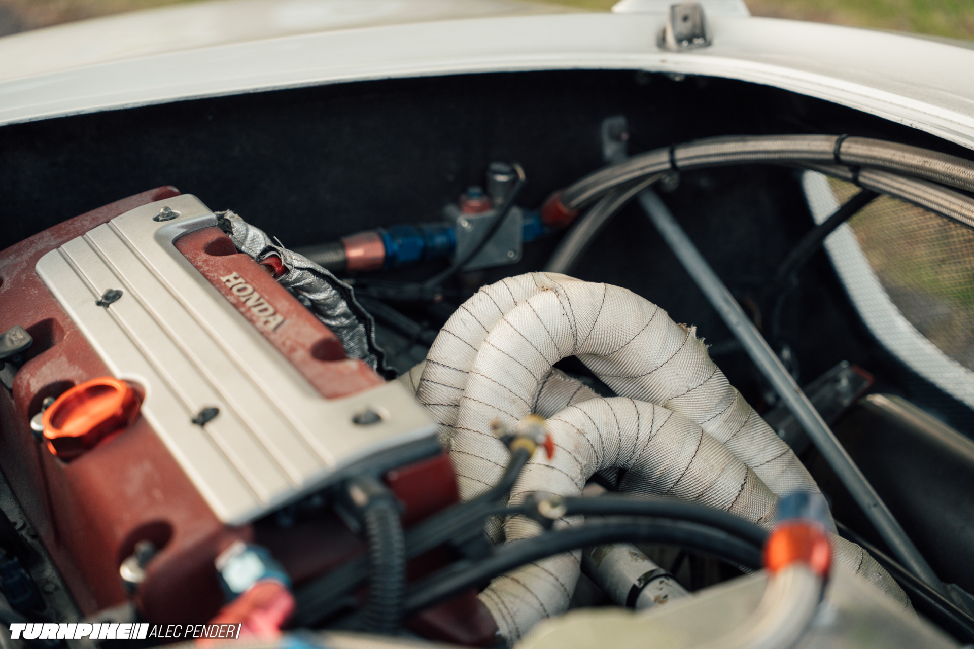 Next we hop in the white Honda K-swapped car following behind. This example hides a dry sumped K20 engine, a pretty noticeable jump in punch from the standard SR. Yet even with the extra power, the chassis doesn’t lose its calm. The white car is more track oriented: a Stack dash in front of you, and a shifter level to that. The brakes follow suit with a full Wildwood setup all around.