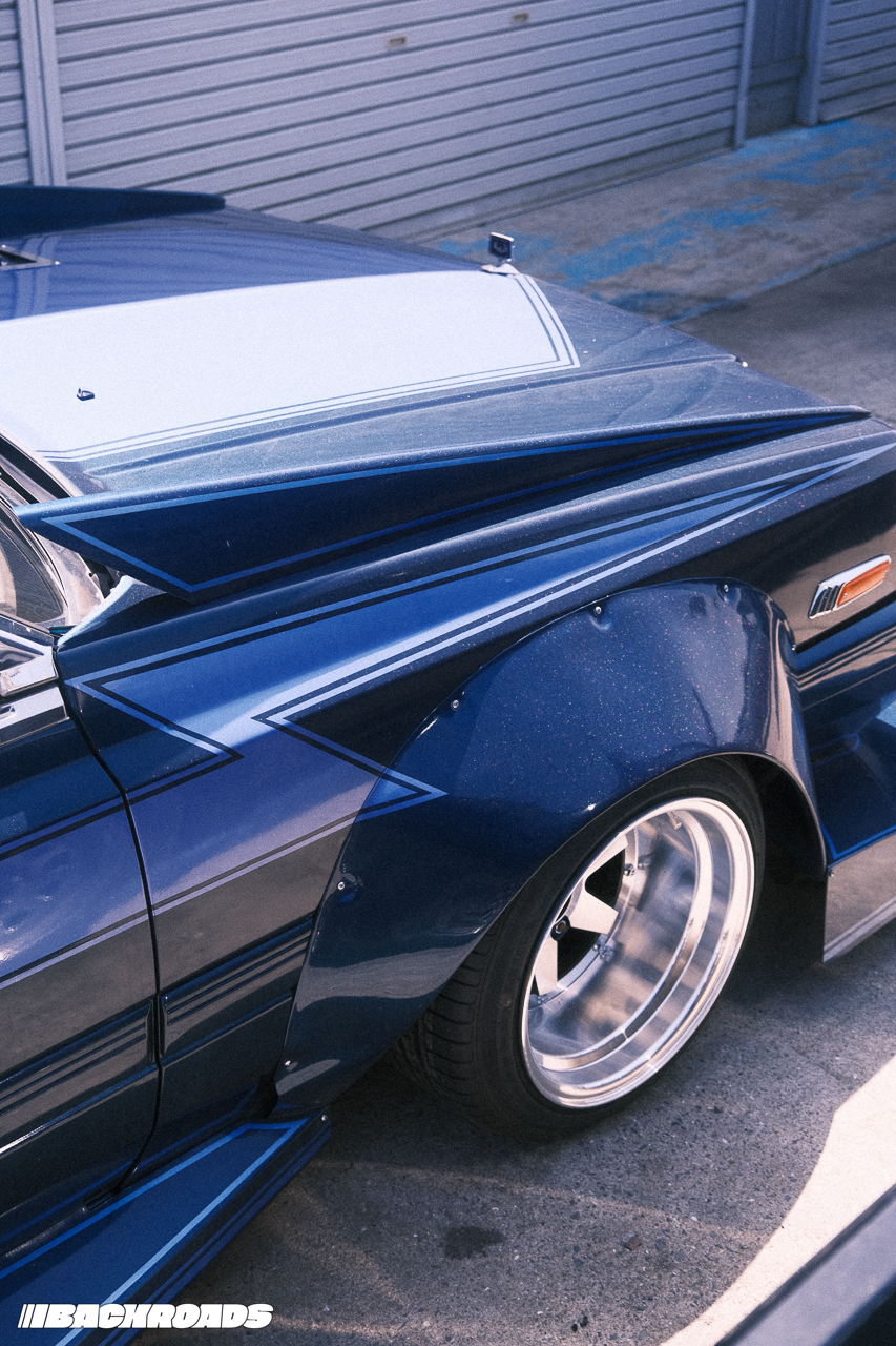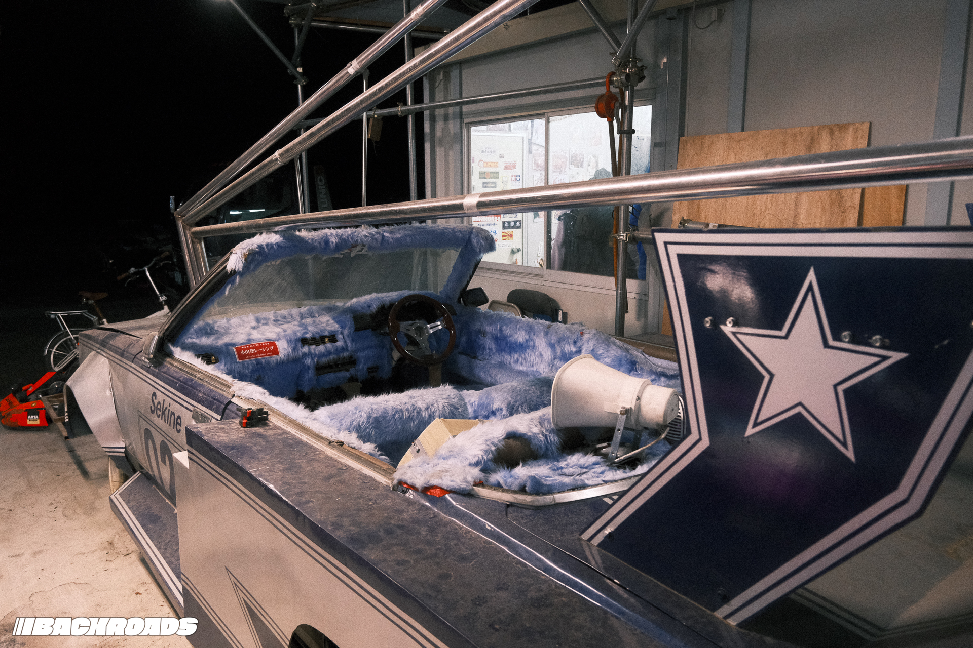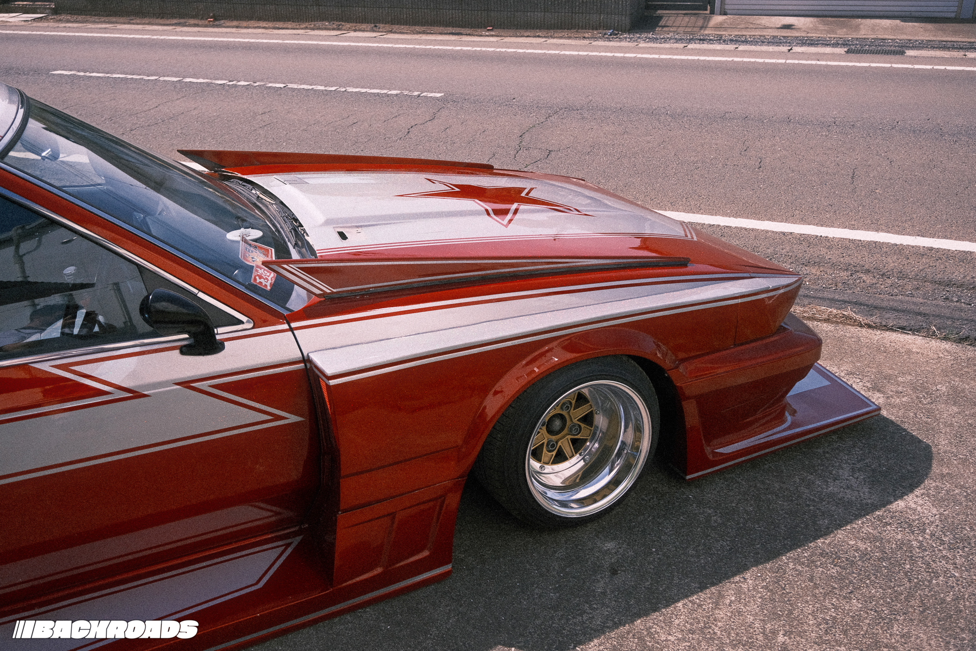 The term ‘Chibaragi’ is a portmanteau of two prefectures on Tokyo’s outskirts: Chiba to the southeast and Ibaraki to the northeast. Cars from these regions have a signature look, often painted in metallic two-tone schemes accented with sharp lines, stars, or lightning motifs. This stands in contrast to the bold, primary colors more typical of Fukuoka’s kaidō racers.