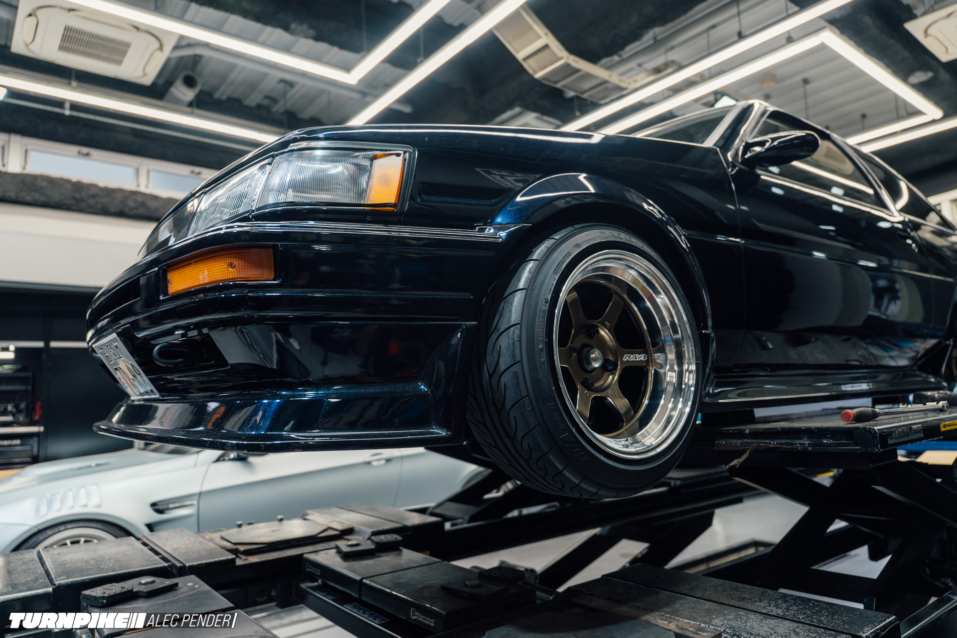 Working alongside J Beat Custom Shop, a well-regarded bodywork outfit in Saitama, we decided on a new exterior colour. Having a black AE86 was always a dream of mine, so with that and the addition of some blue pearl, the respray was finalised. After adding in a few Yahoo! Auction Japan pickups and some paint thinner to remove the spray-can gold wheel finish, the Levin was refreshed.