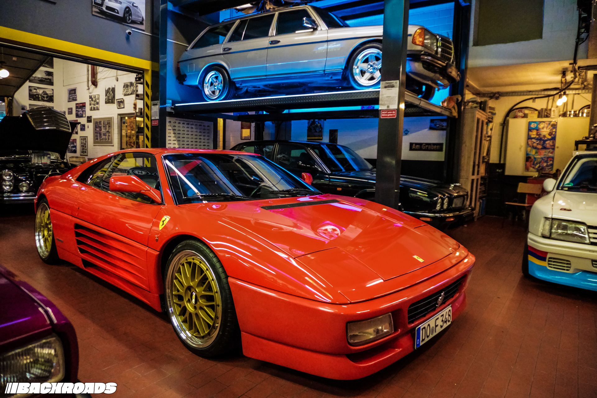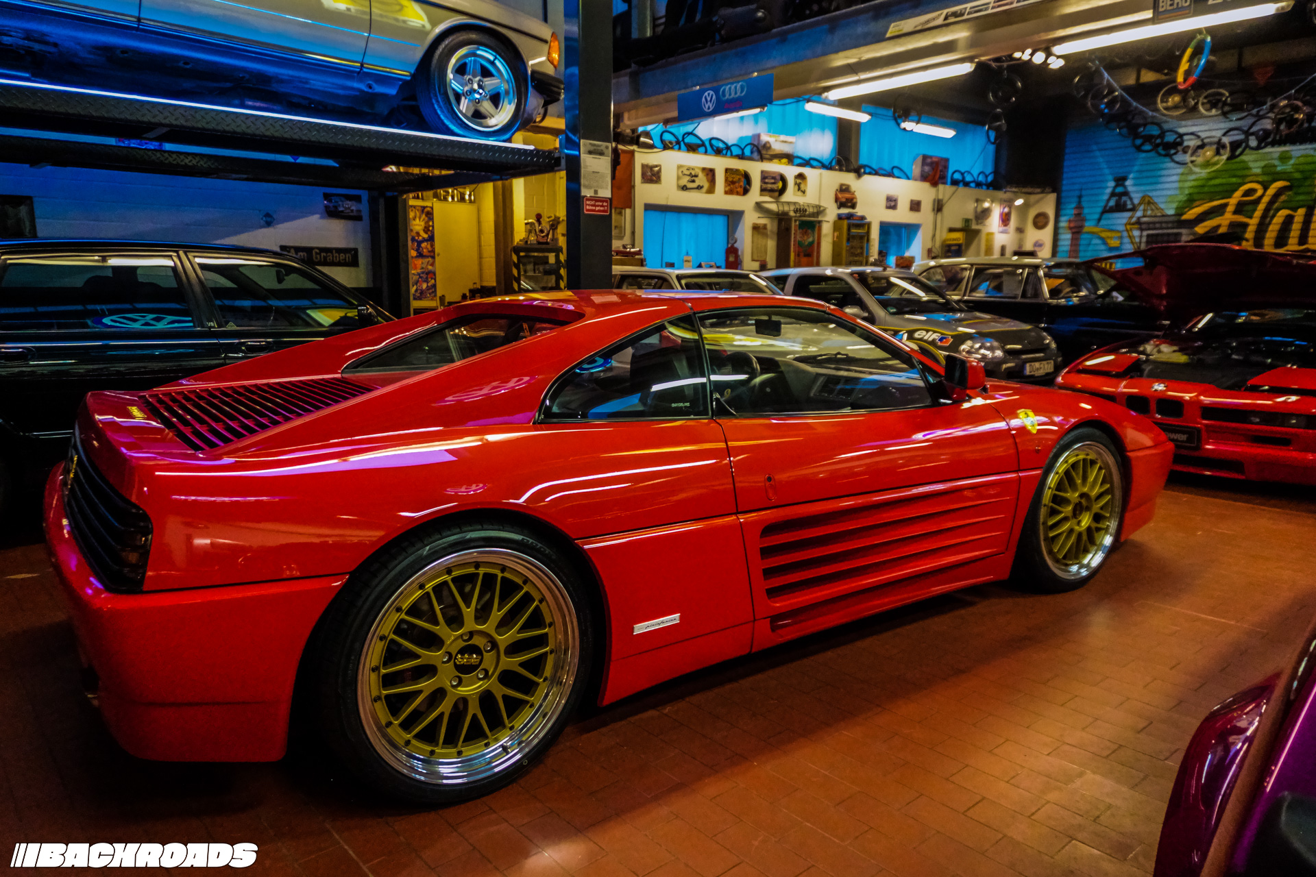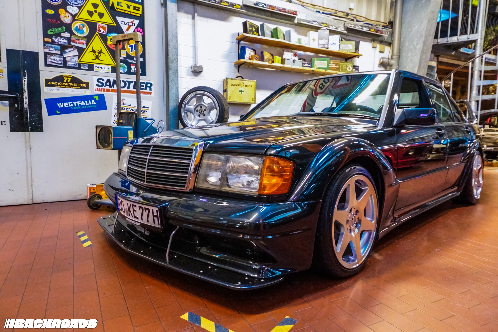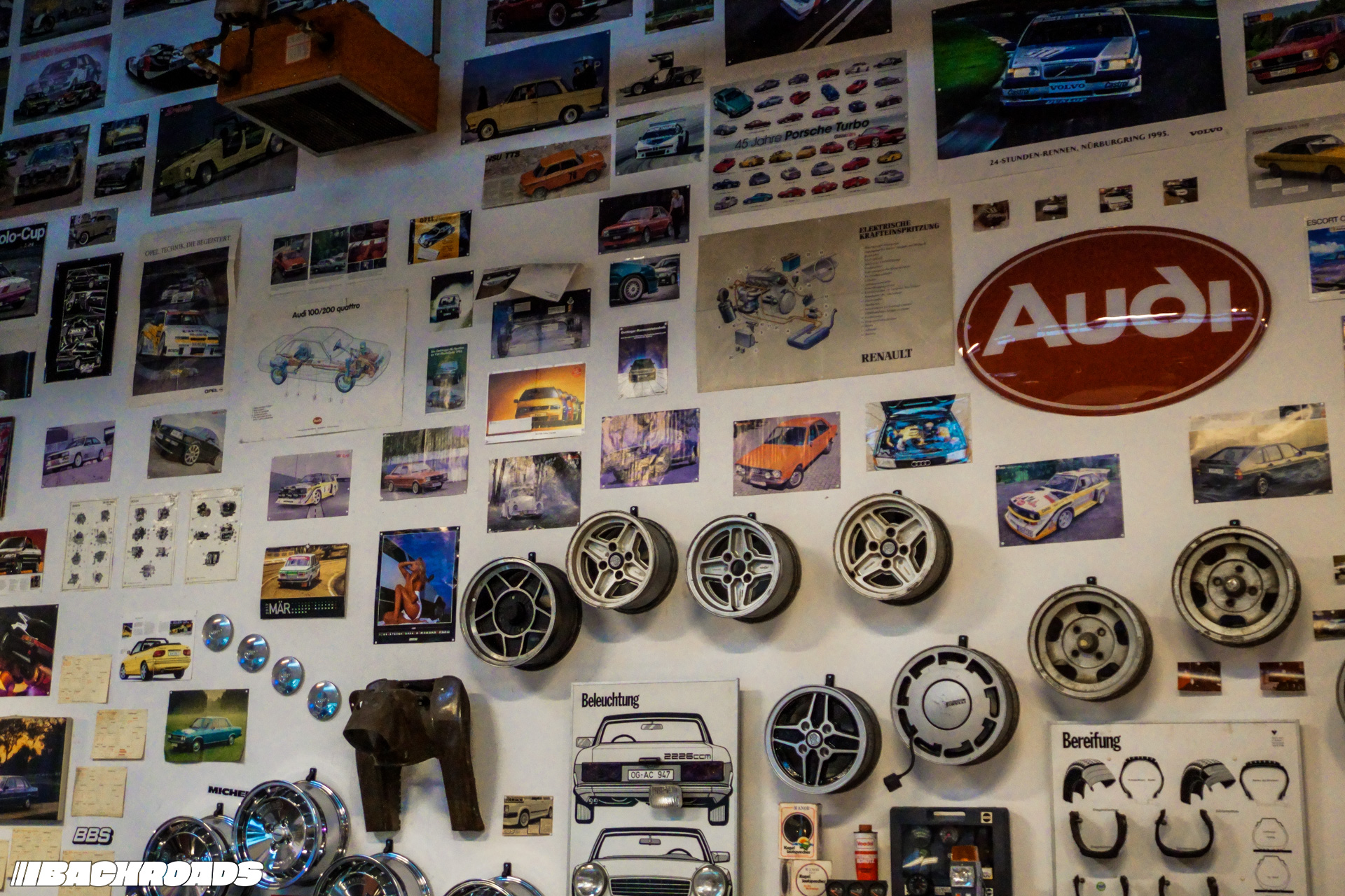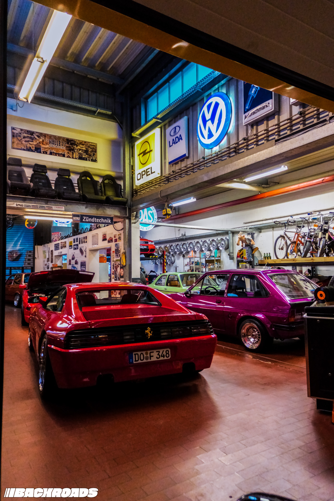 After paying the €9 (approximately US$10) entrance fee, visitors step into a space that feels frozen in time. Every detail is period-correct, from engines and wheels to tools, posters, and diagnostic equipment. Highlights for me included an Audi Quattro, a Lotus Carlton, a Ferrari F355, a drag-prepared Opel Ascona, and a replica Mercedes-Benz 190E EVO II. From a window, it is even possible to watch cars being tested on the dyno when it’s in use.