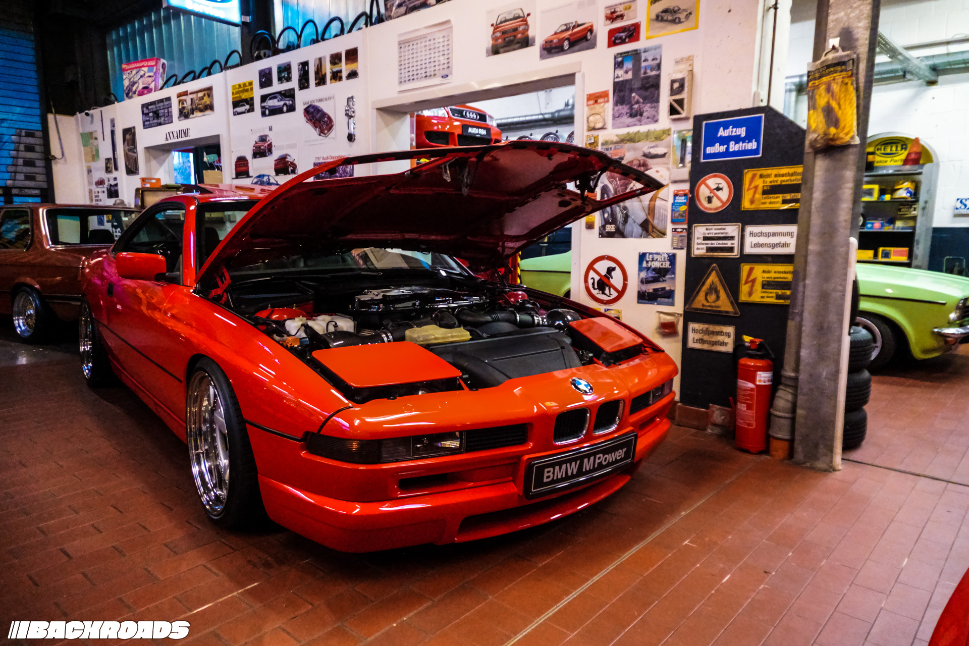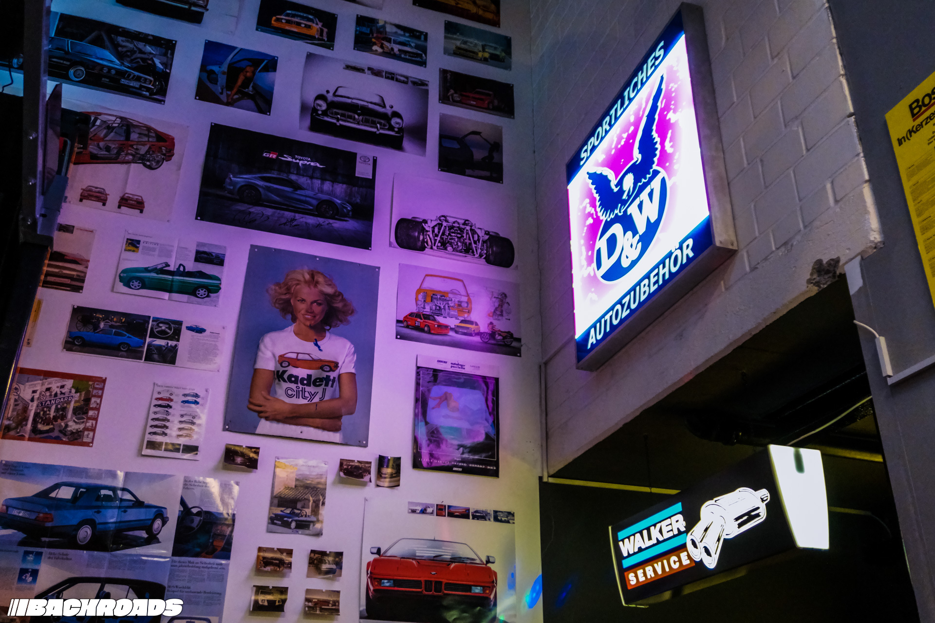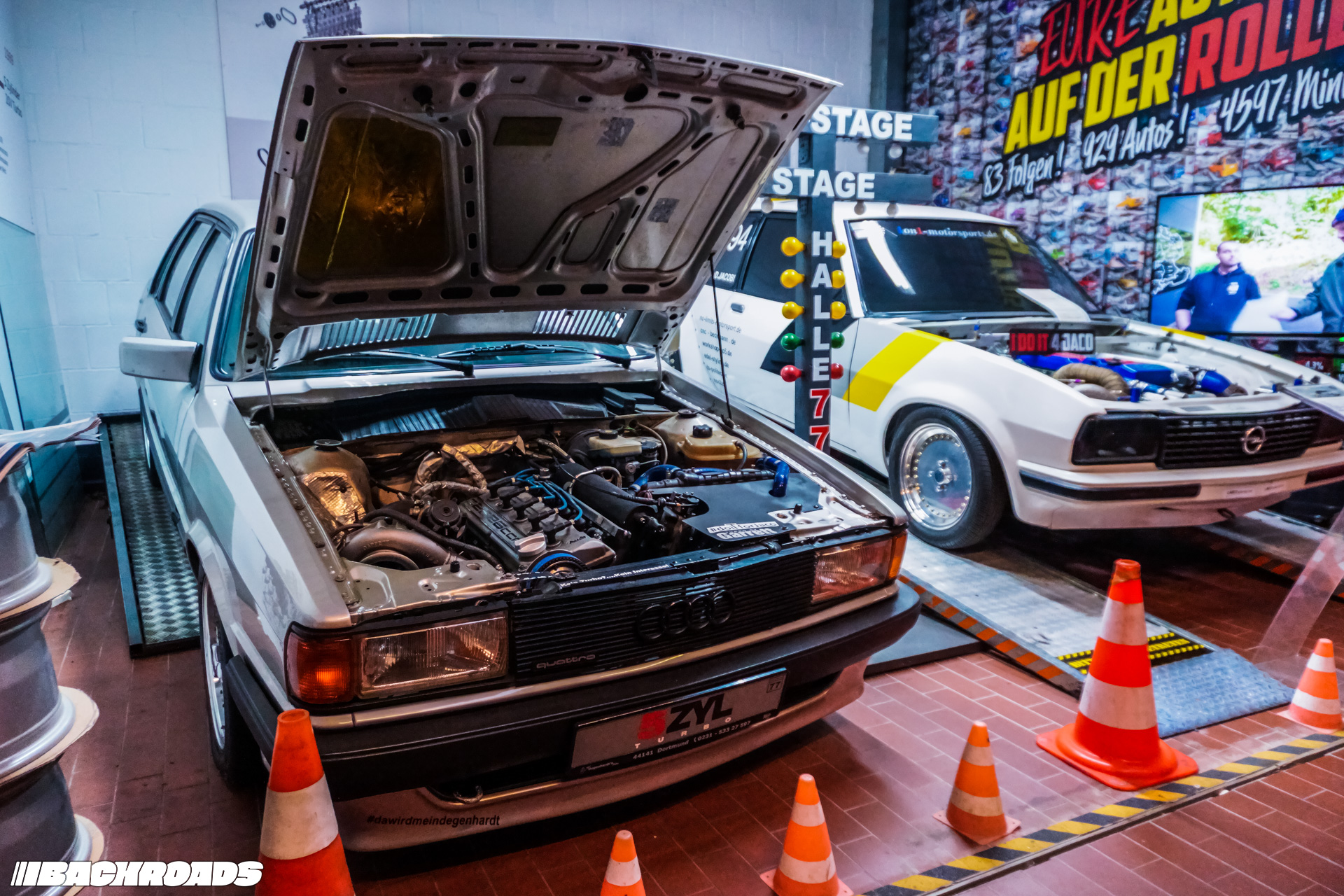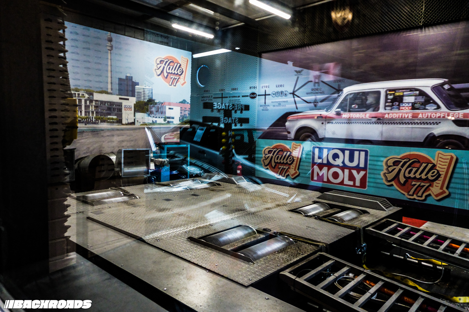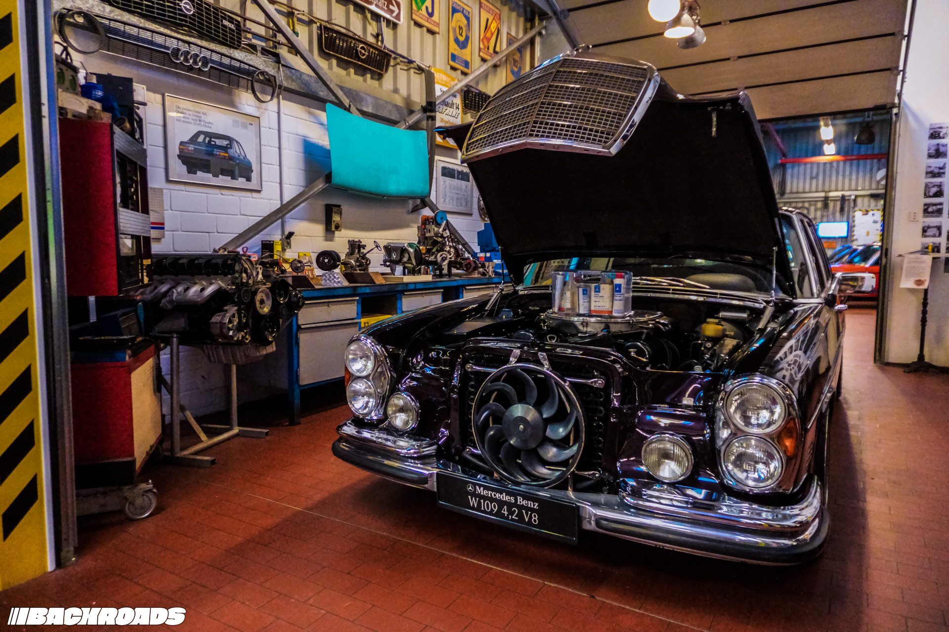 After paying the €9 (approximately US$10) entrance fee, visitors step into a space that feels frozen in time. Every detail is period-correct, from engines and wheels to tools, posters, and diagnostic equipment. Highlights for me included an Audi Quattro, a Lotus Carlton, a Ferrari F355, a drag-prepared Opel Ascona, and a replica Mercedes-Benz 190E EVO II. From a window, it is even possible to watch cars being tested on the dyno when it’s in use.
