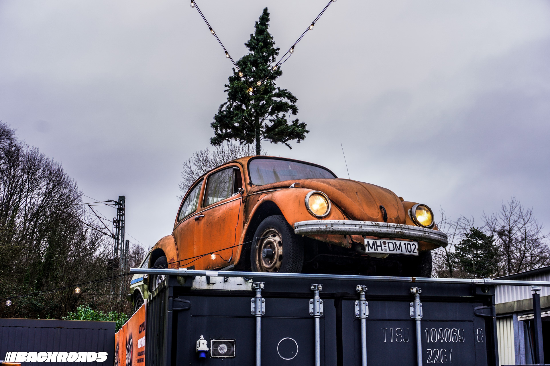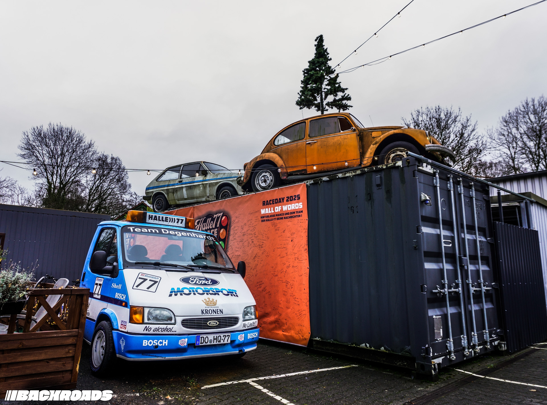 The Halle77 collection spans several decades, from the 1960s through the early 2000s, with the occasional modern contrast, like an electric Honda e. Among the most curious sights were a Ford Transit rally-support transporter and a Ford Fiesta alongside an orange Beetle, sat upon a container and crowned with a Christmas tree.