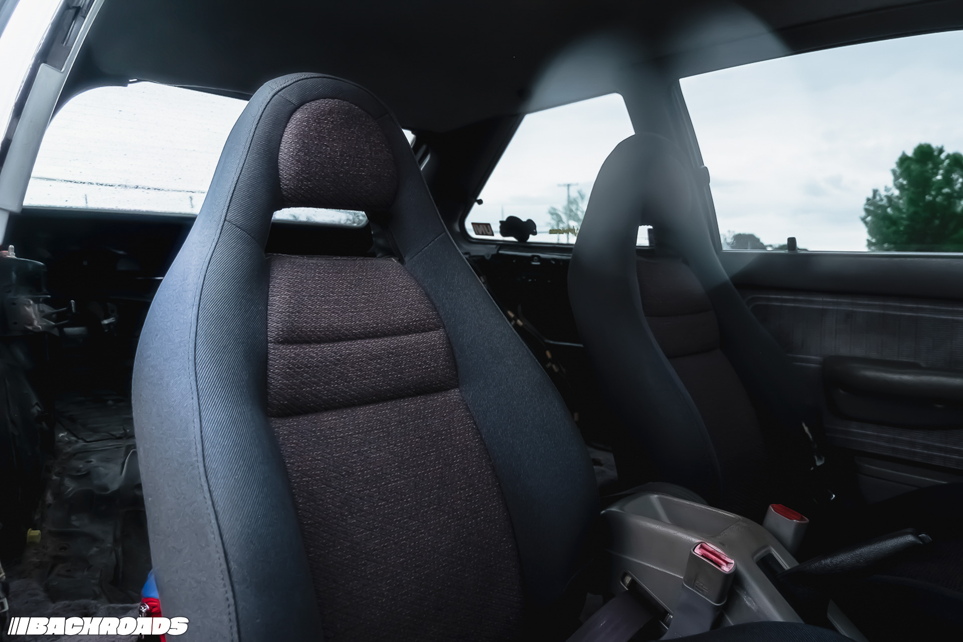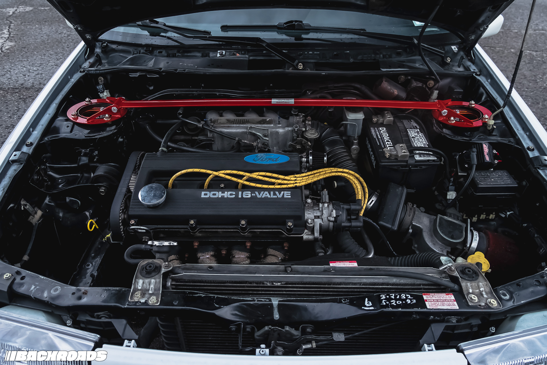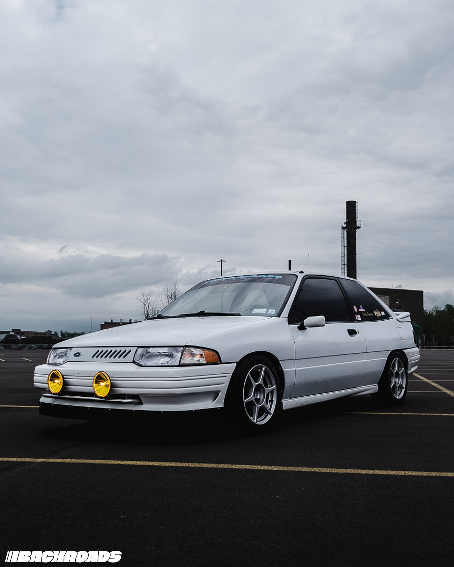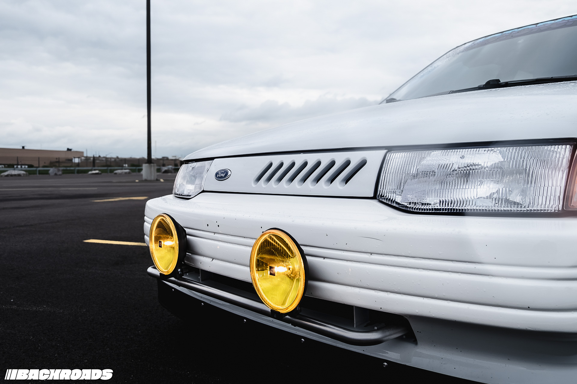 On the outside, it’s clean but full of cool little touches. There’s a custom light bar with Hella Comet 500s, Mercury Tracer corner lights, and a one-off ABS front lip that brings WRC vibes. Out back there’s a cut bumper, a CB7 Accord spoiler extension on the roof, GT-Styling tail light covers, a 91-92 Escort GT 3-piece wing, and Vitaloni Baby Turbo mirrors.