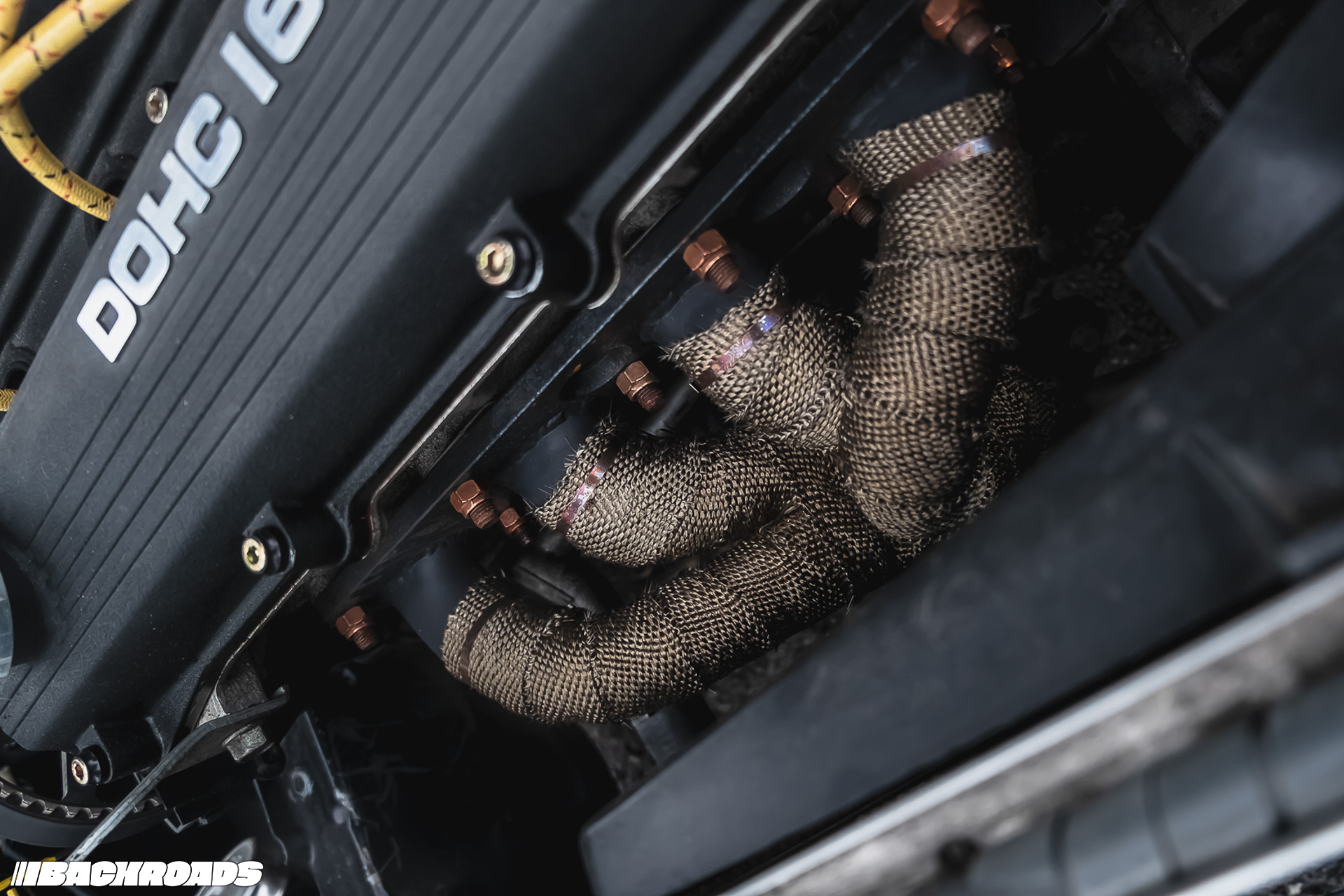 That includes select upgrades to the car’s original 127hp Mazda engine, which now benefits from higher compression and basic intake and ignition modifications. The custom exhaust begins with a ceramic-coated and wrapped Protege GT header before flowing into a custom 304 stainless steel system featuring Vibrant resonators and a MagnaFlow muffler. It has a deep but clean sound, just enough to let you know it’s not stock.