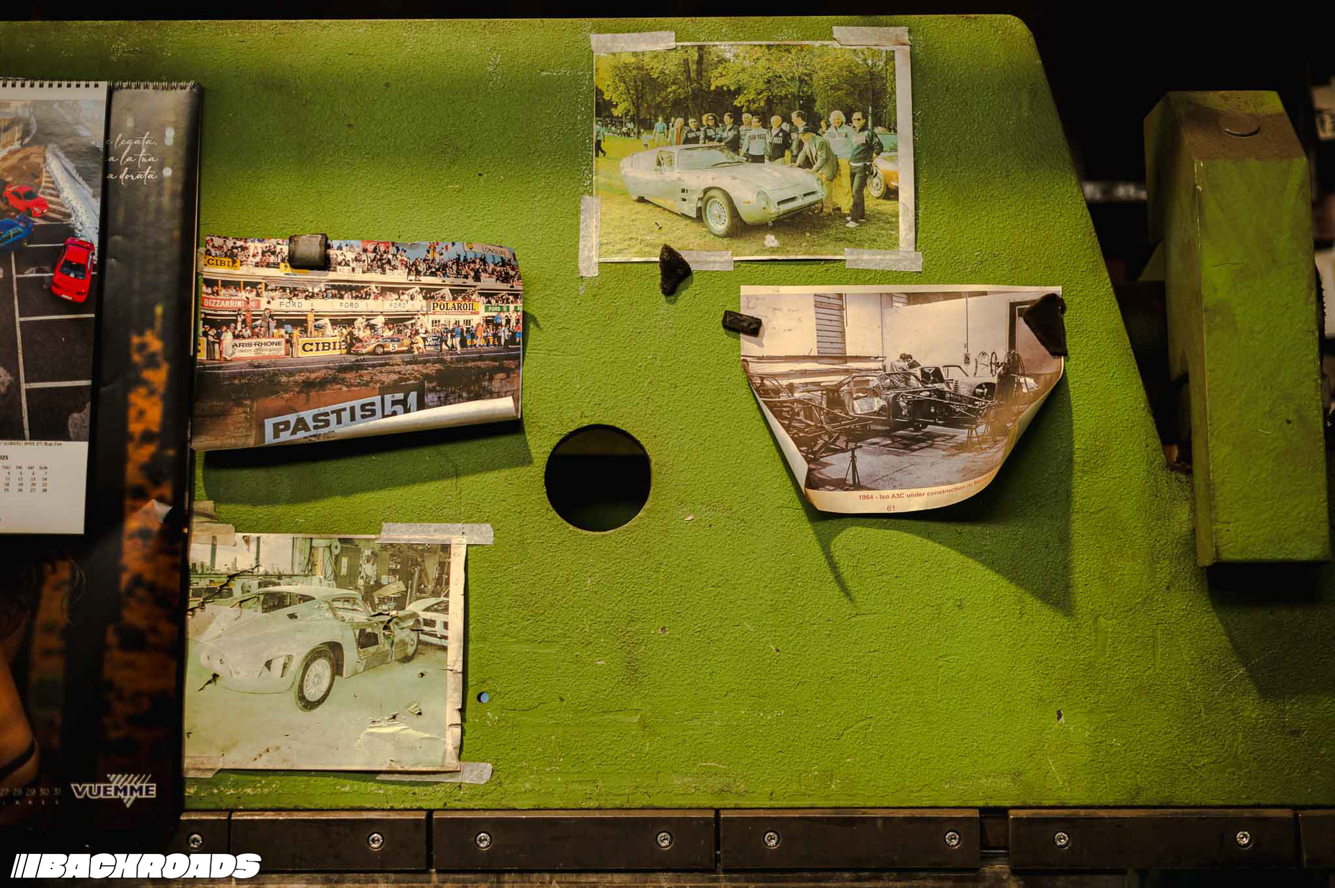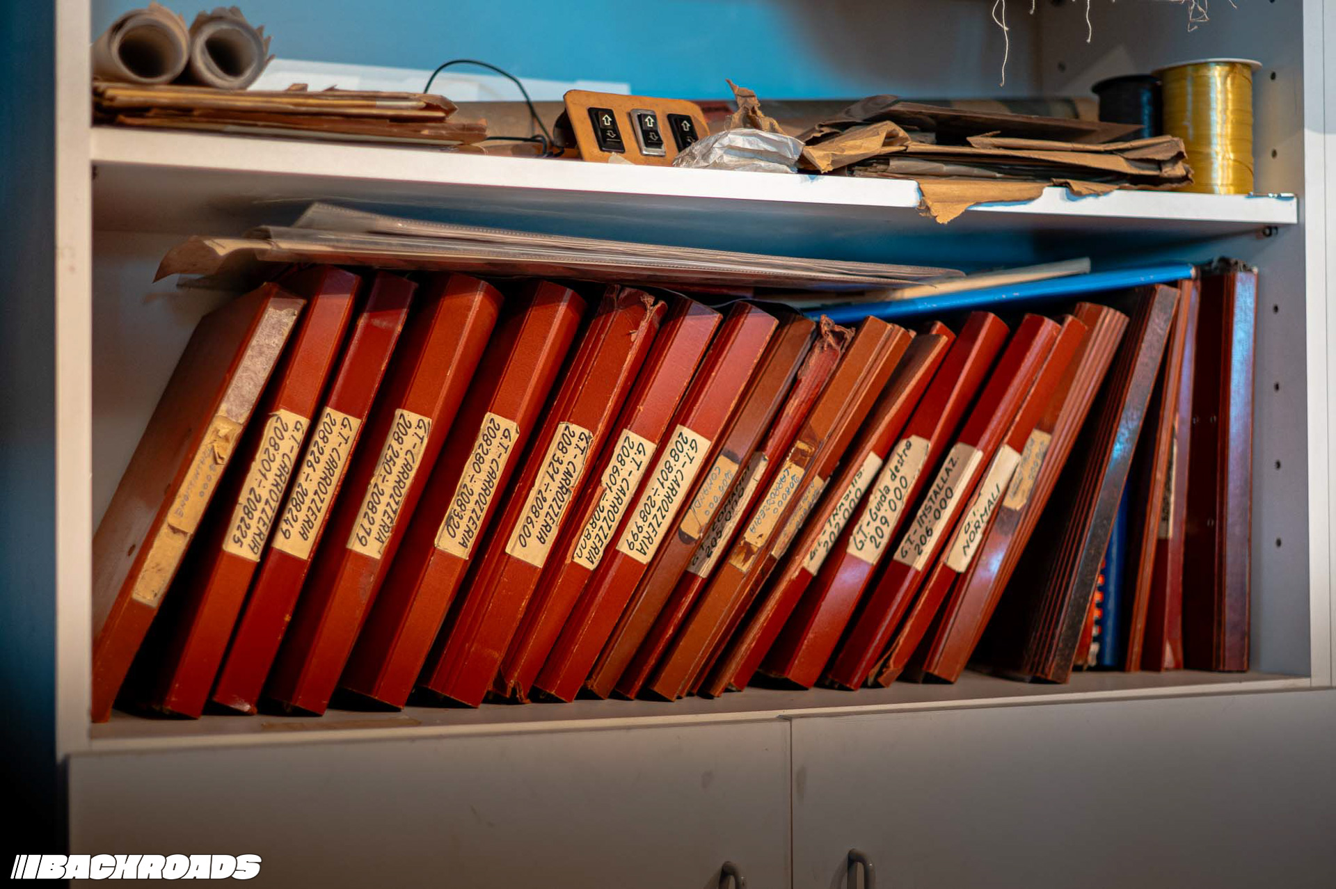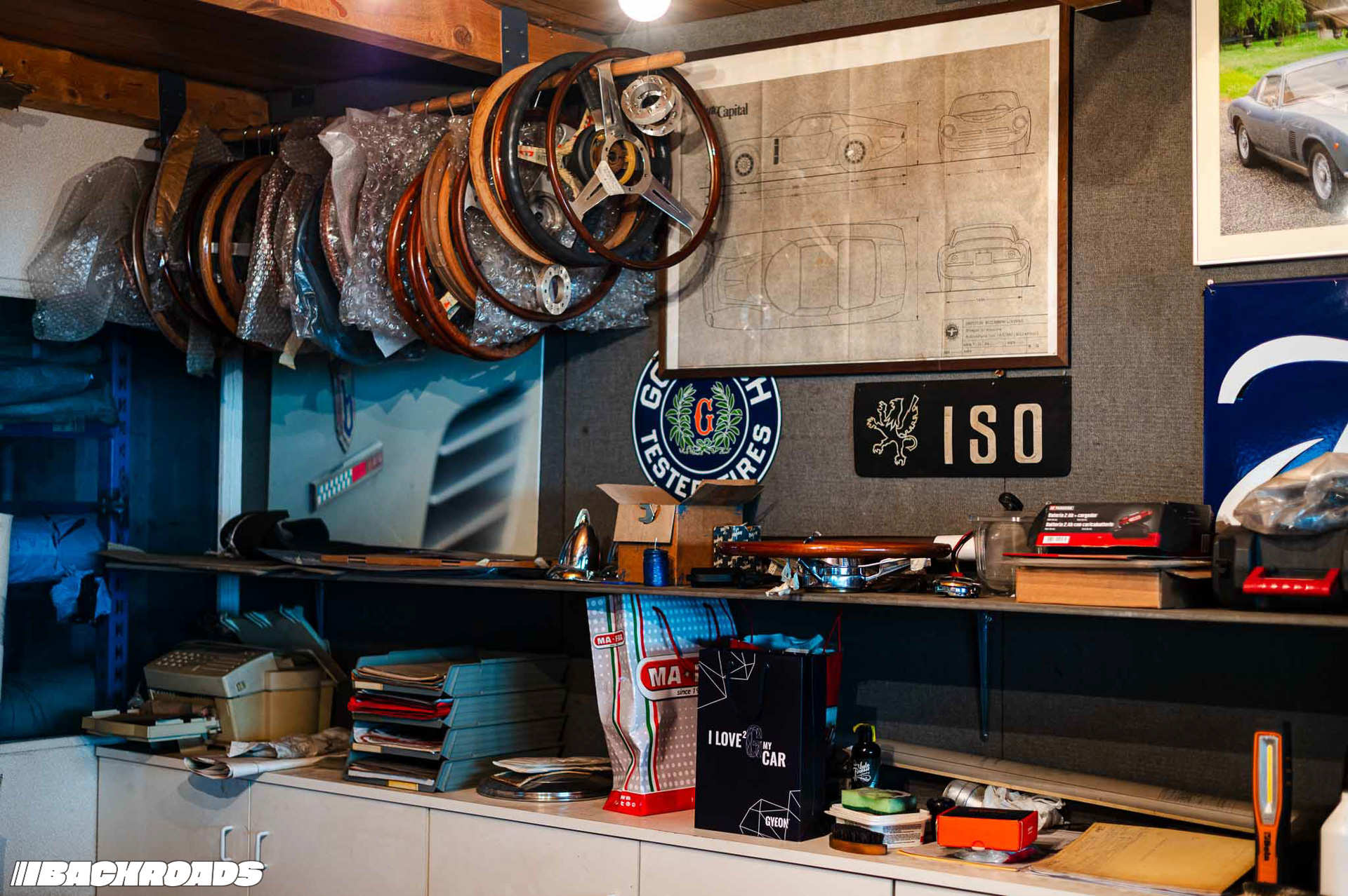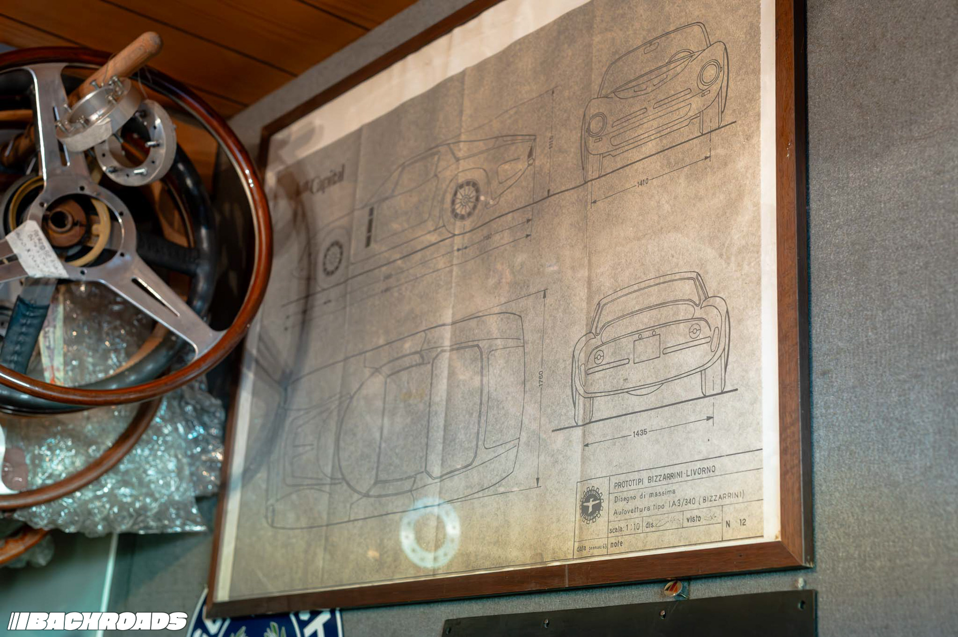 Climbing stairs up to a small office, Federico showed me shelves lined with ISO’s original documents. On a central table lay an open technical drawing displaying precise measurements. The office also doubled as storage for wooden trims for gauge clusters, steering wheels, and rolls of fabric.