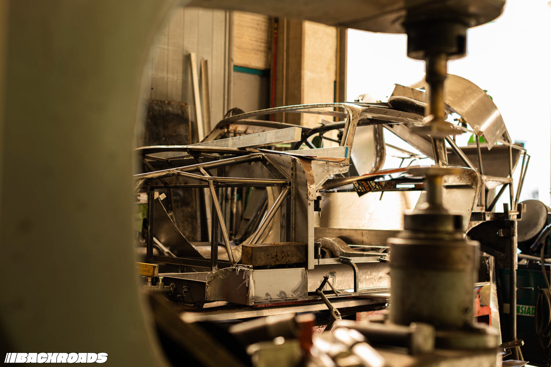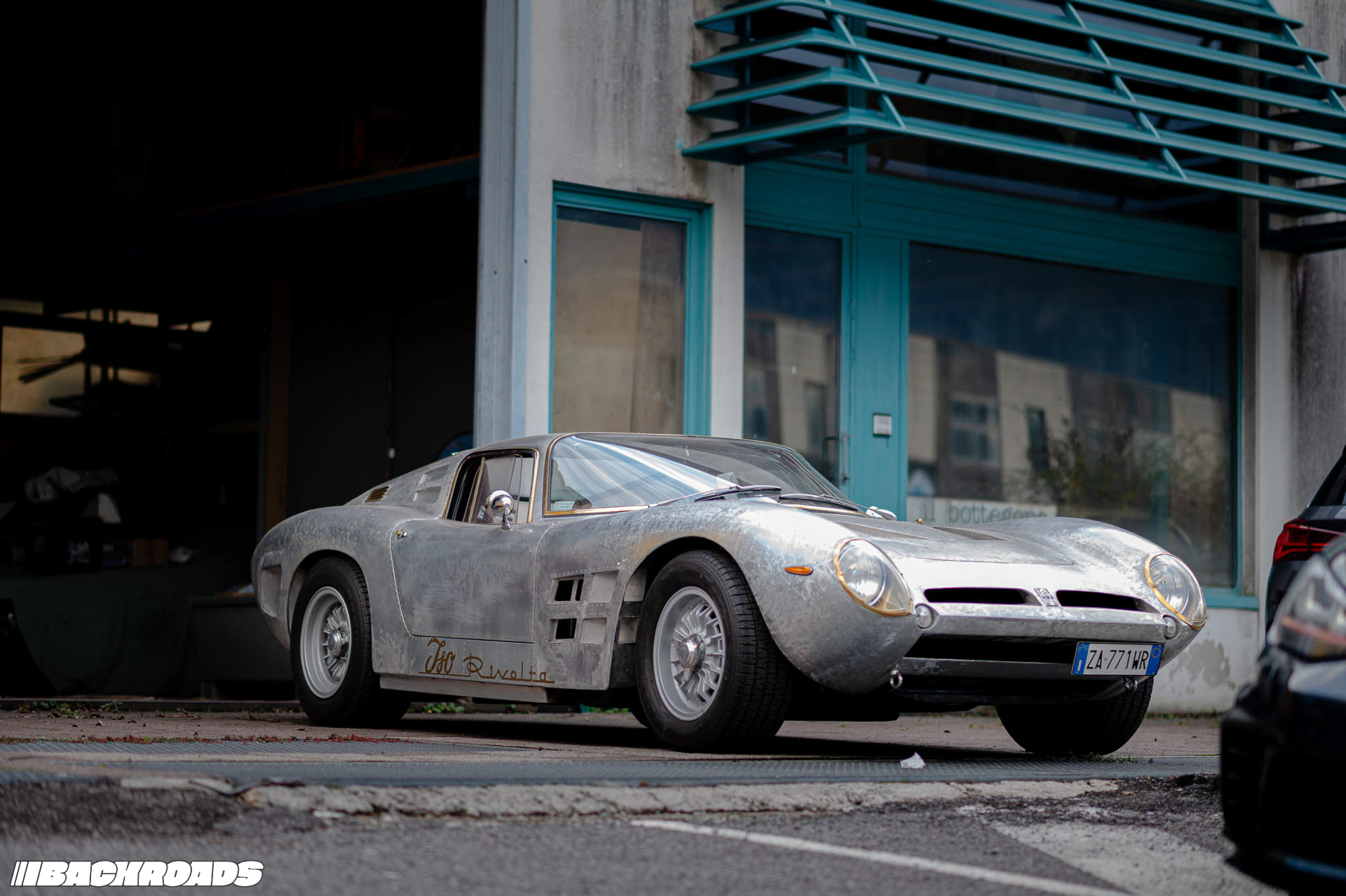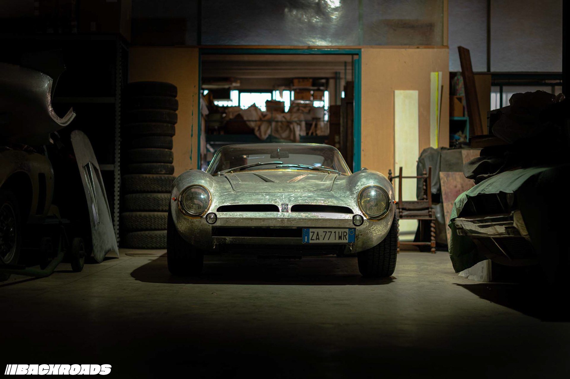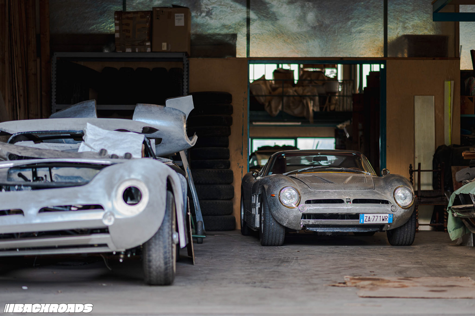Next, we walked to the second building, which is a staging area for nearly finished and finished cars. As the main door opened, we were met by an ISO Rivolta A3C in bare metal. Federico explained that it had been in an accident, its front right section badly mangled. Now, every inch revealed painstaking hammer work that had brought it back to life.