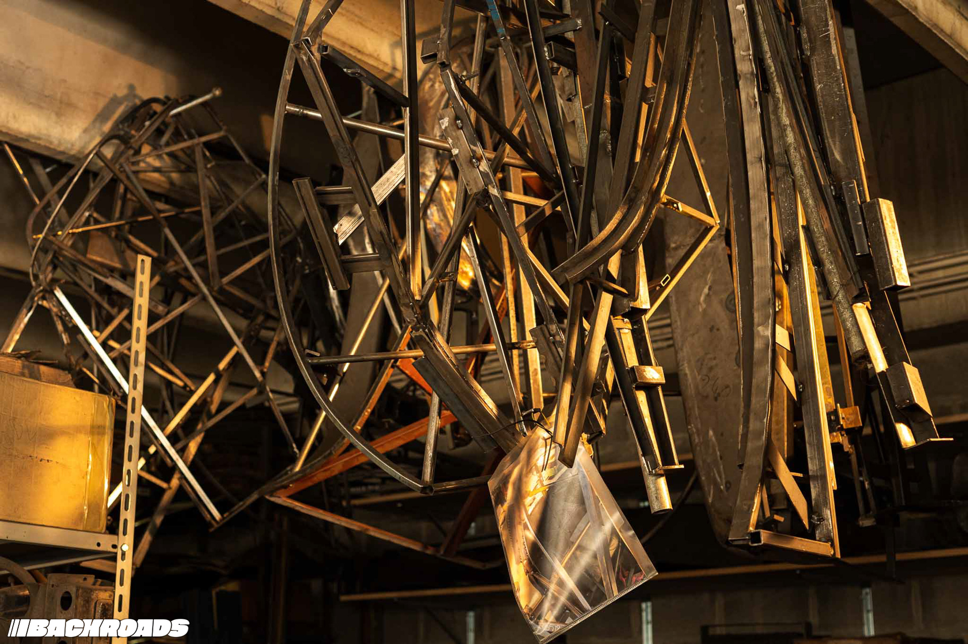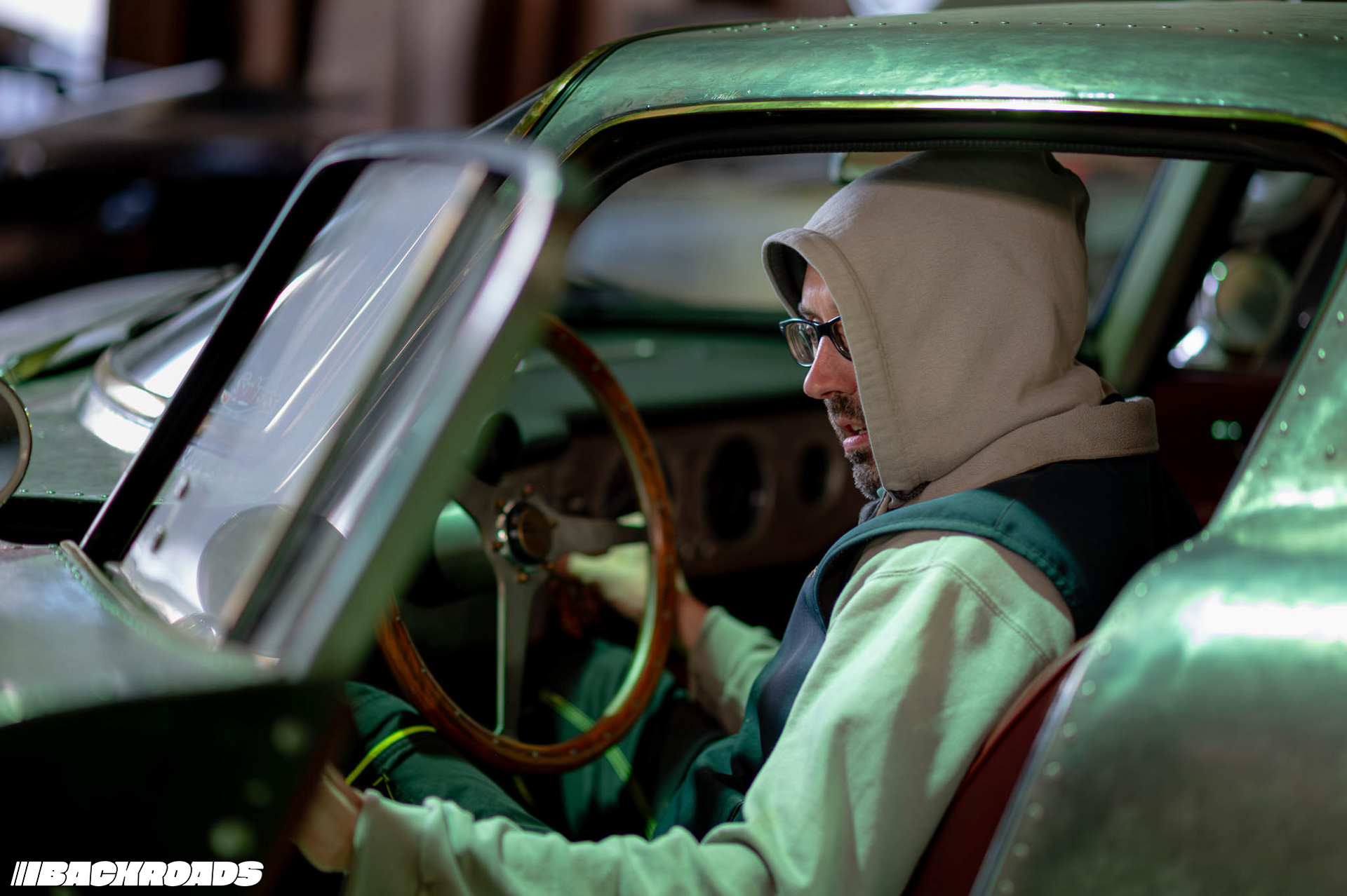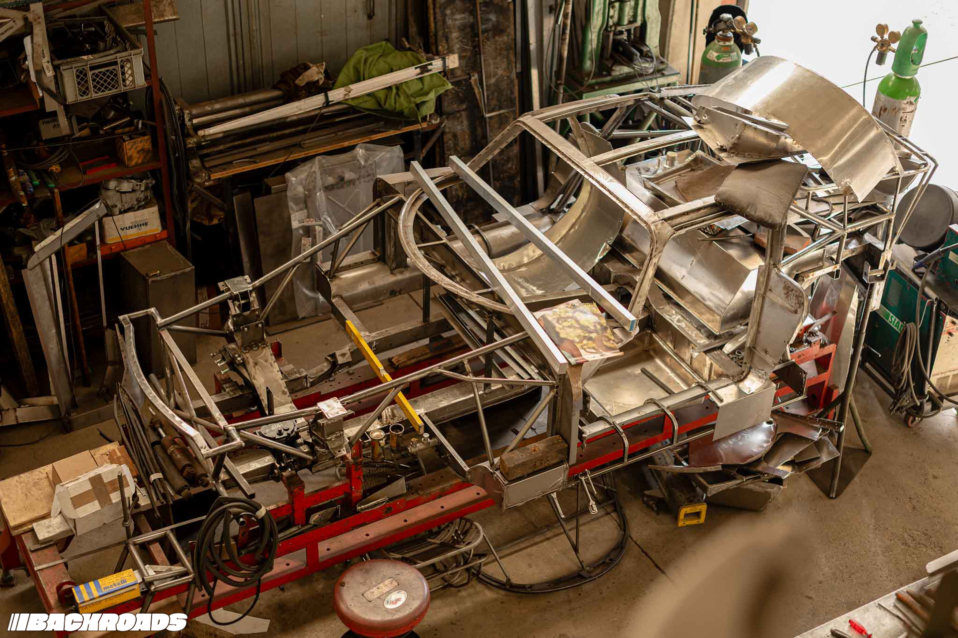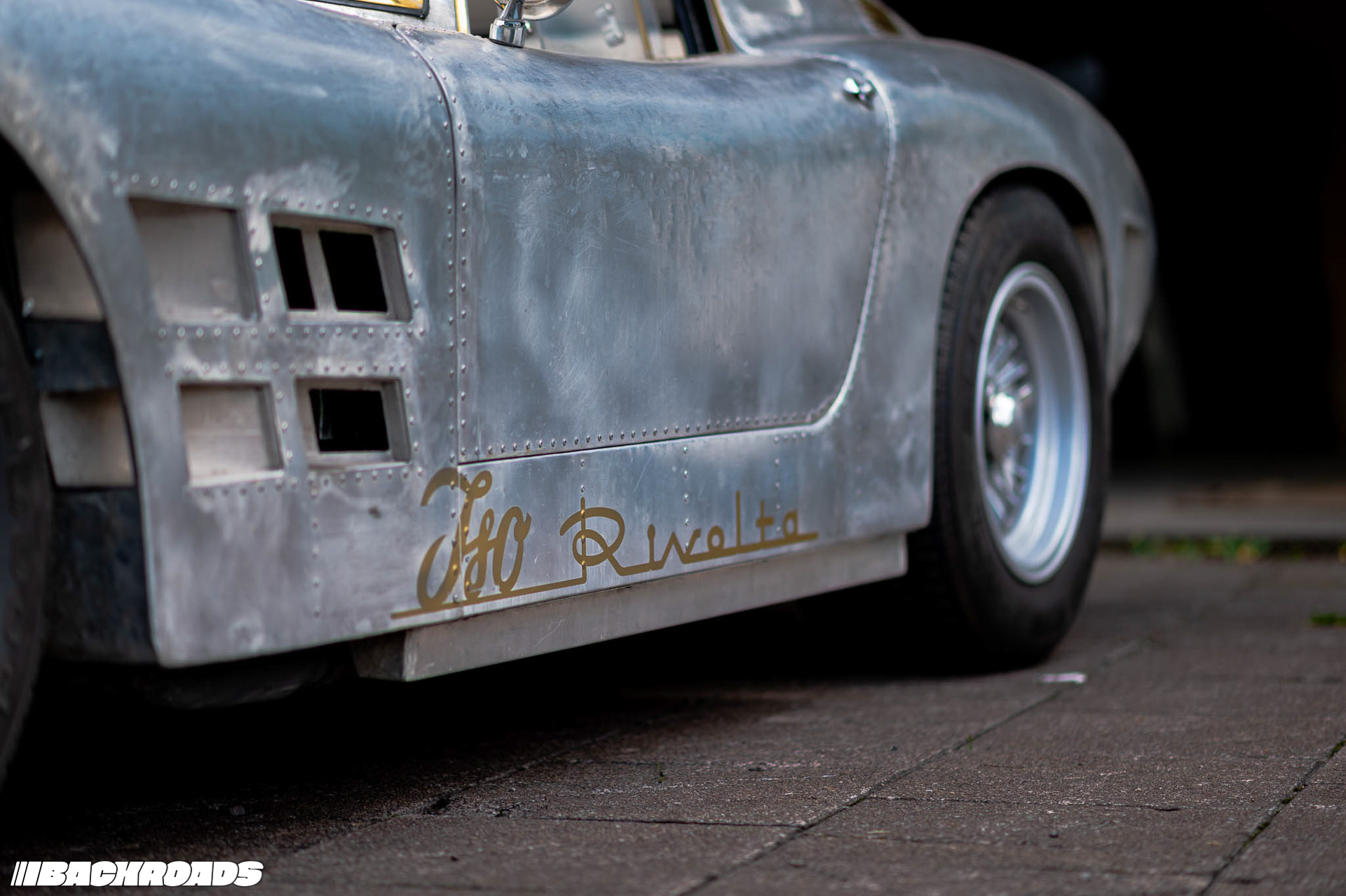 Next, we walked to the second building, which is a staging area for nearly finished and finished cars. As the main door opened, we were met by an ISO Rivolta A3C in bare metal. Federico explained that it had been in an accident, its front right section badly mangled. Now, every inch revealed painstaking hammer work that had brought it back to life.