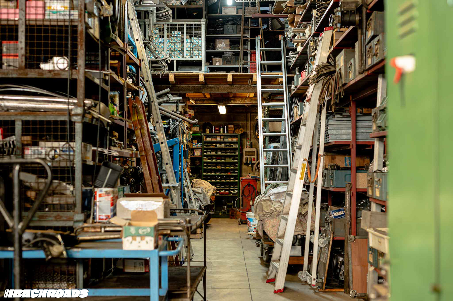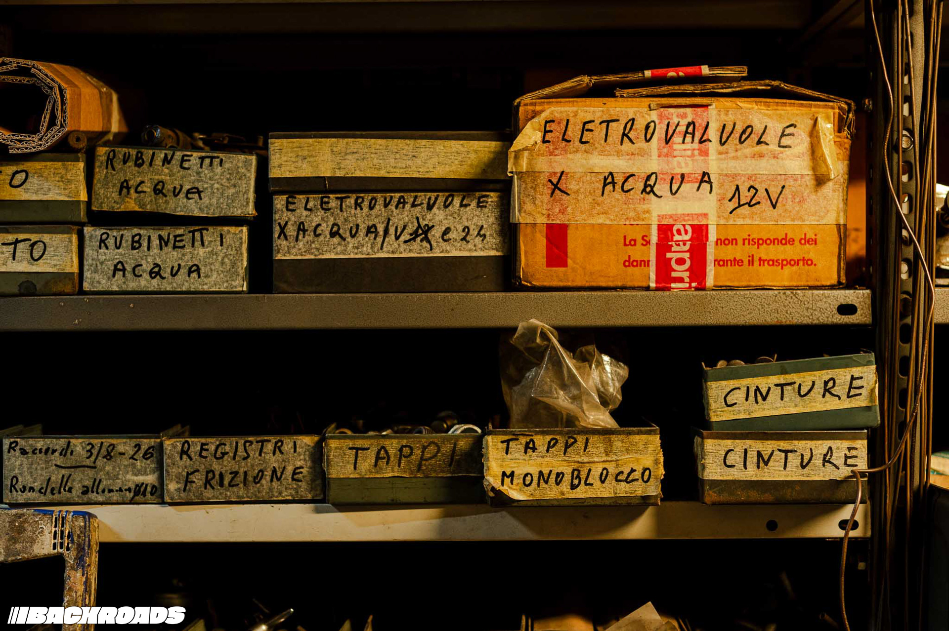 The first building we entered was the main workshop. Tall racks rose above us, filled with everything from window trims to engines and even a complete original exhaust system. In the back, Federico pointed out several ISO motorcycles that had recently been brought in for restoration.