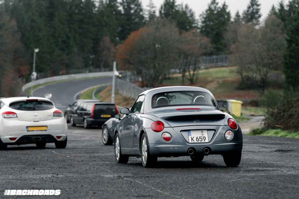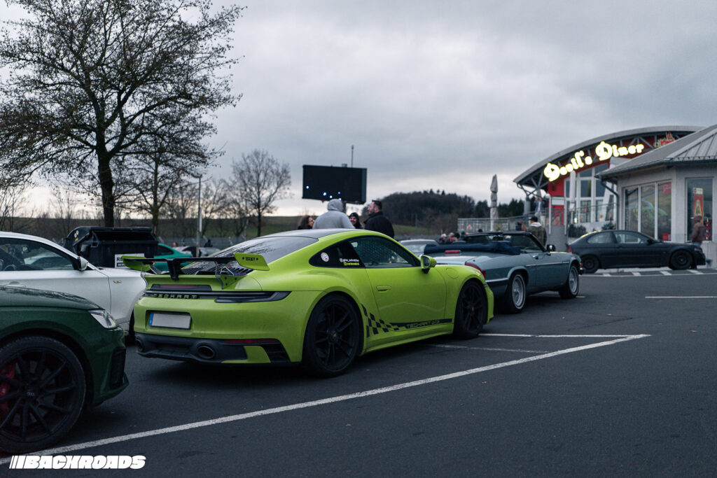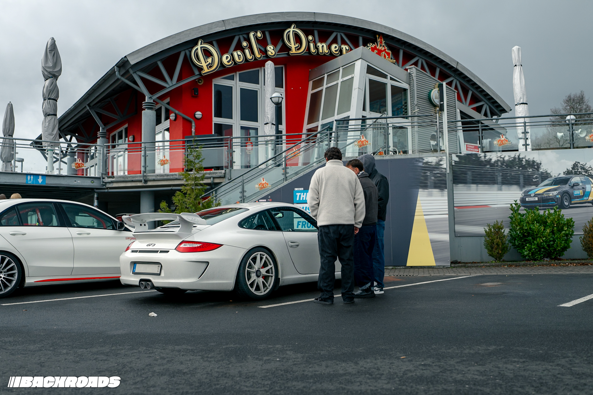 The day began with rain, meaning the cold Nordschleife was very slippery. Thankfully, the tarmac does dry out as people make their way around the circuit. But while the track is where the action is at – especially when there’s a lack of grip – the Devil’s Diner parking lot at the Nordschleife’s entrance is where the culture lives. Here, friends and strangers connect over their shared passion for cars.