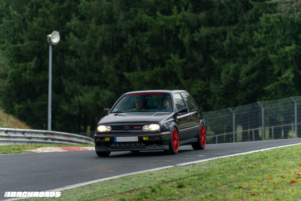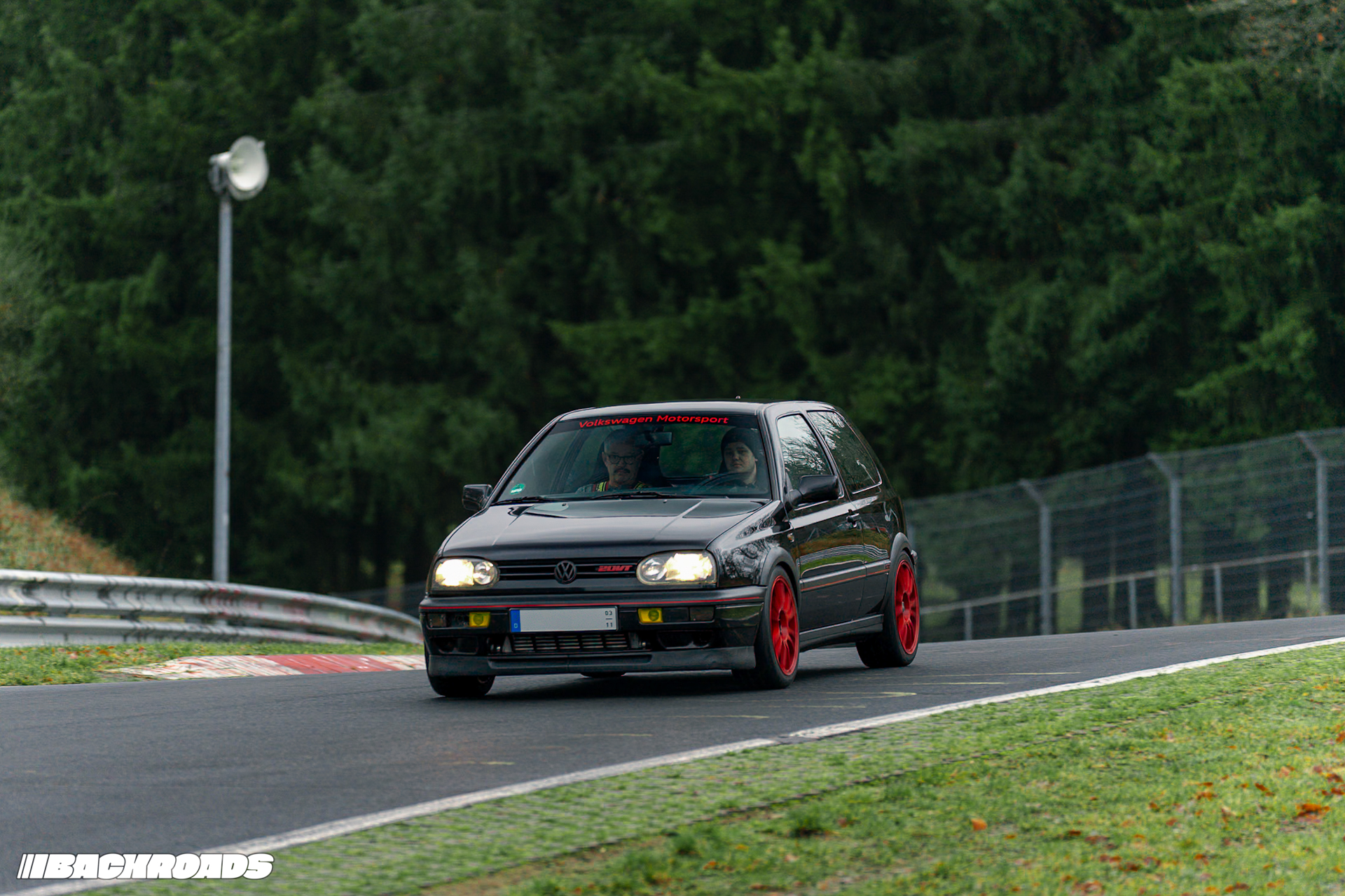 The main event, however, was a parade lap at the end of the day. At 3:30 pm, the T13 pit was overflowing with cars, everyone eager to take one final drive around the Green Hell for the year. After checking out the vibe, I decided to finish my last lap ahead of the parade so I could stand at the exit and capture the spectacle. As the final rental Volkswagen Golf R drove in, the sun broke through the clouds.