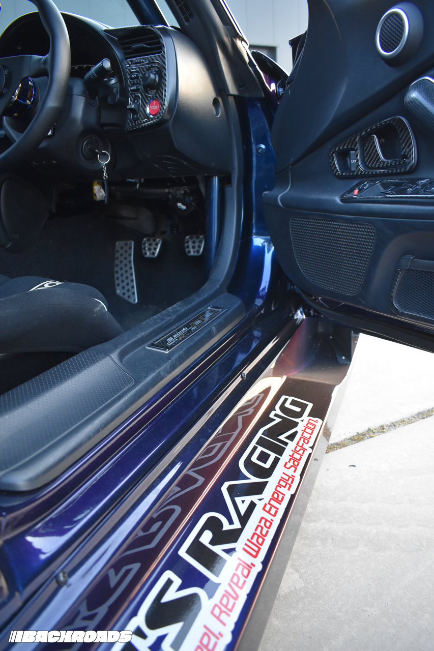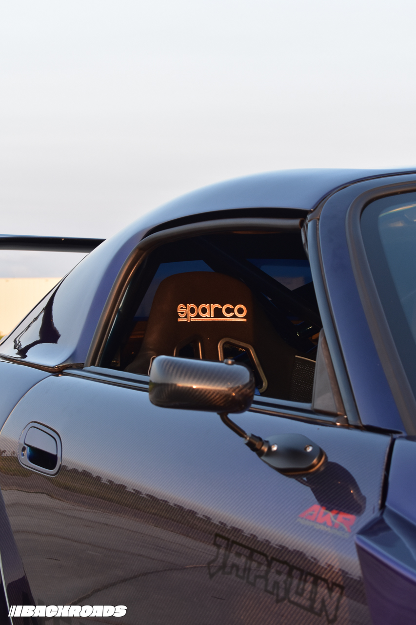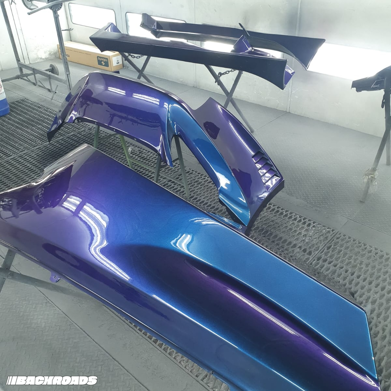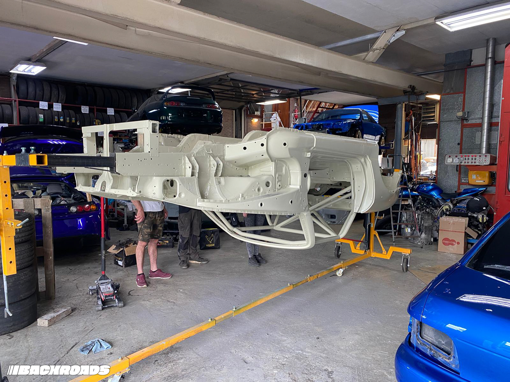 Then it was back to NLA for paint and body work. I had the body panels sourced by ShowoffImports from J’s Racing in Japan; a GT bodykit, a Mooncraft Hardtop from Spoon Sports, a 1800mm GT spoiler from Seibon, GT wing mirrors from APR, lightweight doors from Aeroworks and from Aerodynamics, Mugen Hood – all in carbon fibre – and many other parts including full Hard Race adjustable camber control arms, toe arm, links, bump steer kit, extended ball joints and struts, engine, differential and gearbox mounts.
