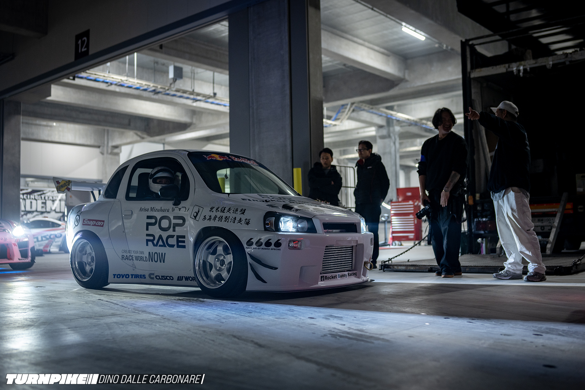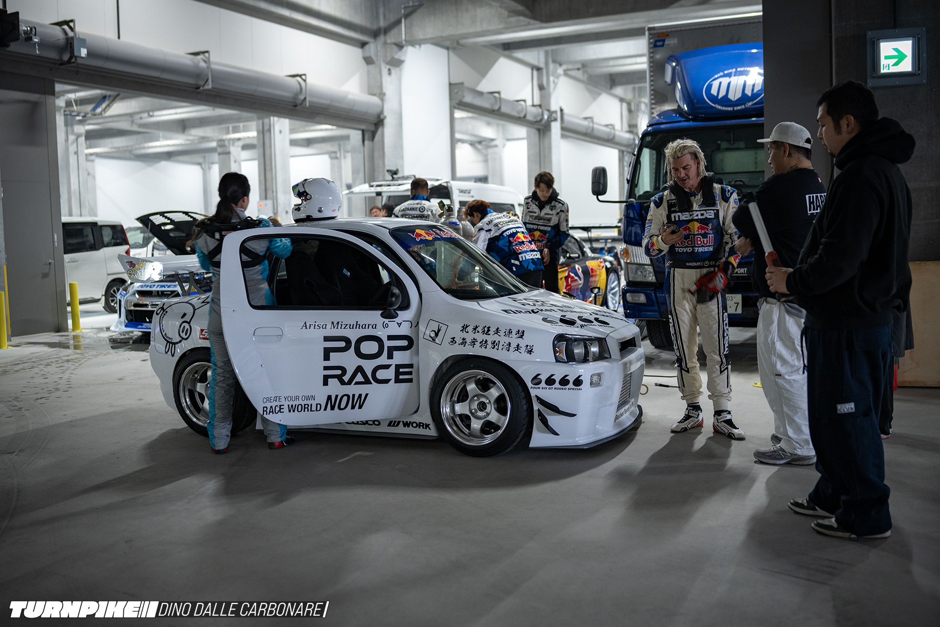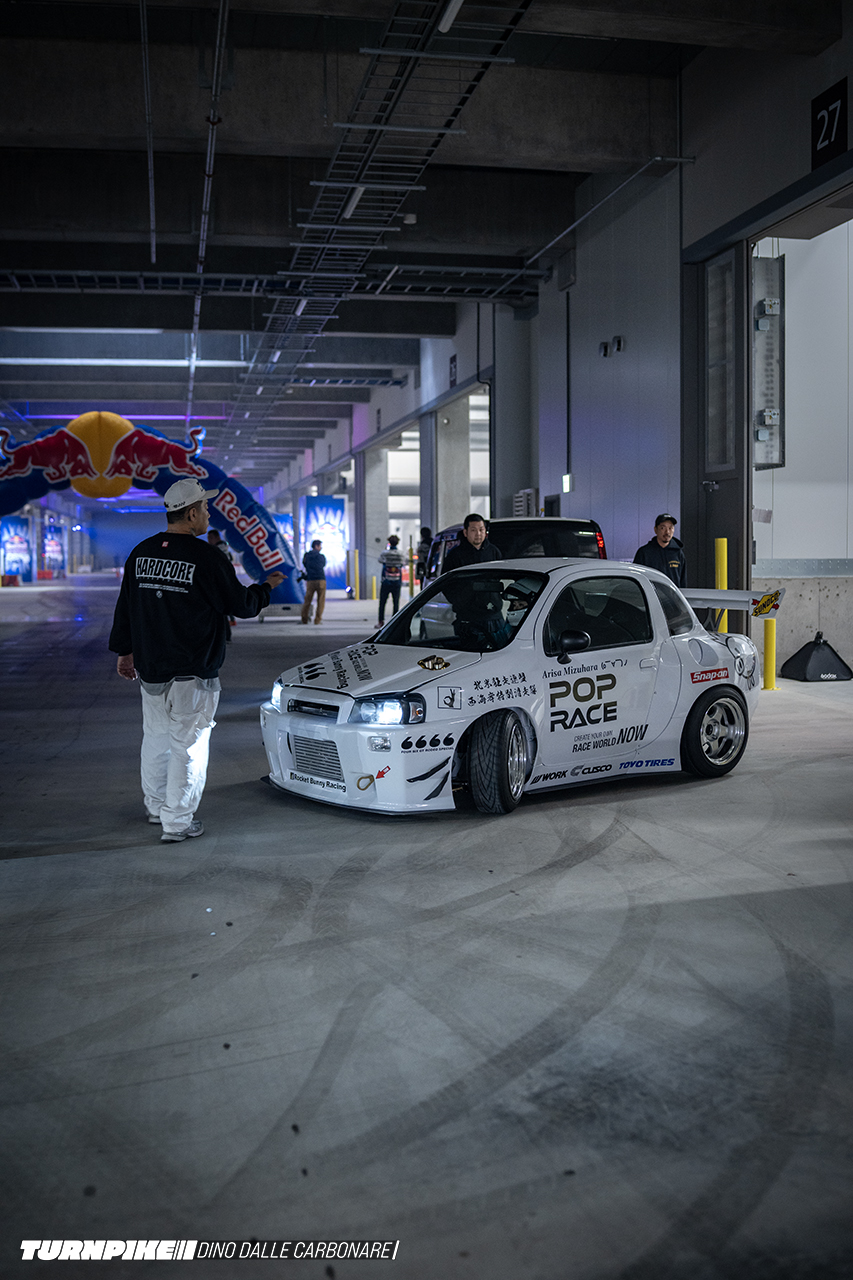 I laid eyes on the completed car at Tokyo Drift’s set-up day, where Miura and his team were shaking down the car with driver Arisa Mizuhara on the indoor track that Red Bull created inside a massive logistics facility.
