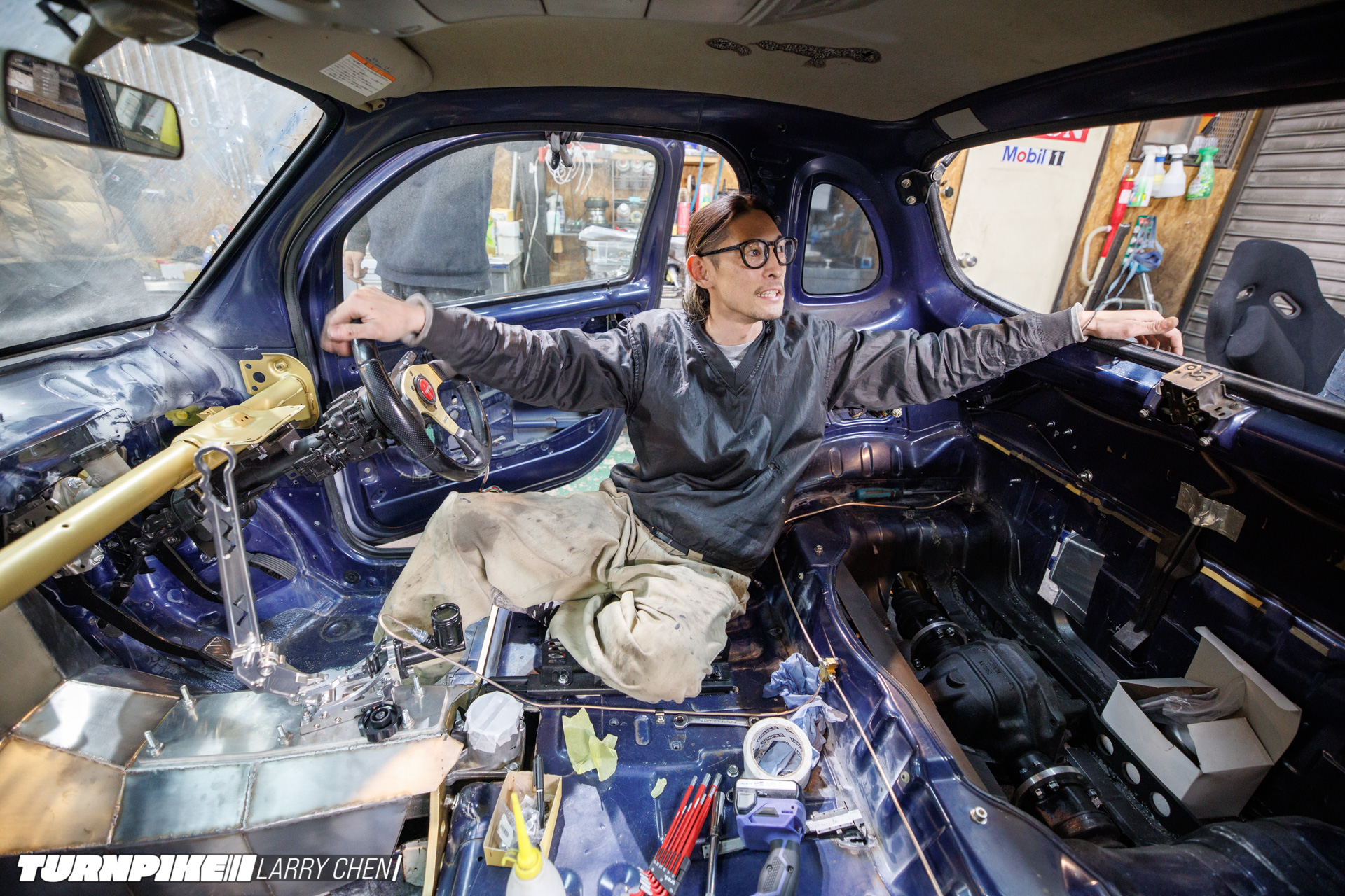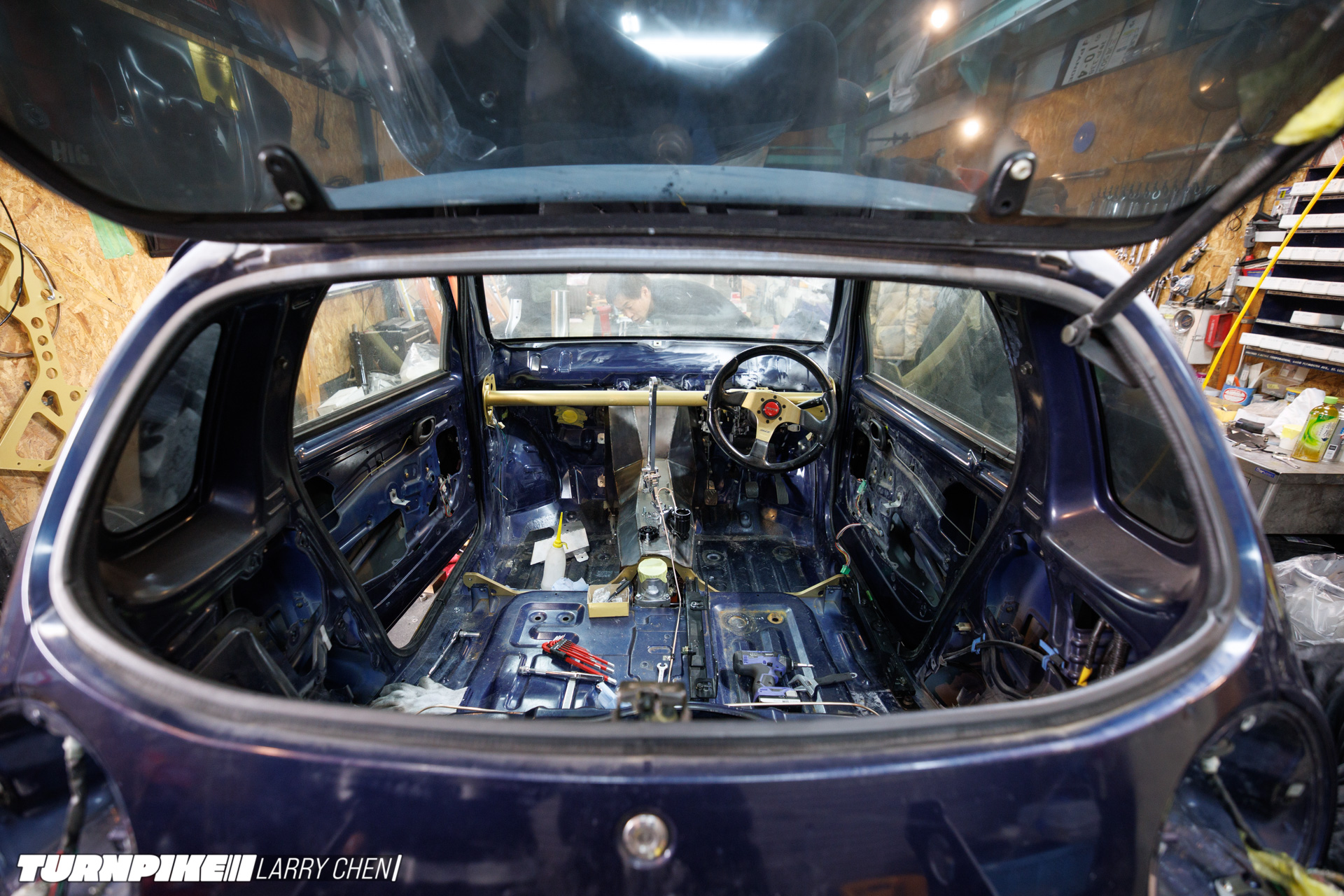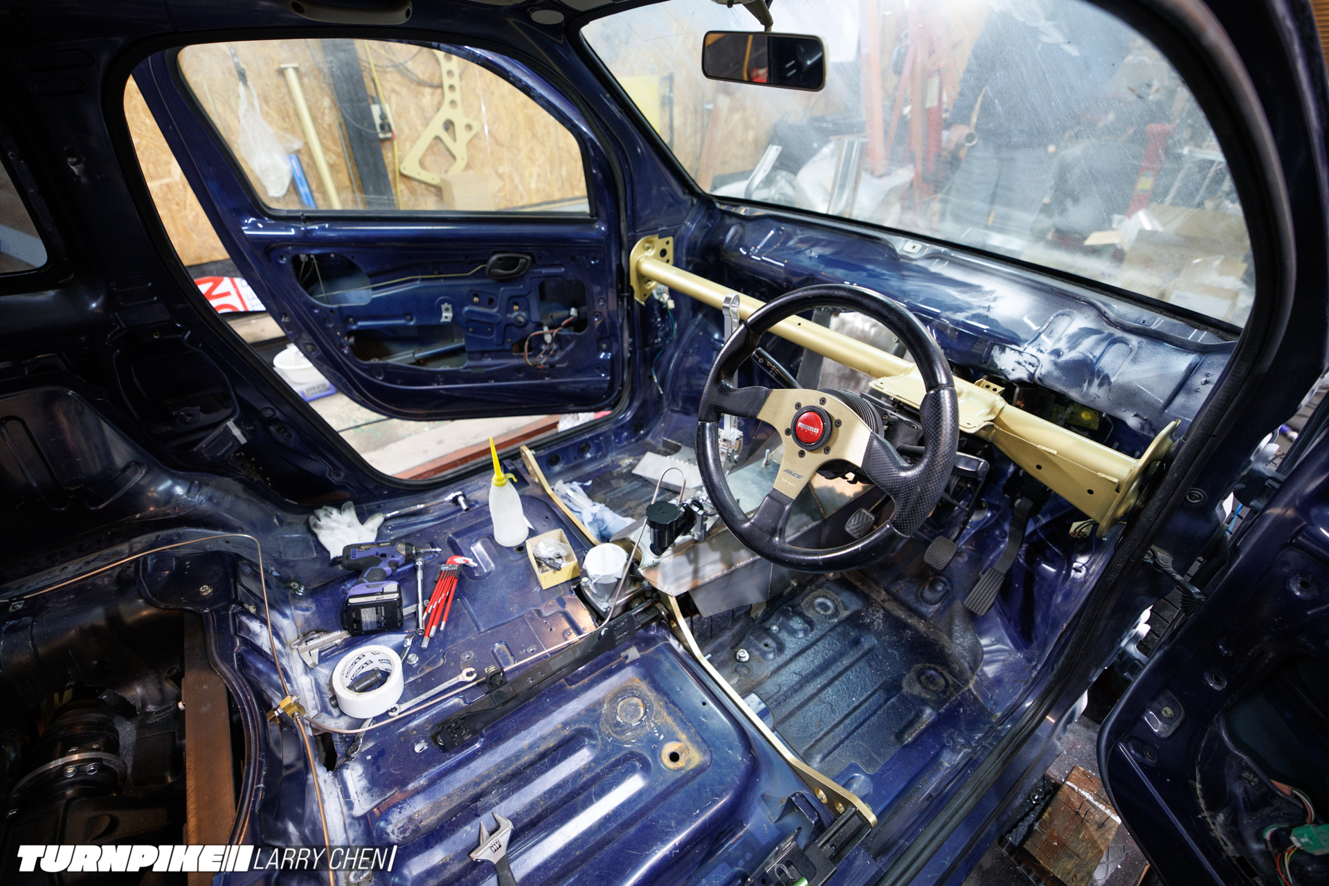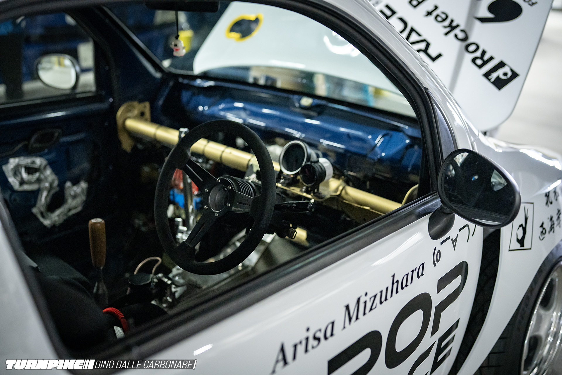 The interior is as bare bones as it gets. Arisa has her bucket seat in there, but there’s no dashboard; the support bar mounts a small tachometer and a makeshift switch panel.