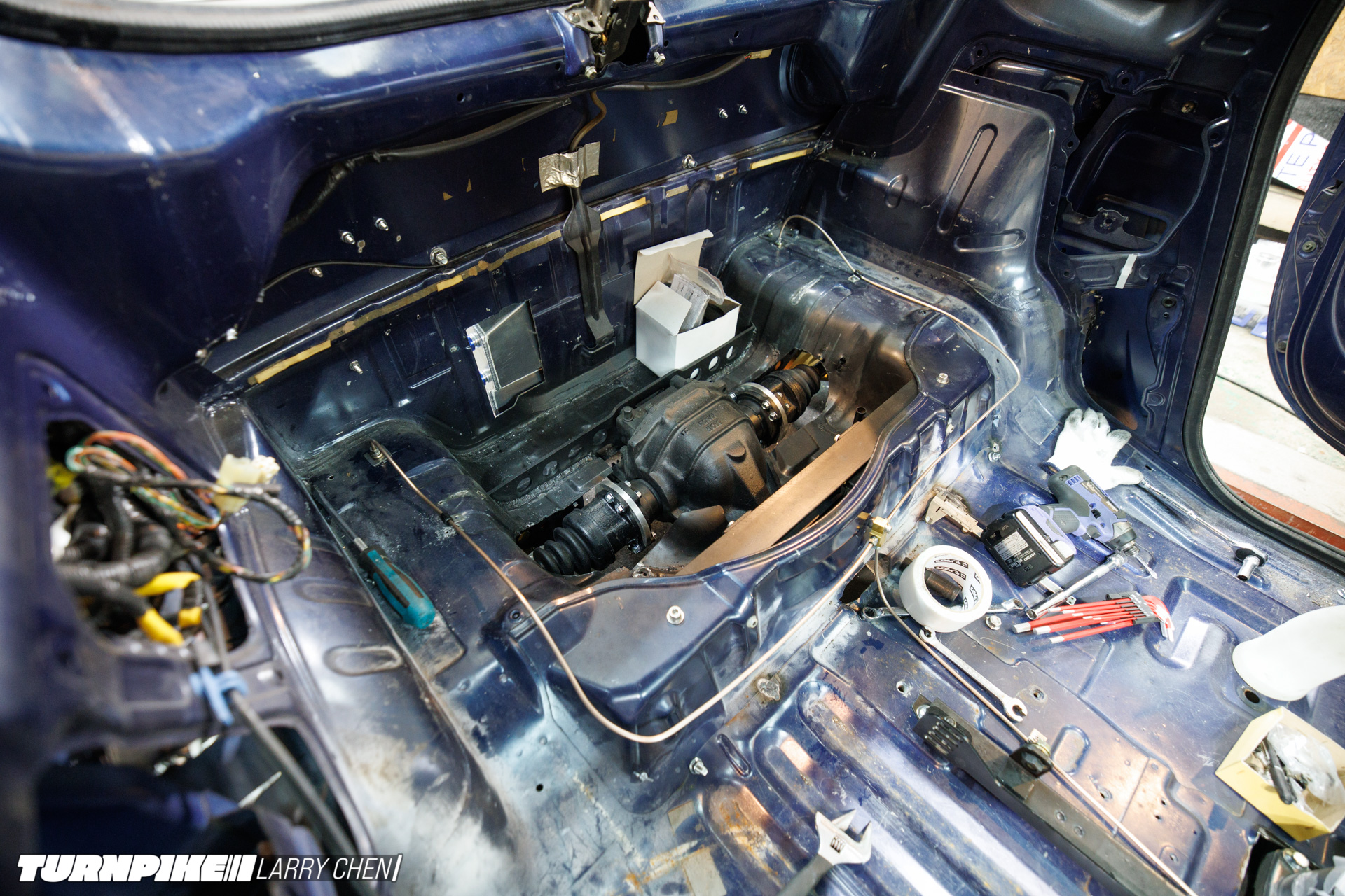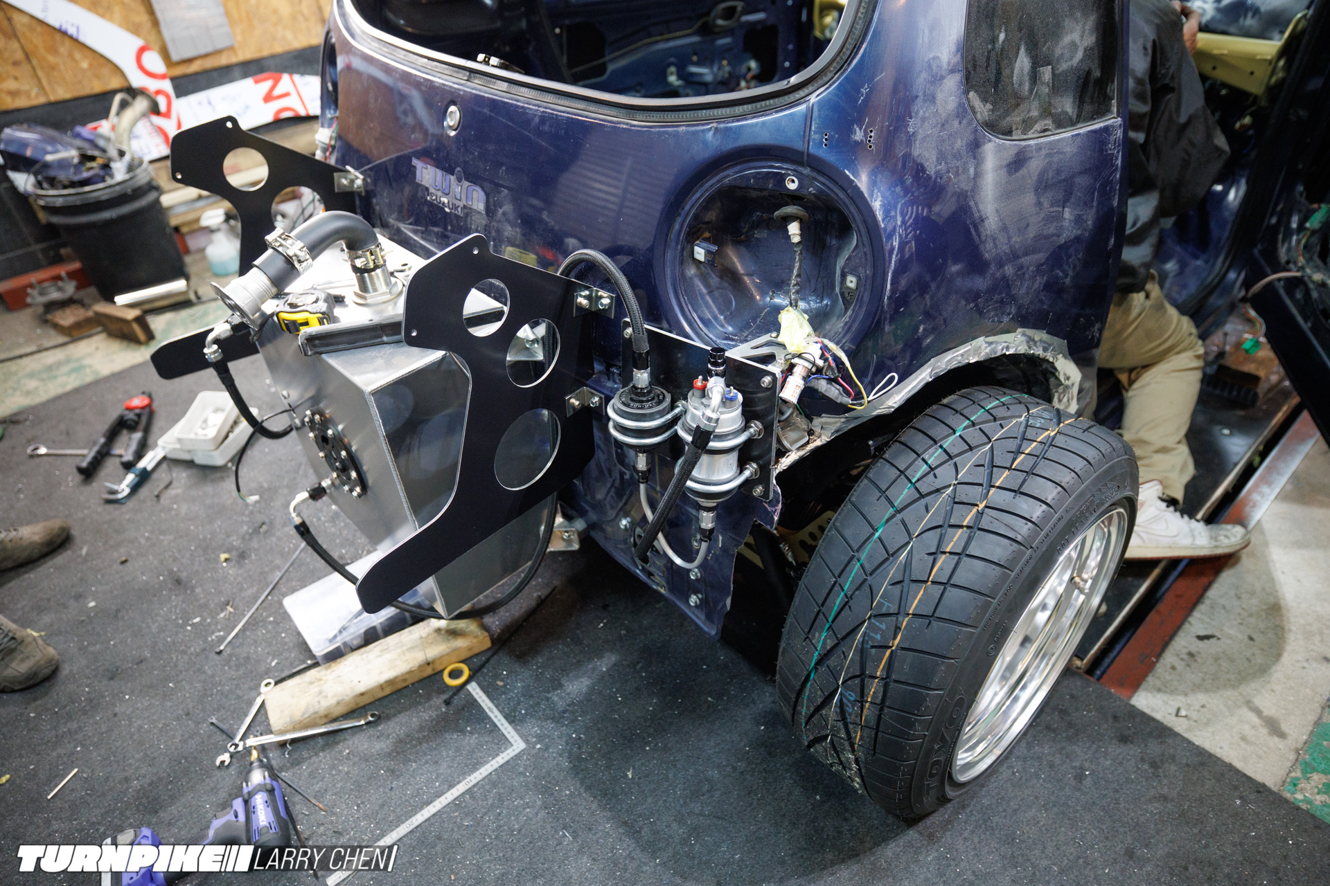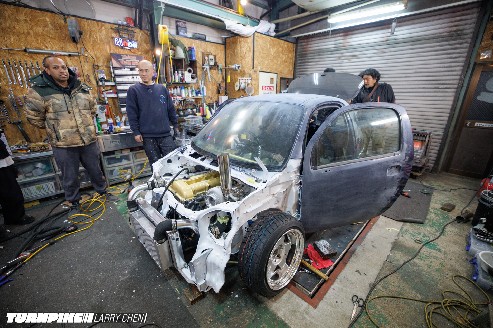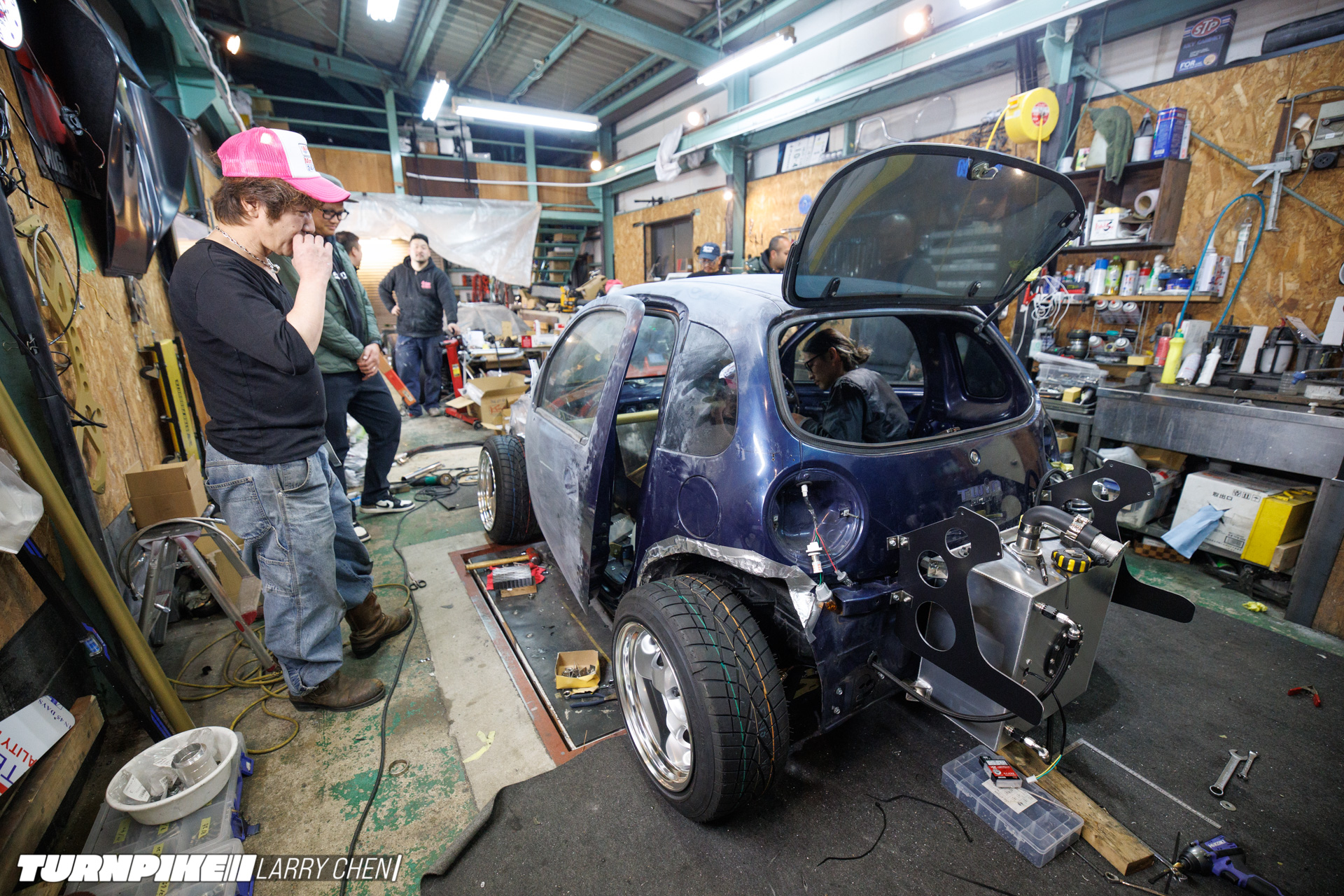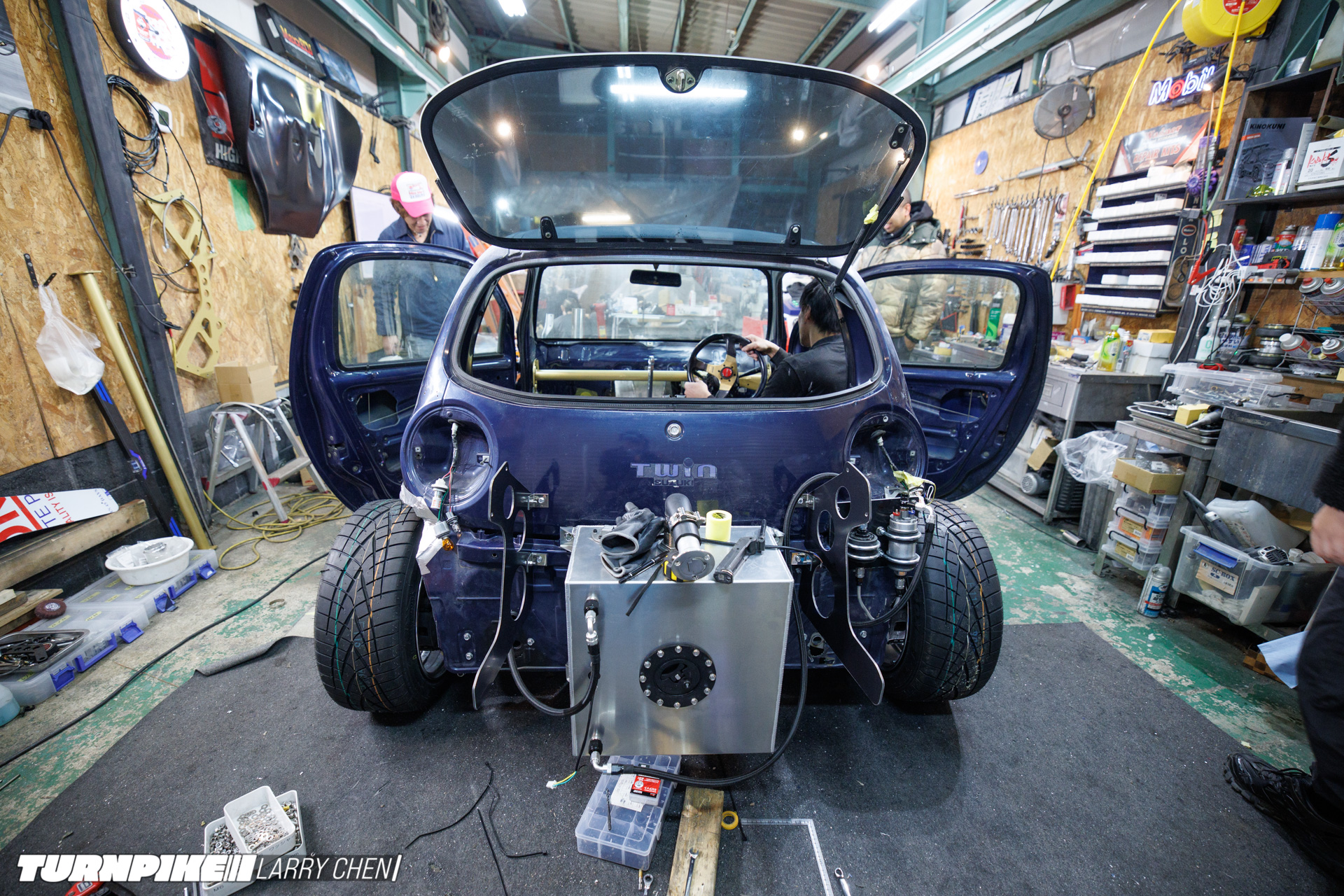 To accomplish this, Miura and his team swapped Suzuki’s original 44hp naturally aspirated K6A engine with a built Nissan SR20 making 400hp. Backing it up is a Nissan 5-speed manual gearbox and an R230 rear end. The result is surely one of the smallest drift cars ever created.