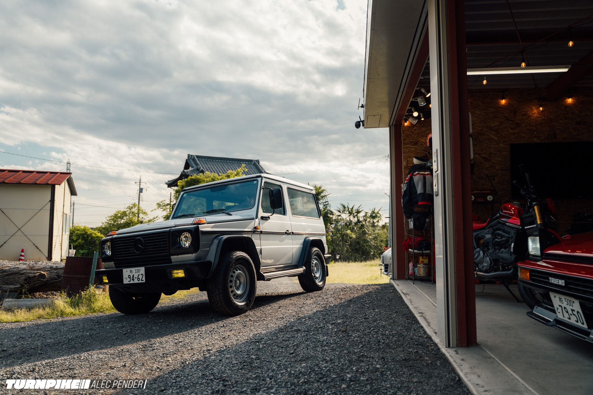 In the corner sits a Ducati Monster, another one of Shinji’s obsessions, parked between scale models and various bits of memorabilia. Outside is a collection of daily drivers including a Porsche Panamera and a pristine, short-wheelbase Mercedes G-Class.