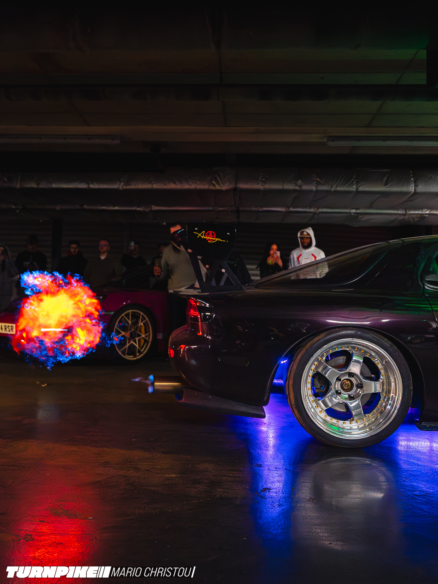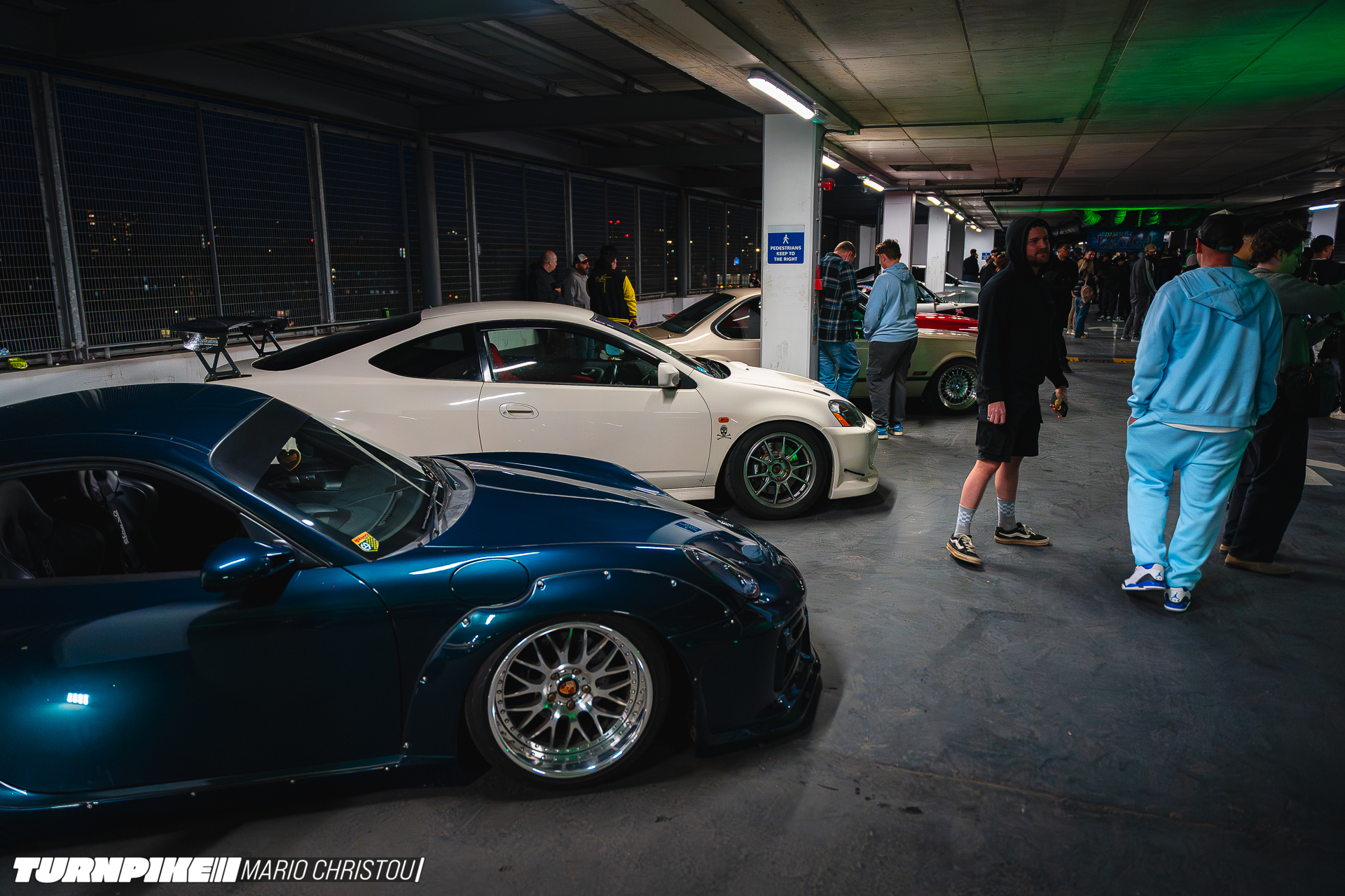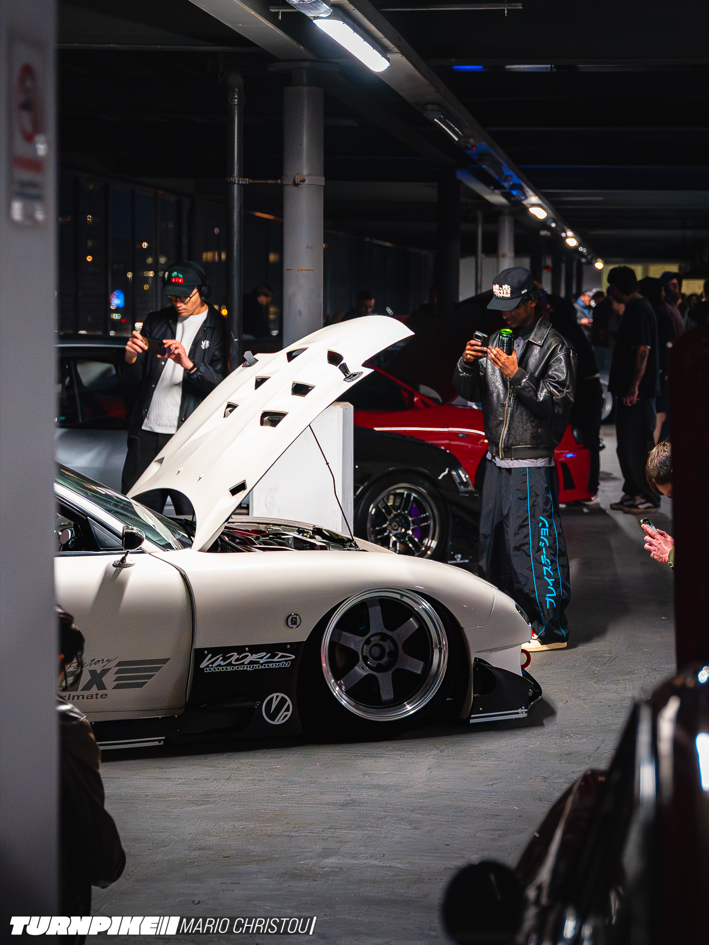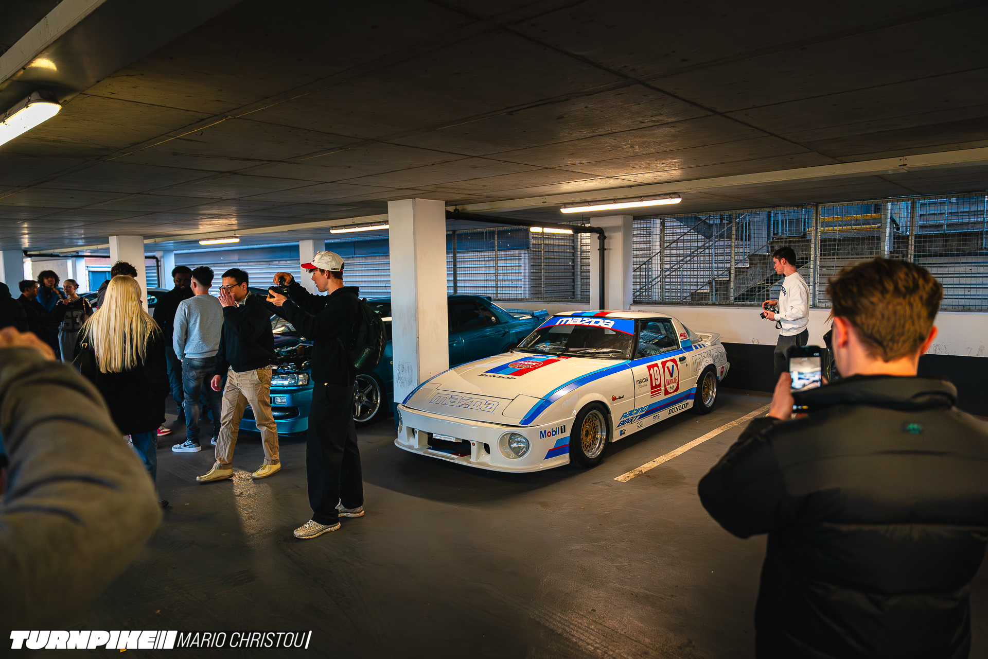 As is the way, roll-out time under the cover of darkness was the prime opportunity for the rowdiest cars – and owners – to let their right feet loose and shake the building with exhaust notes. Jake’s fire-spitting RX-7 drew in one last crowd before joining the queue spiralling down the exit ramp.