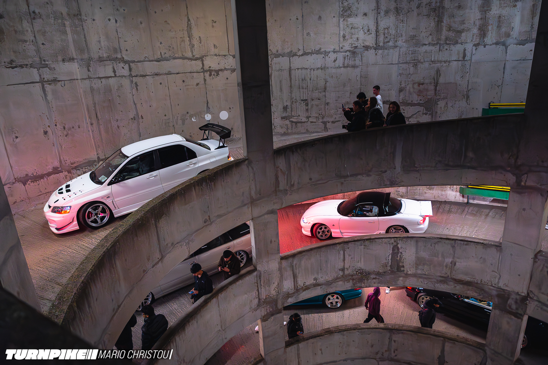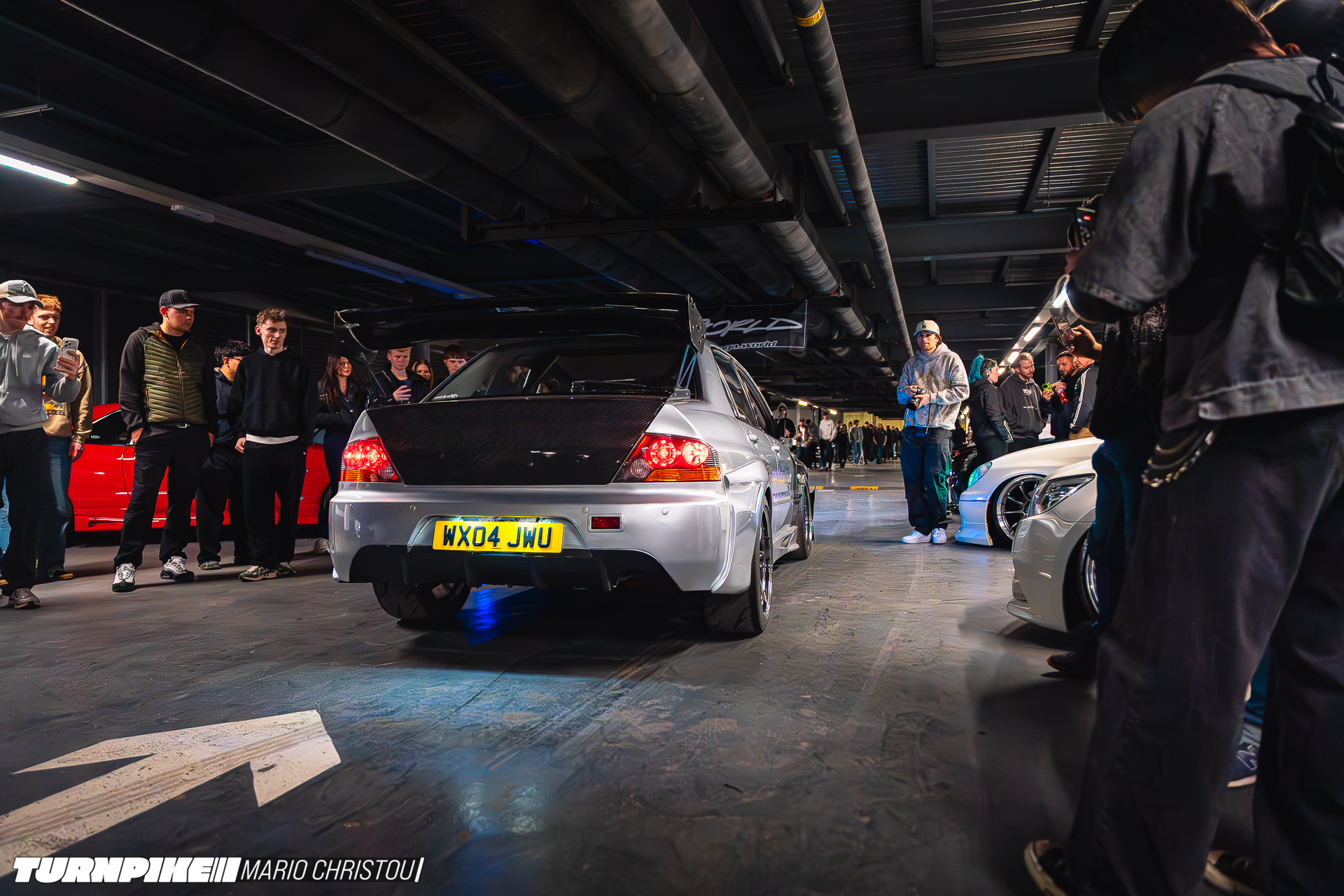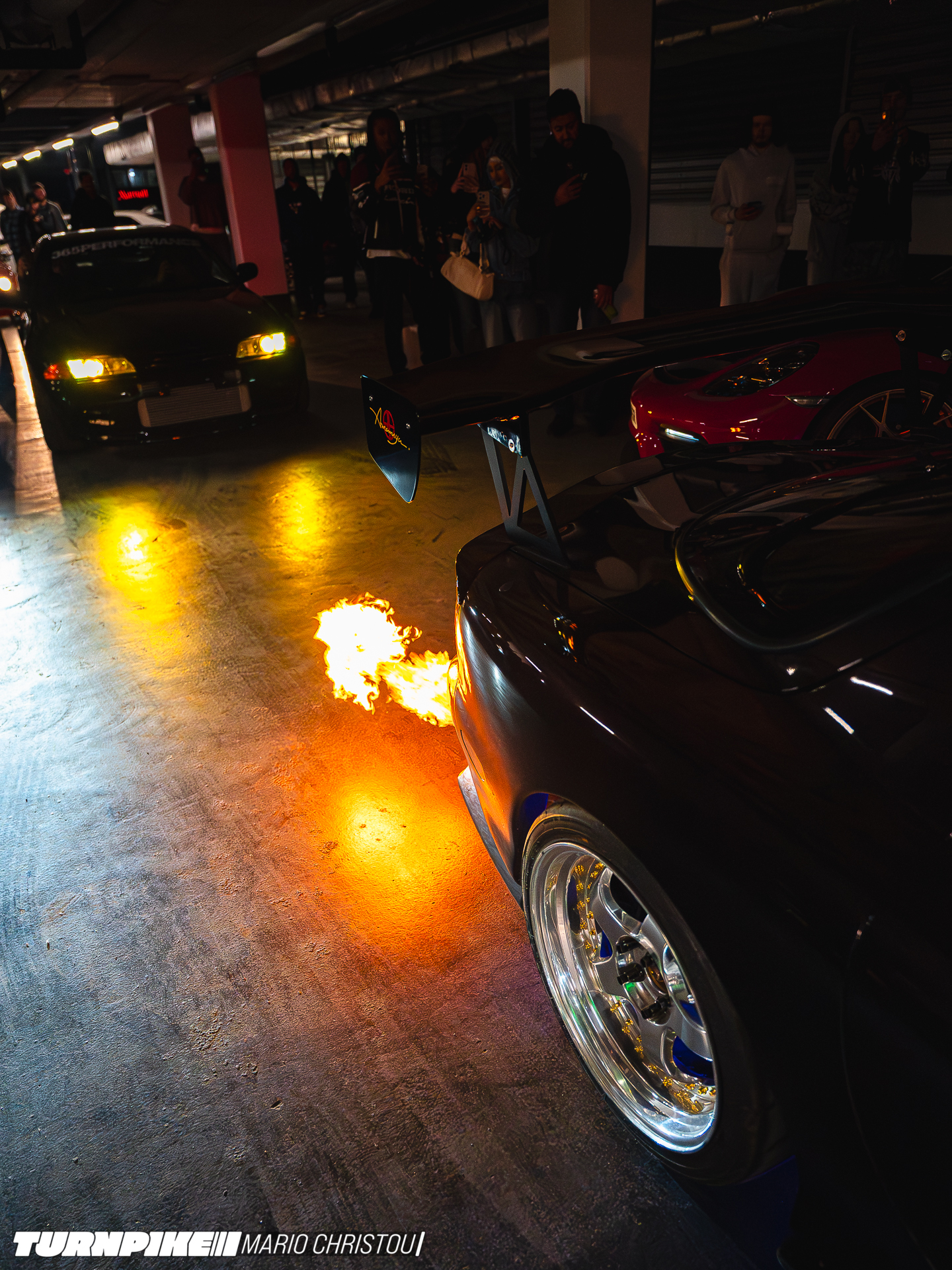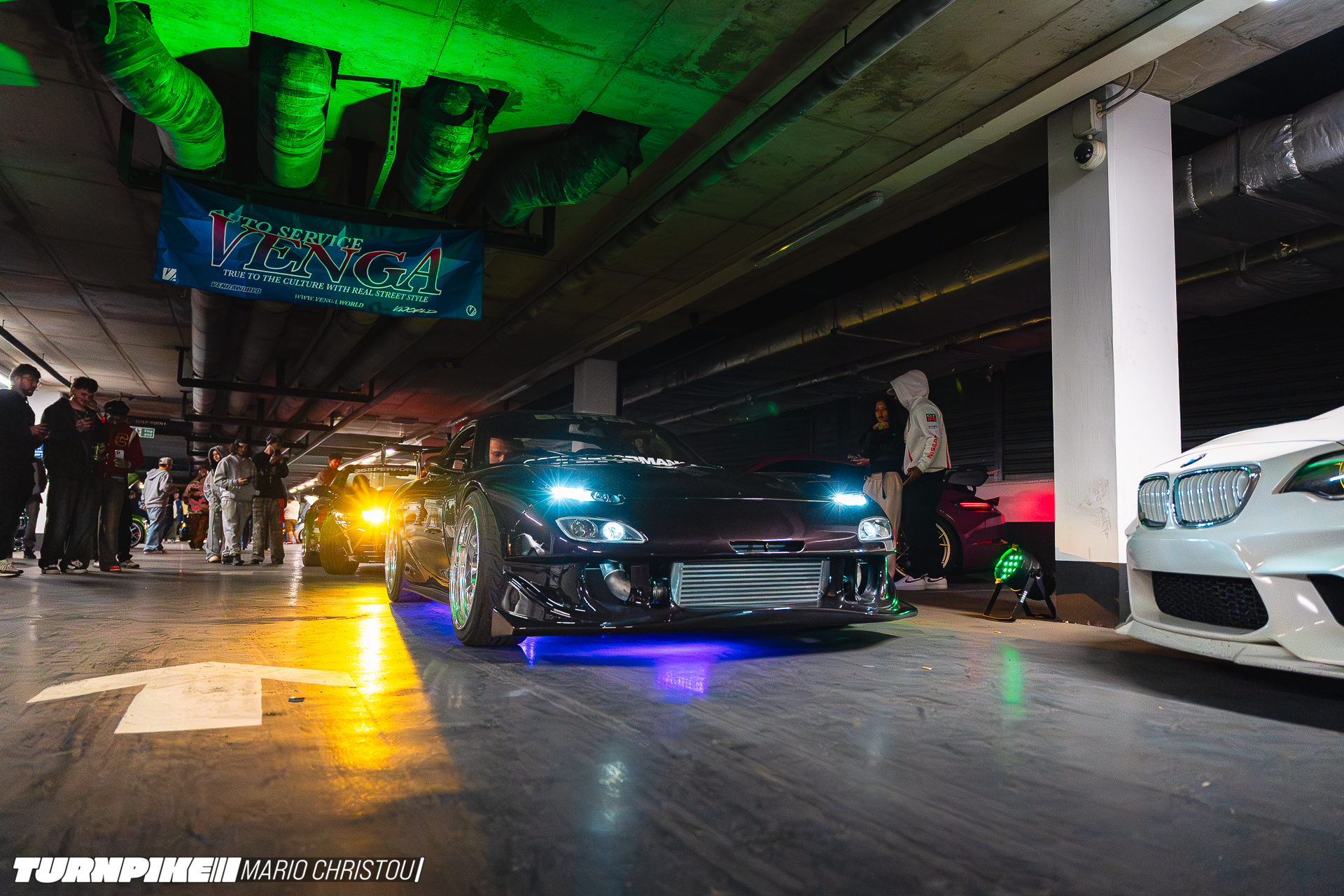 As is the way, roll-out time under the cover of darkness was the prime opportunity for the rowdiest cars – and owners – to let their right feet loose and shake the building with exhaust notes. Jake’s fire-spitting RX-7 drew in one last crowd before joining the queue spiralling down the exit ramp.