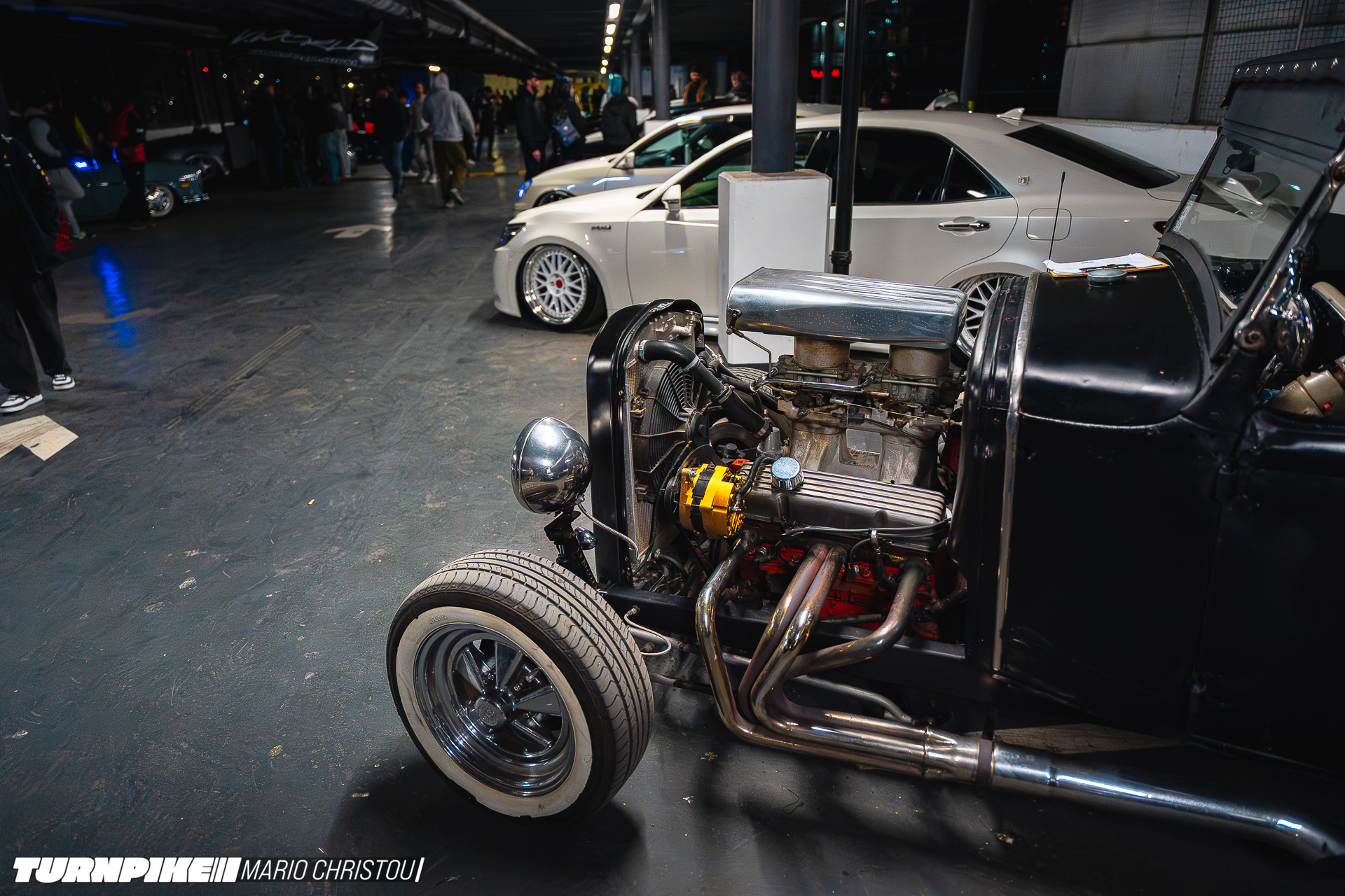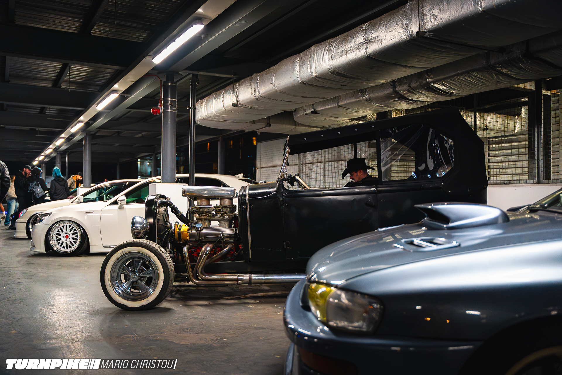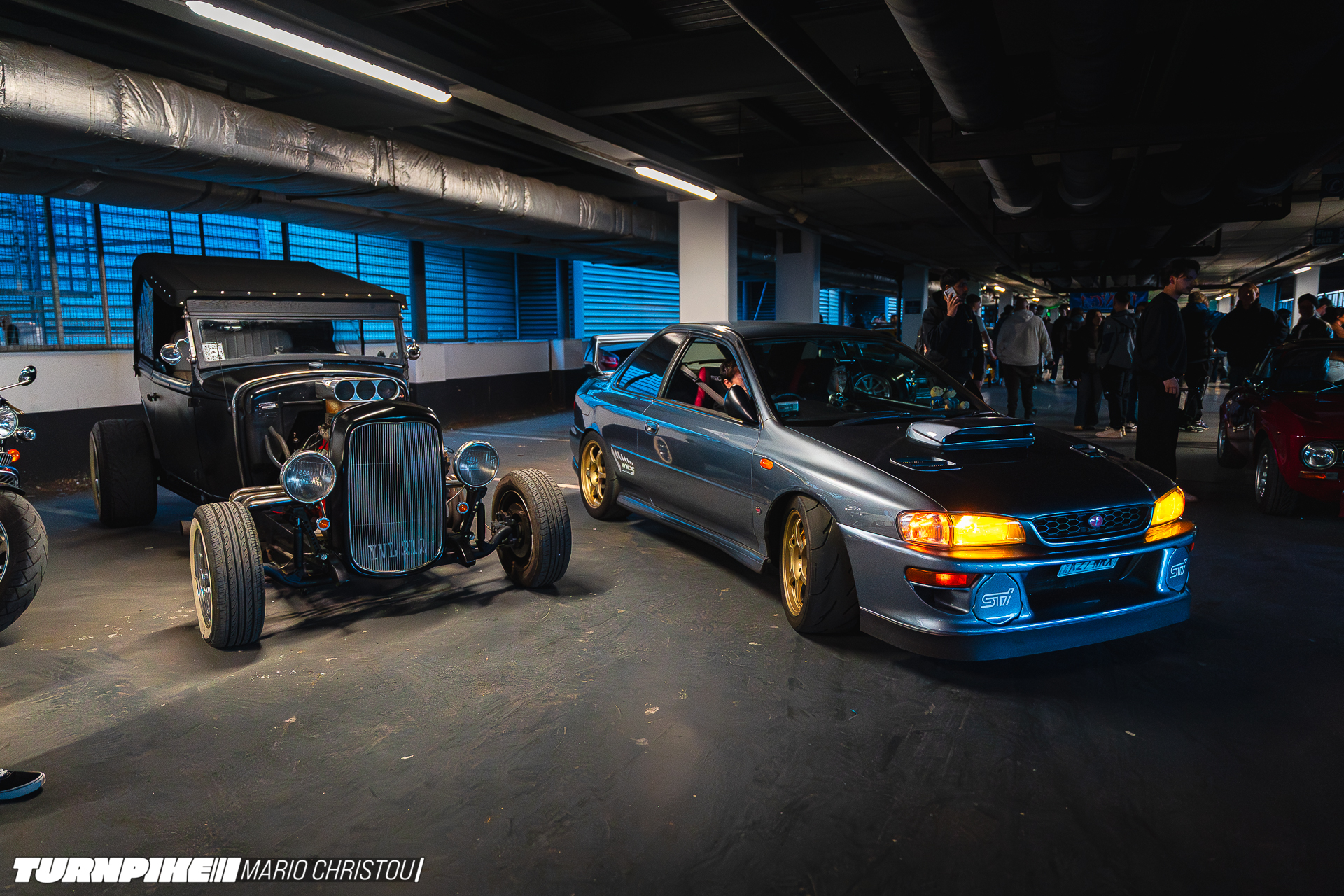 With the first cars rolling in before sunset, numbers quickly grew, and the range of metal working its way up the spiral ramp was insane. There aren’t many places where you’ll find a 1931 Ford Model A hot rod next to a last-of-the-line, 2001 GC8G Subaru Impreza WRX STI.
