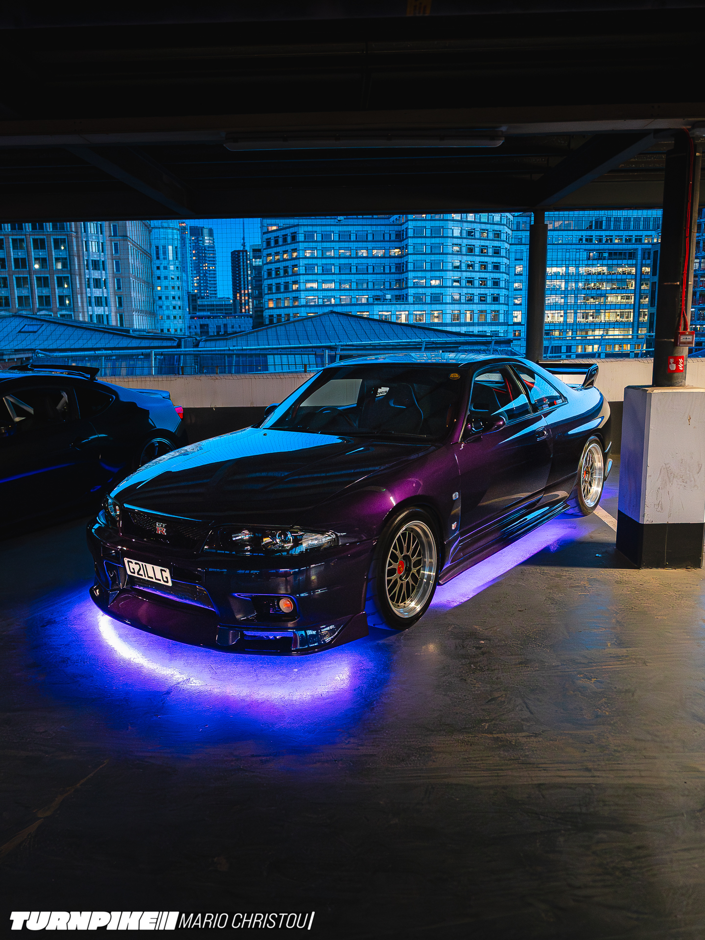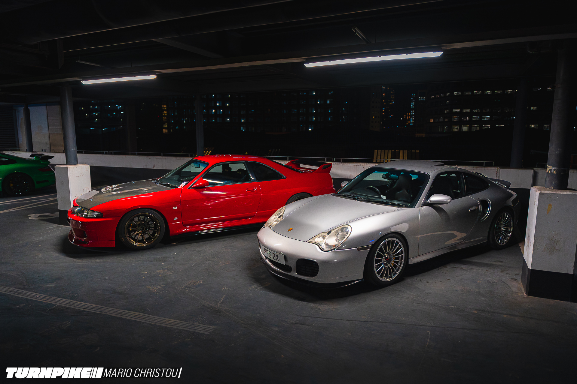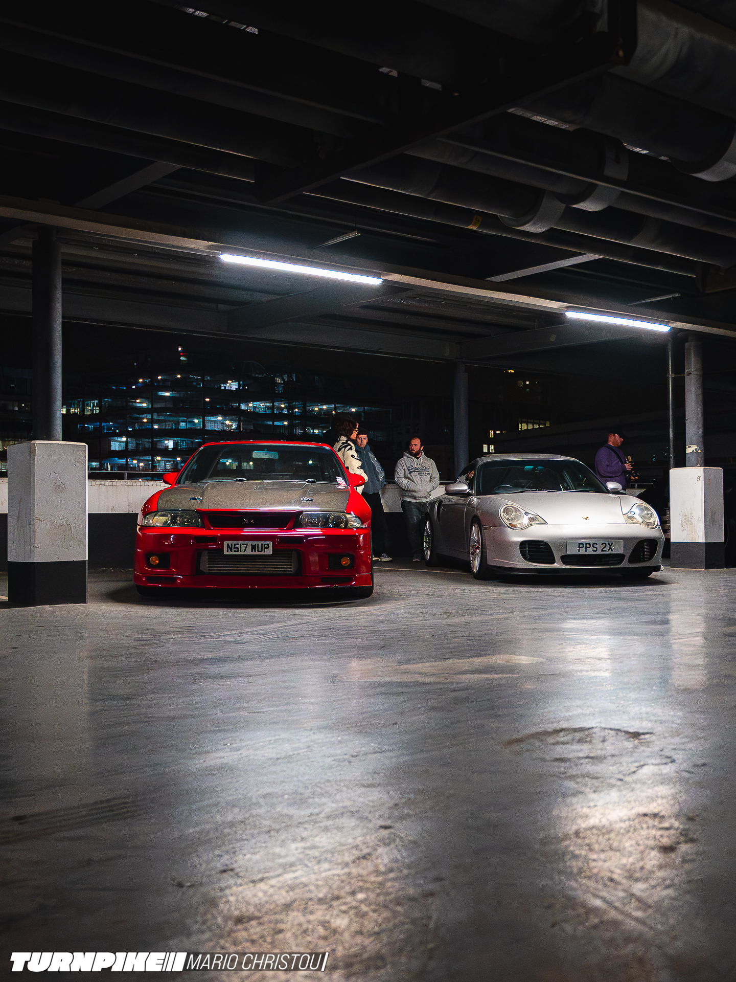 Parked next to the 996 was an aggressive R33 Nissan Skyline GT-R wearing a carbon fibre bonnet and race mirrors. Parked side by side with aggressive intercoolers poking out from behind their bumpers – CSF Race components in the Porsche’s case – this pair looked ready to battle it out on the Wangan. Or the A13, seeing as this is London.