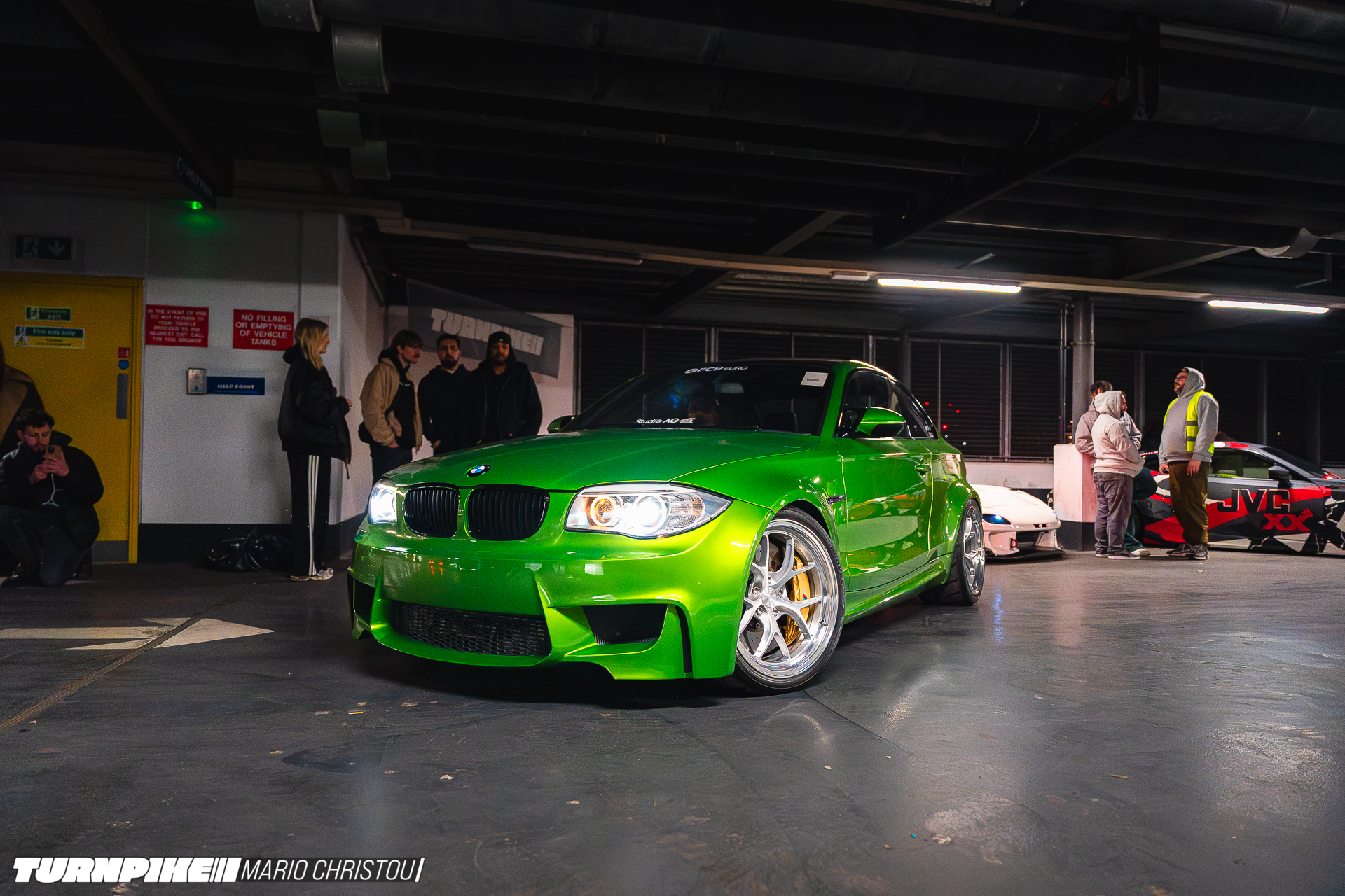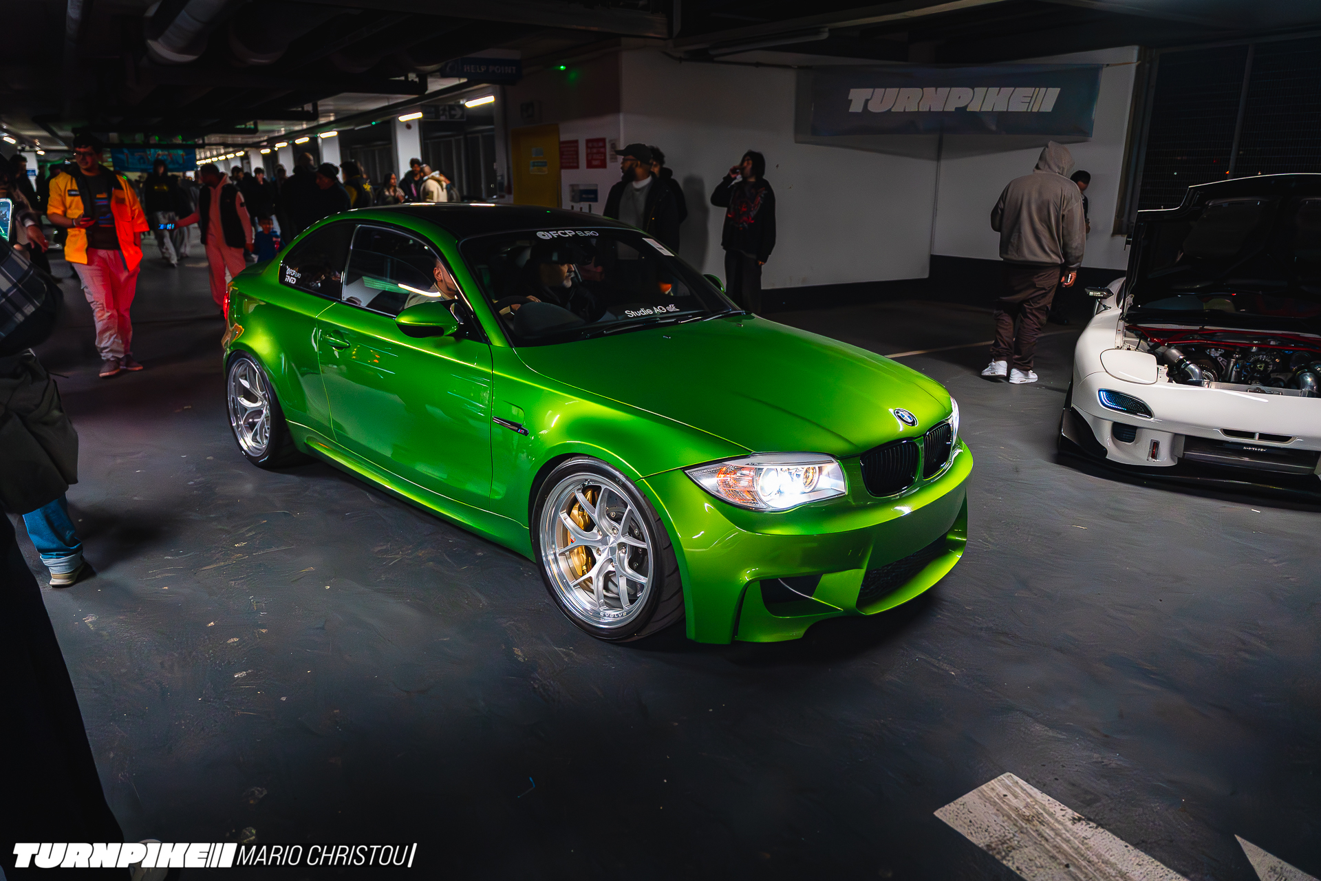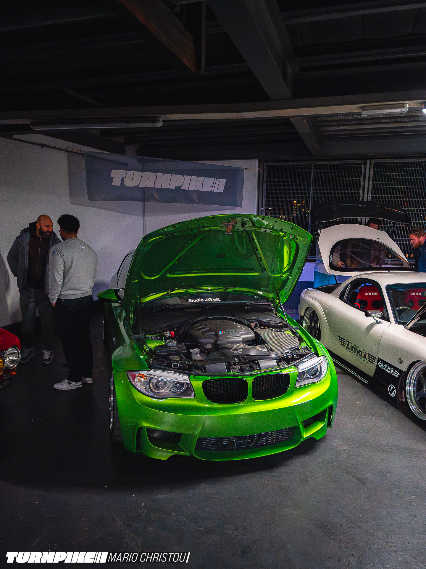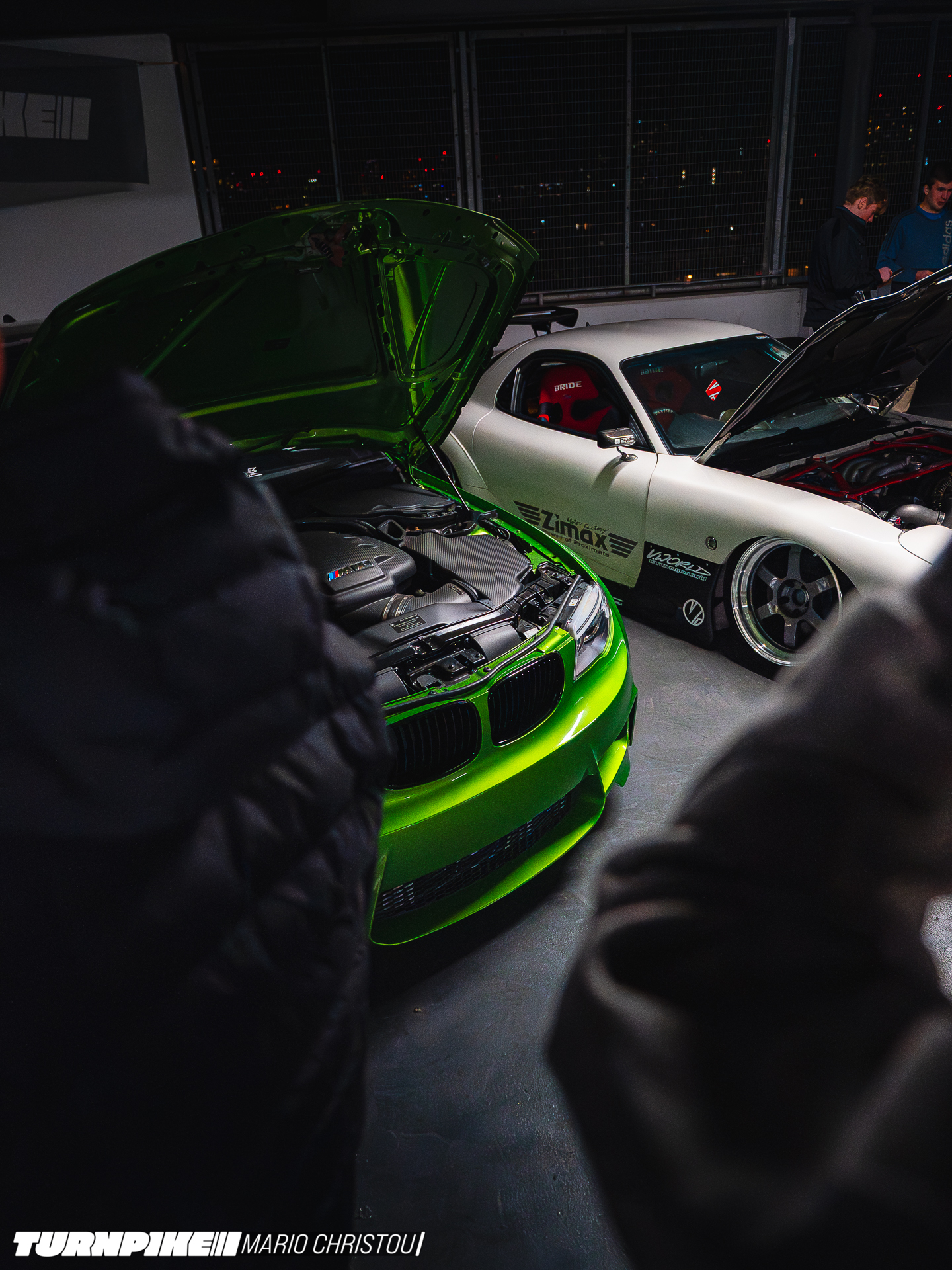 Fresh off its American tour, the Evolve-built P65 GT3 race-engine-equipped BMW 1M Coupé roared its way up to our spot on the top floor. Resplendent in Java Green paint reflecting the fluorescent lighting, the BMW stood out next to Craig’s Zimax FD3S Mazda RX-7 on RAYS Volk Racing TE37V wheels and Jas’s stunning 1975 Alfa Romeo 2000 GTV.