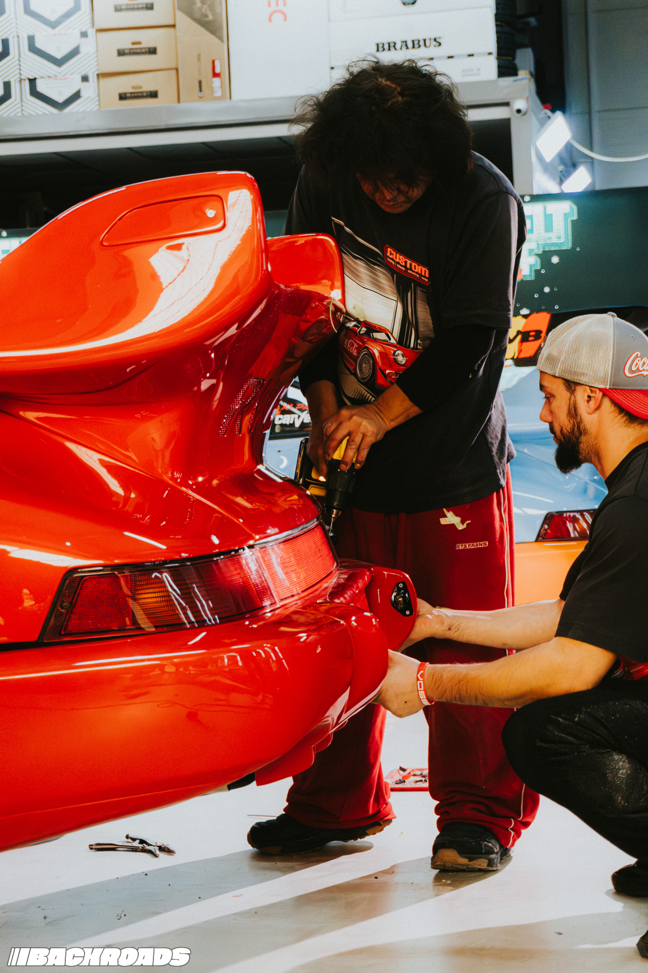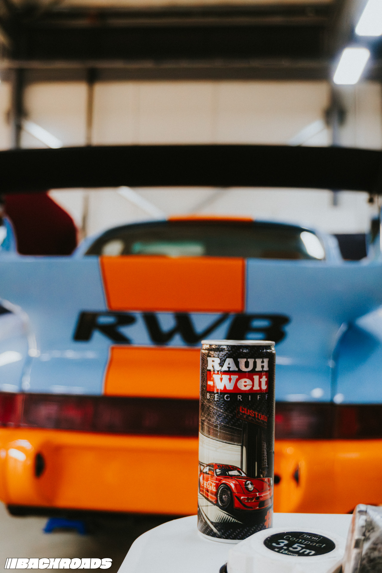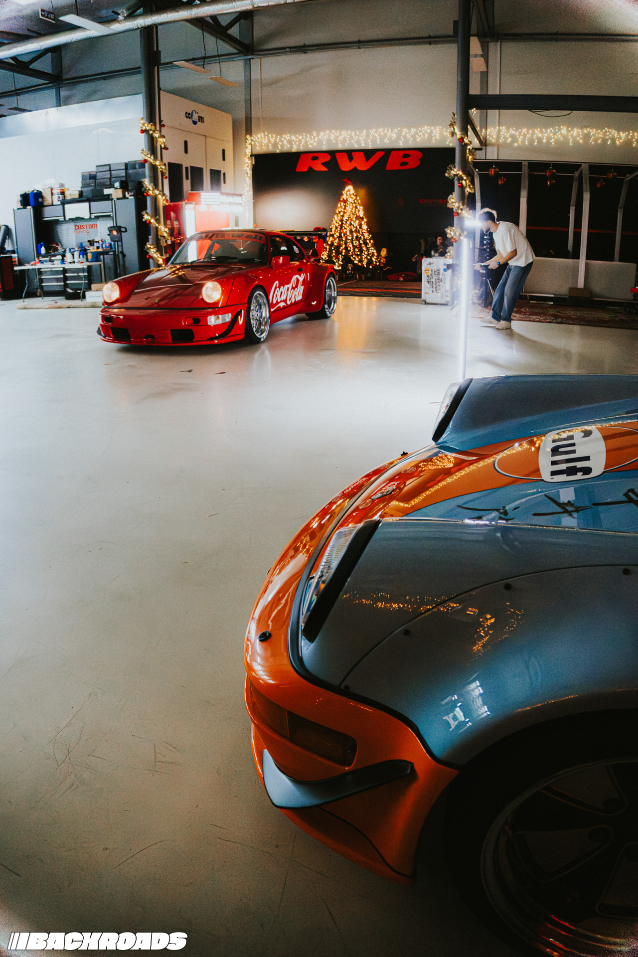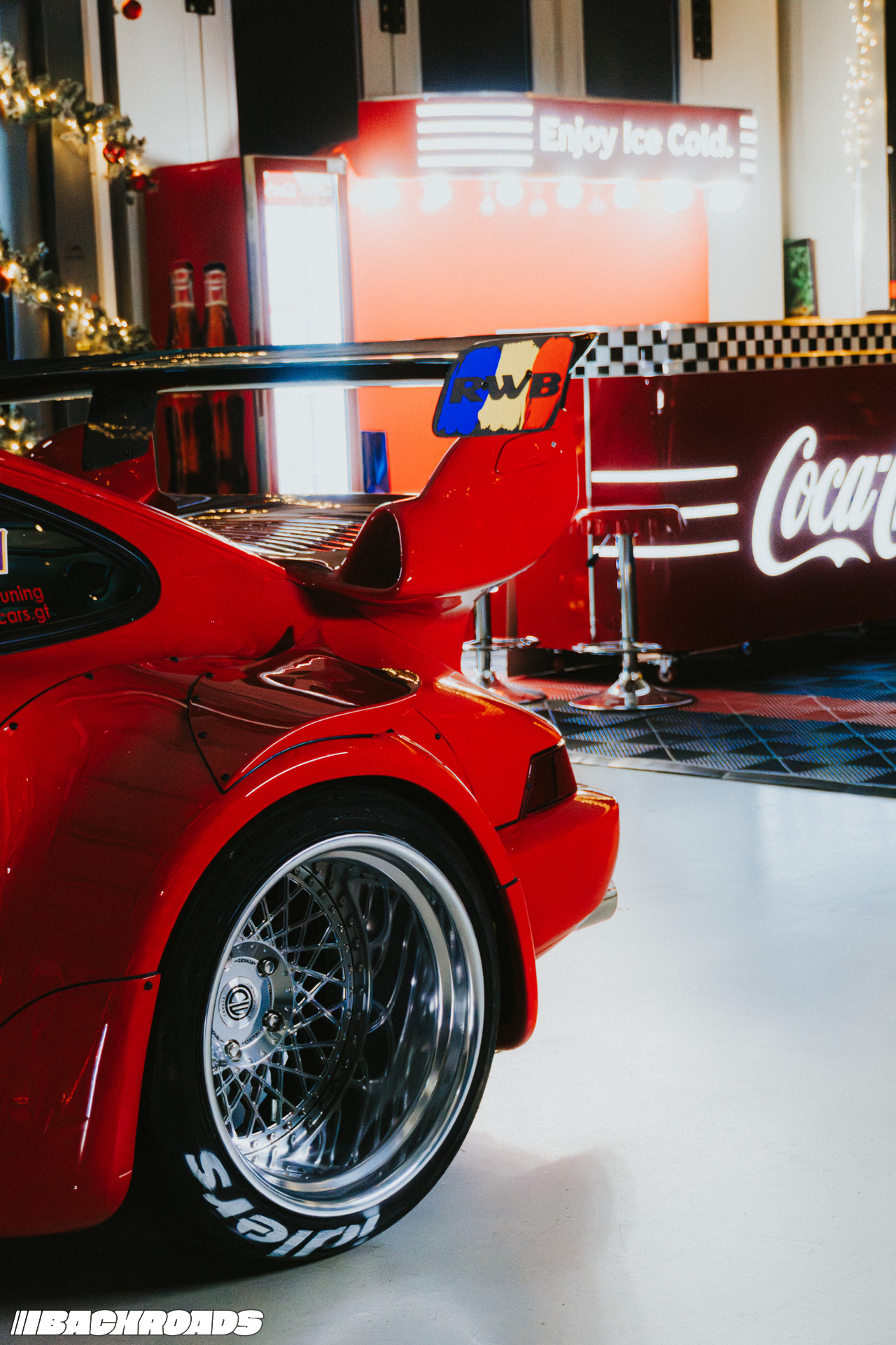 Over the course of four days, Nakai-san set out to build two 964 Carrera 4s, the first being the blue car with the Gulf-inspired livery. The second had a Coca-Cola theme. Both cars featured the RWB decklid and wing, but only the red one received rear fender wings.