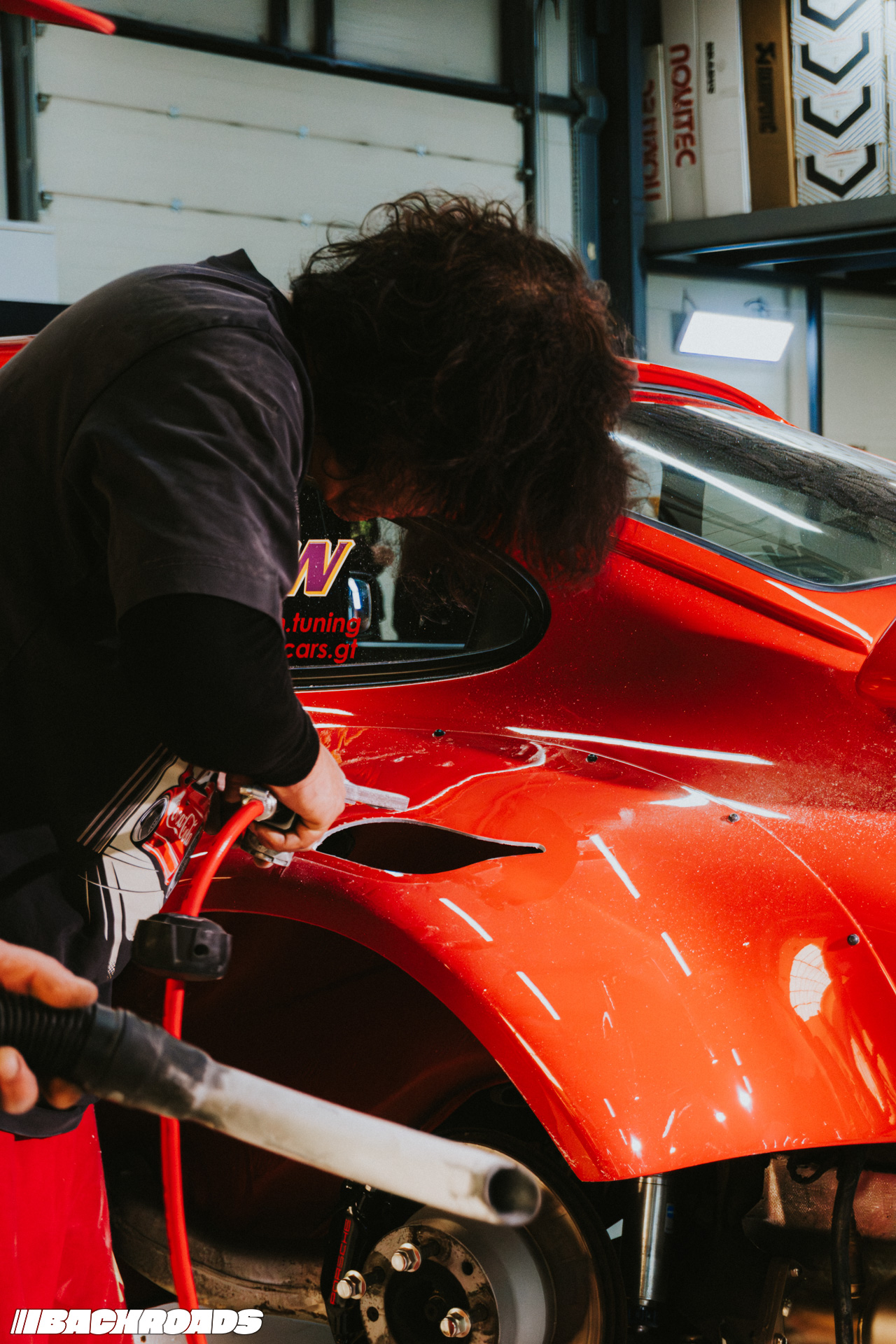 The transformation process began with the bumpers and then moved onto the fenders, which, unlike the 993 GT2 components they’re inspired by, flow together in what I consider a positive design upgrade. Despite what some people think, Nakai-san takes countless measurements along the way, ensuring everything is aligned and the fit is perfect before he cuts. With new wheels and tires a prerequisite for the RWB widebody upgrade, he also pays special attention to the suspension geometry and ride height.
