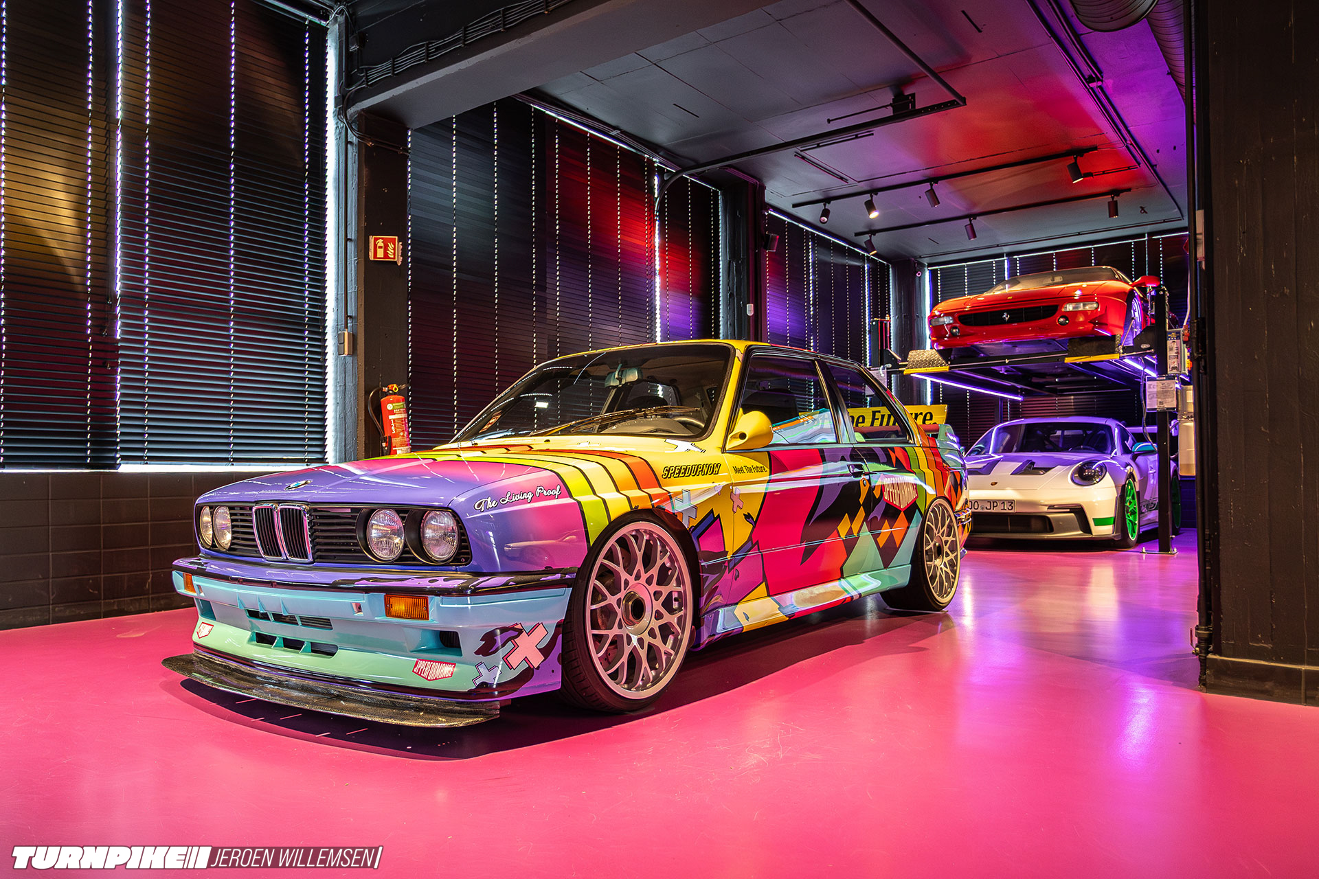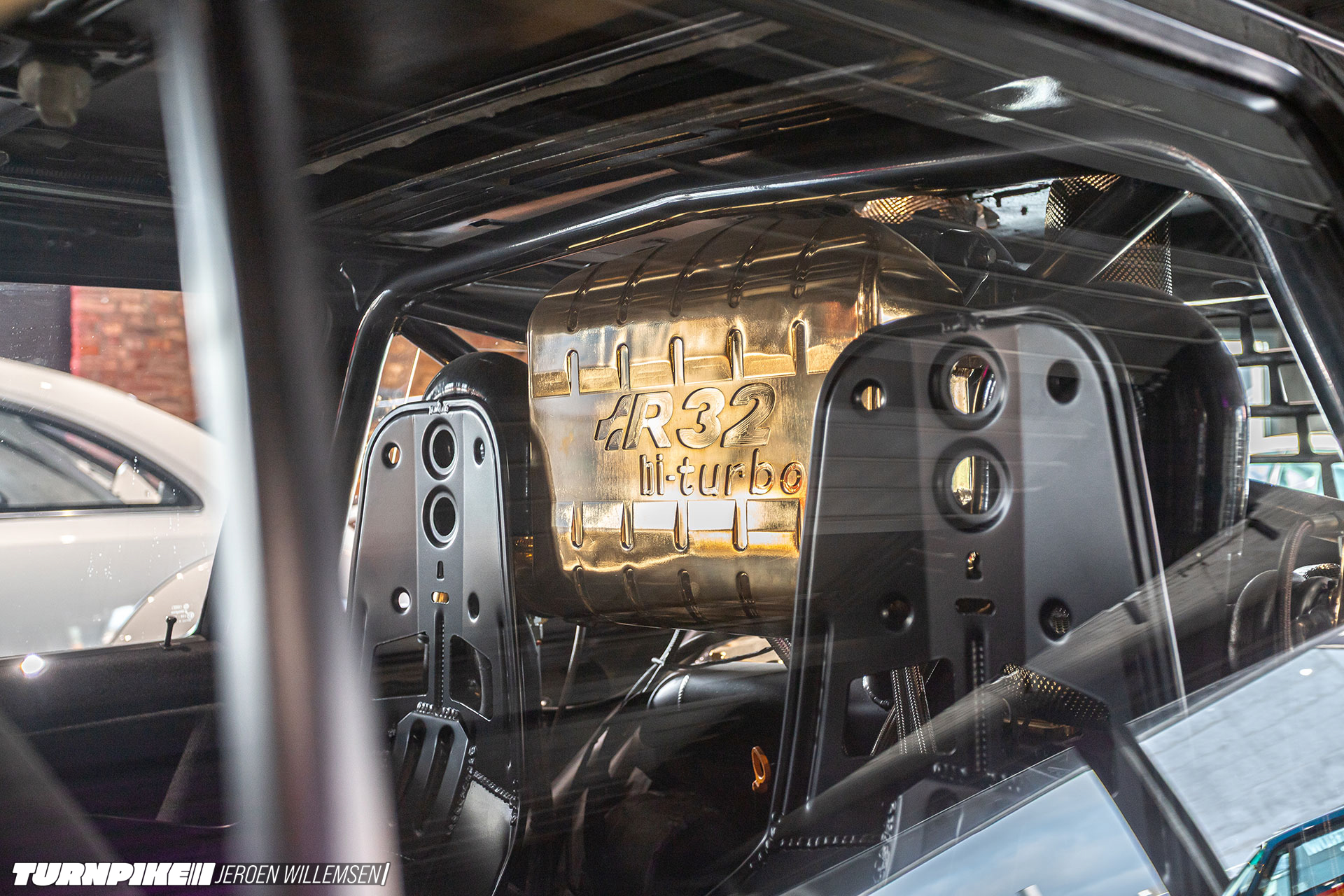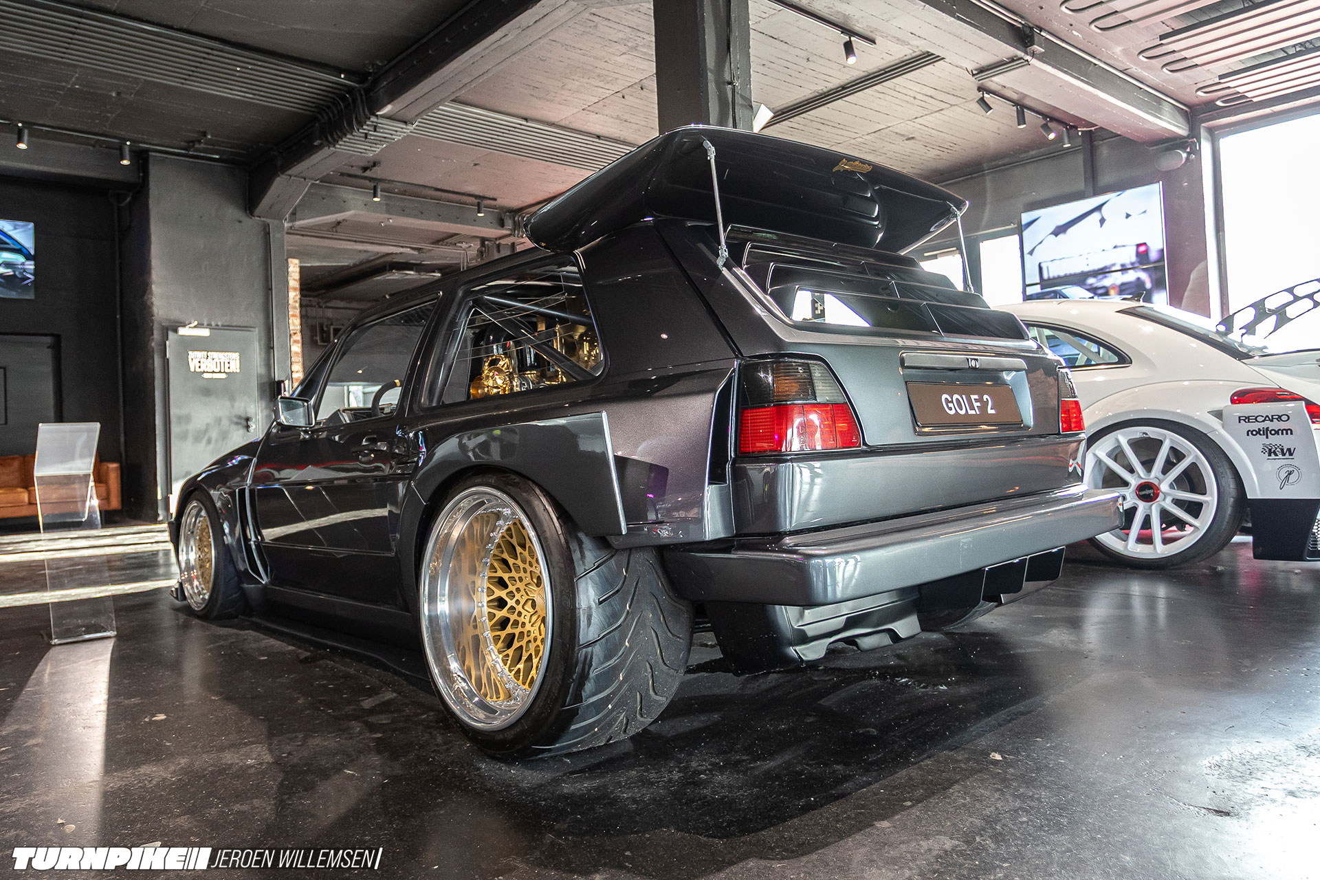 On the main floor and in the cellar, you’ll find more of JP’s personal collection, including a BMW E30 M3 that looks externally stock, except for the wrap, but hides the entire drivetrain, interior, and engine of an M4 F82. Behind the BMW was a car lift holding a Porsche GT3 RS with the tribute to Carrera RS Package and a Ferrari F355. If that wasn’t enough already, there was a casually parked Nissan Skyline R32 GT‑R. Downstairs, you’ll find cars from other companies and private owners, like the Stahlwerkz E36 and the lowest Golf I’ve ever seen. But I won’t spoil everything that is there.