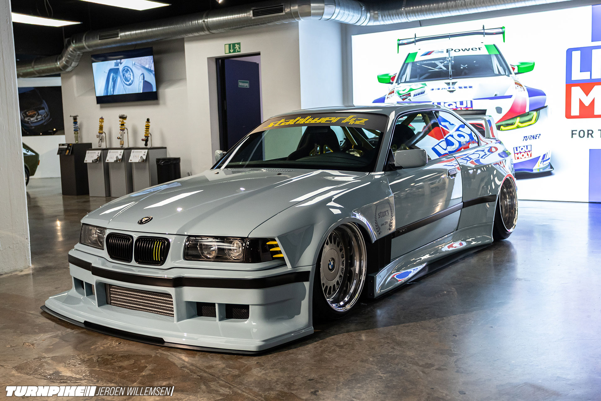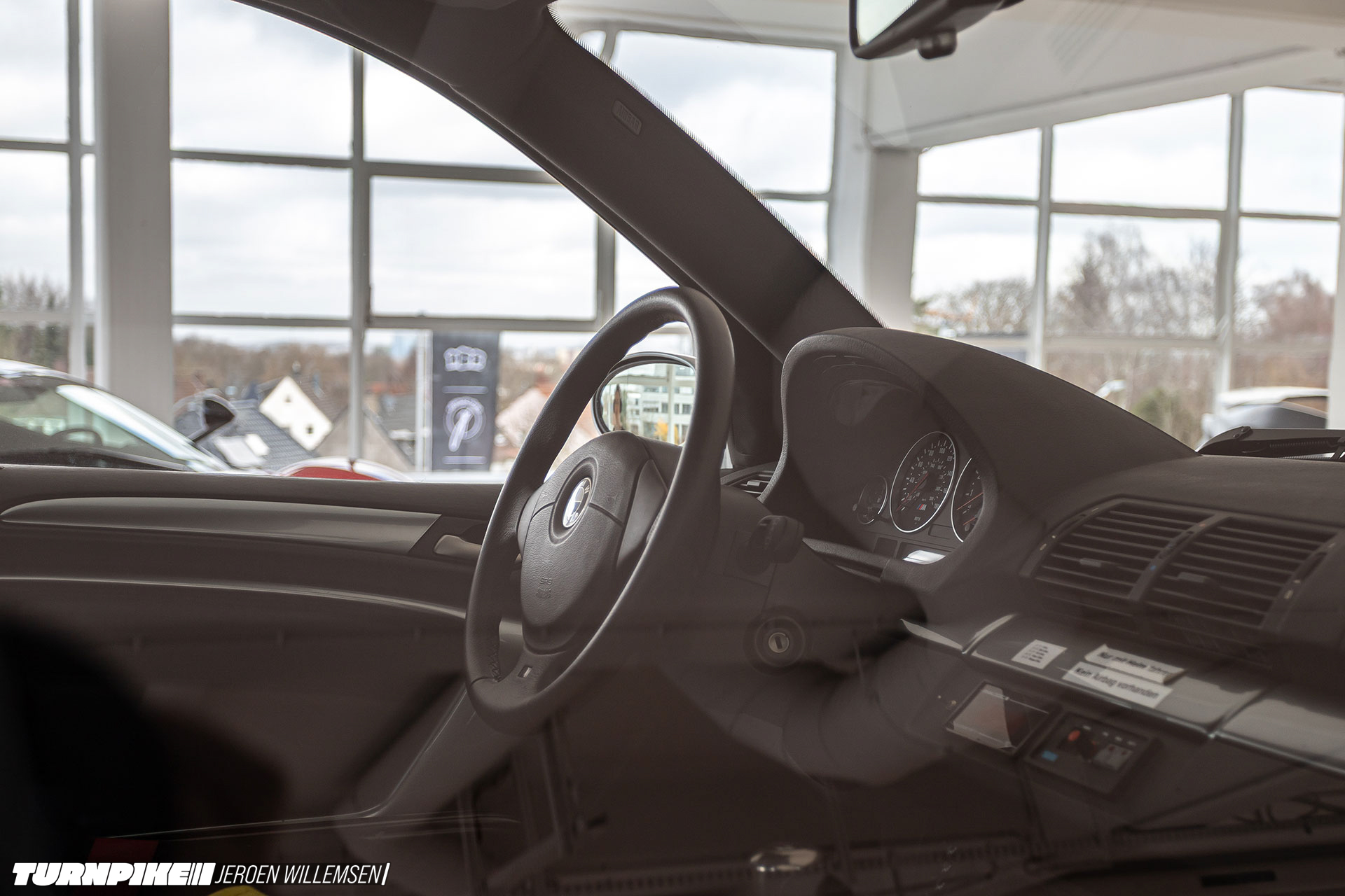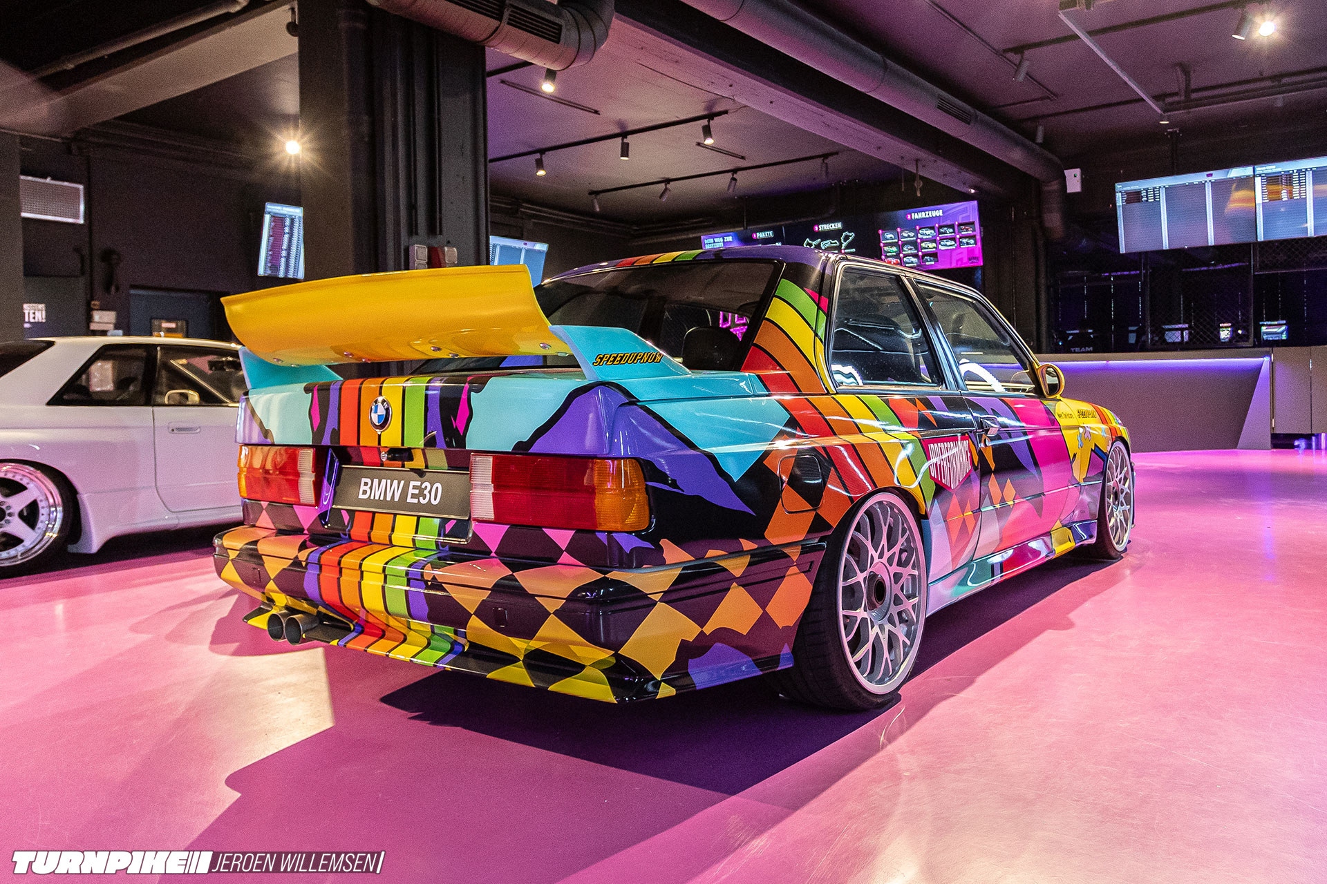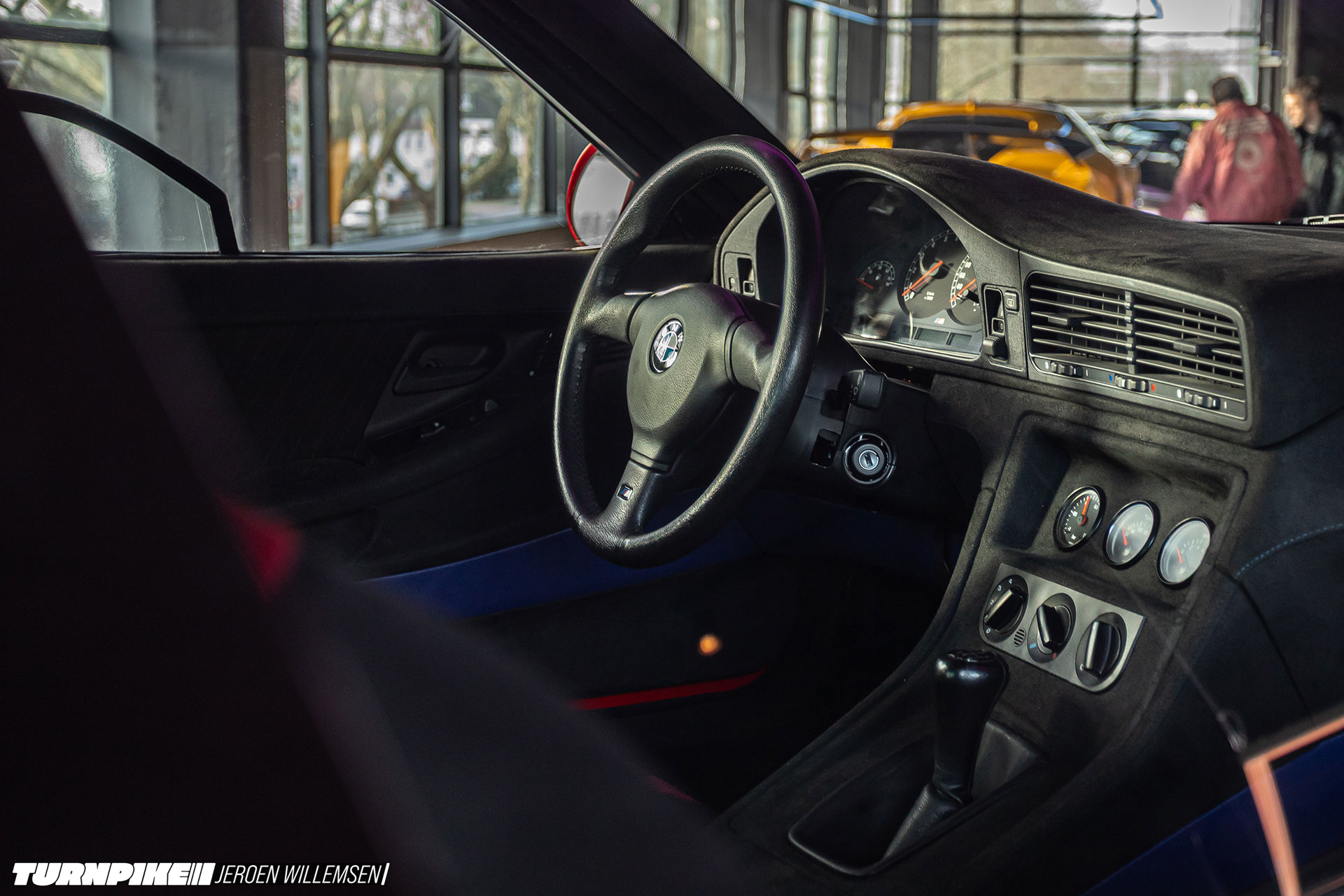 On the main floor and in the cellar, you’ll find more of JP’s personal collection, including a BMW E30 M3 that looks externally stock, except for the wrap, but hides the entire drivetrain, interior, and engine of an M4 F82. Behind the BMW was a car lift holding a Porsche GT3 RS with the tribute to Carrera RS Package and a Ferrari F355. If that wasn’t enough already, there was a casually parked Nissan Skyline R32 GT‑R. Downstairs, you’ll find cars from other companies and private owners, like the Stahlwerkz E36 and the lowest Golf I’ve ever seen. But I won’t spoil everything that is there.