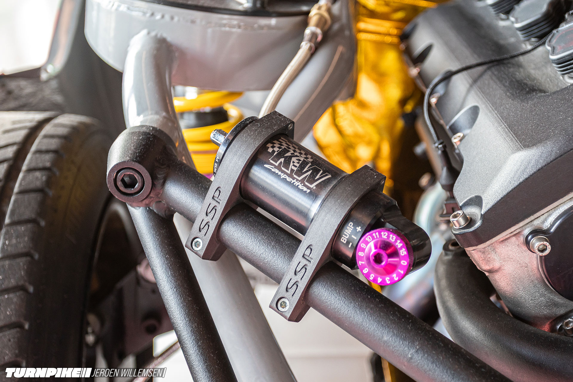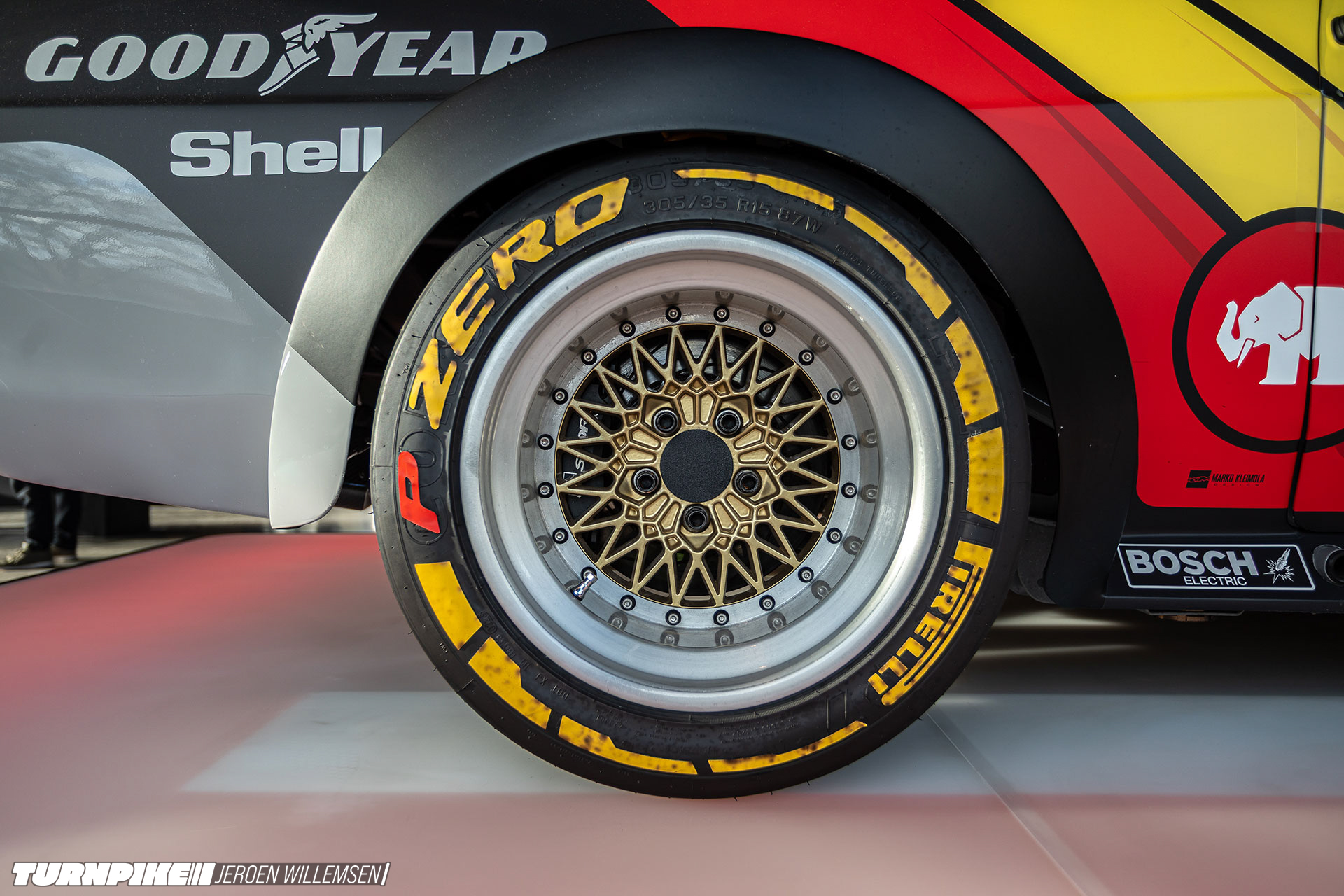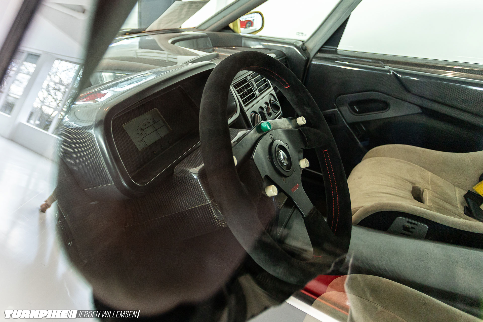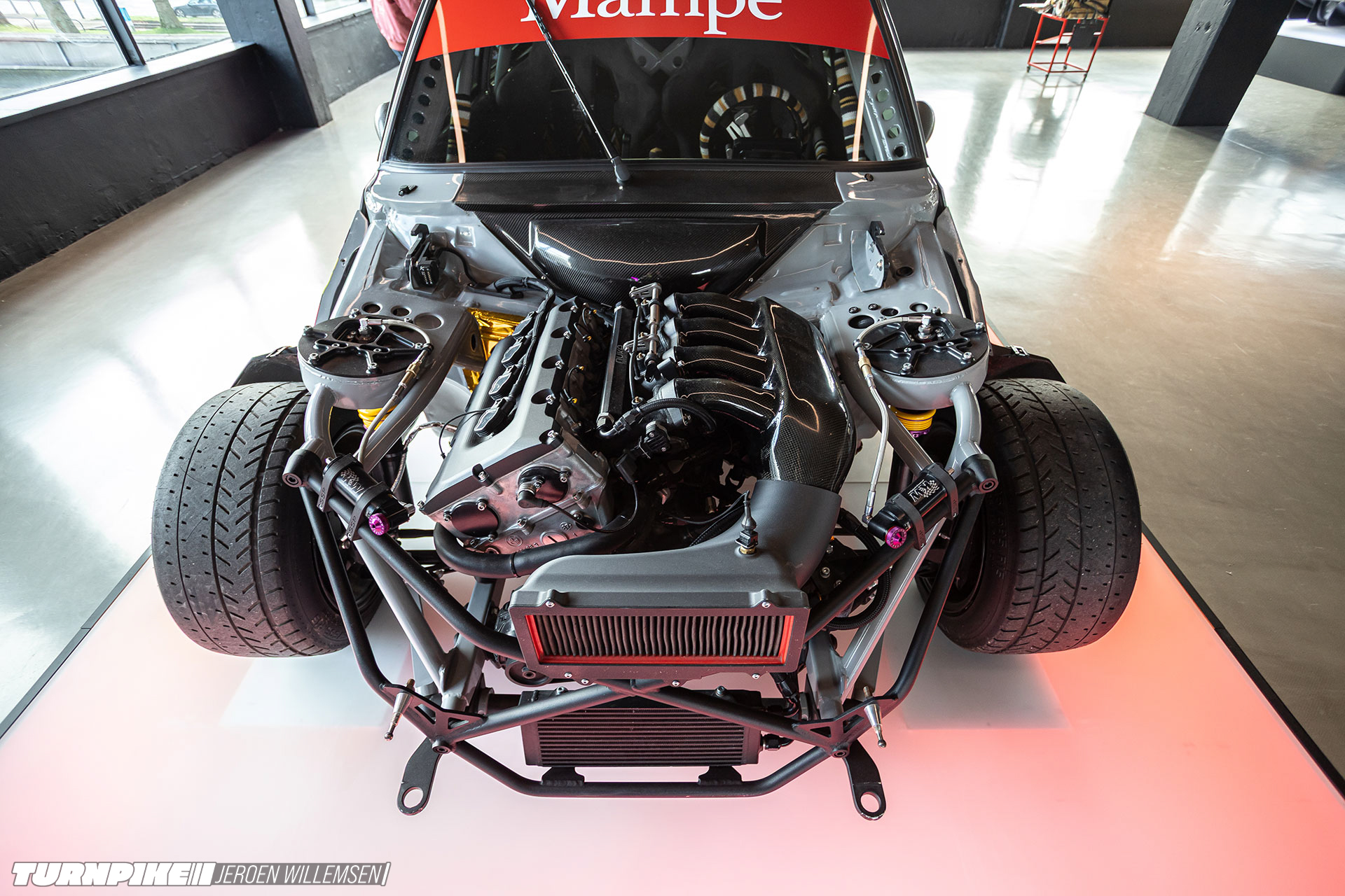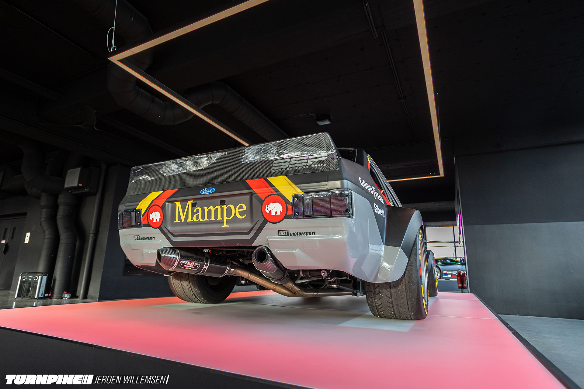 One floor down at the PACE Museum has a totally different feel. Instead of white, this level is finished in black, though the cars were just as wild. First up: a Ford Escort that was registered in 1979 in Finland, originally powered by a paltry 1.3‑litre engine. The current setup produces 300hp and 320Nm of torque. The original engine is long gone; instead, you will find a 2.5‑litre S14B25 from a BMW E30 M3. But the madness doesn’t stop there. It has dry‑sump lubrication, twin Yoshimura Suzuki Hayabusa motorcycle silencers, magnesium wheels, a straight‑cut dogbox, and a Volvo 740 rear axle, just for good measure.